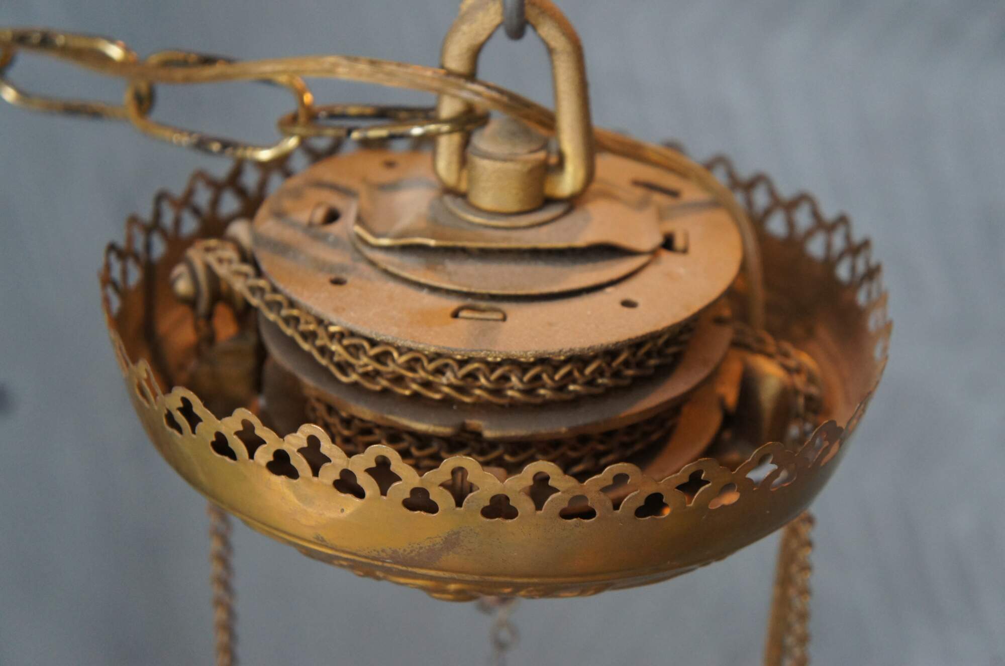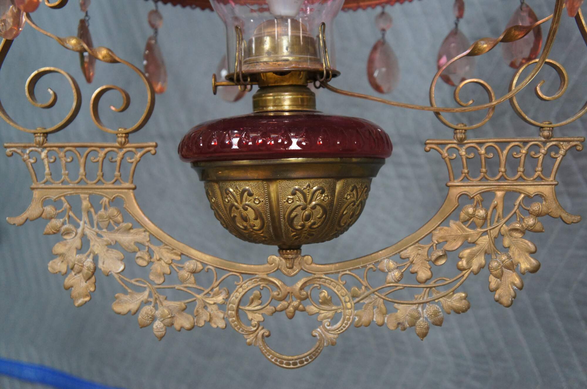 Late 19th century Antique Victorian parlor / pendant light. Oil lamp converted to electric. Intricate brass frame embellished with floral patterns, scrollwork, and a swag of oak leaves and acorns. Deep pink cranberry glass oil reservoir with tear drop deatils, hobnailed shade, and fluted blossom shaped smoke bell. Pink drop crystals hang from the ceiling medallion and around the edge of the shade. Includes clear glass hurricane with beaded top. Plug In.