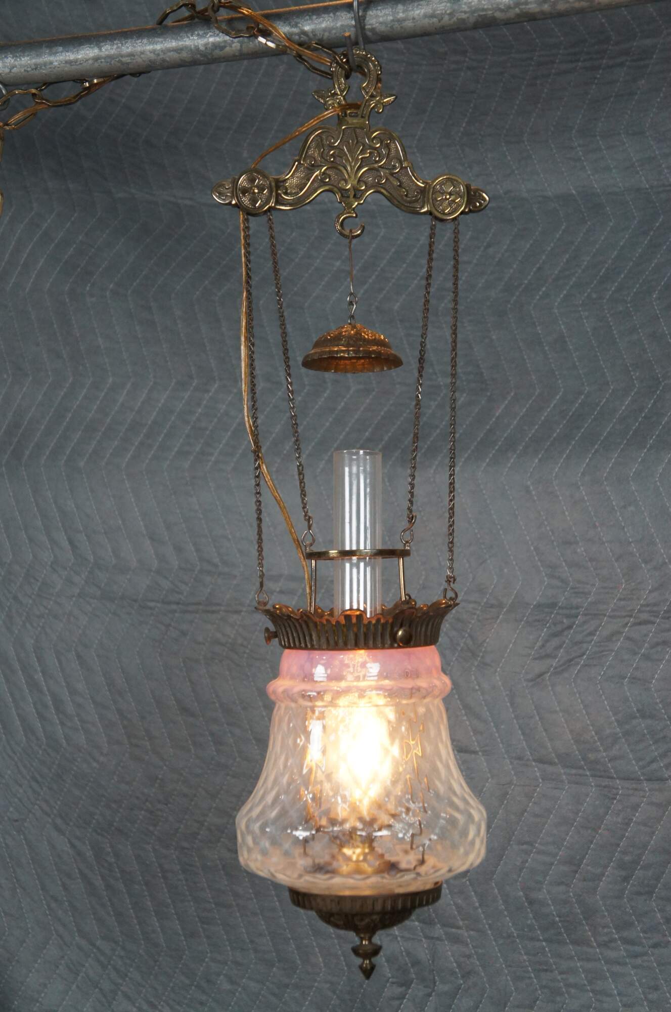 Late 19th century converted oil swag hurricane pendant light / chandelier. Repousse brass base with finial and matching smoke bell; pineapple shaped opalescent glass shade with cranberry blush at top and rim of brass leaves. Suspends from floral ceiling hook with two chains that can be pulled down or retracted up via concealed pulleys to access the oil reservoir / bulb socket while the shade remains in place. Plug in.