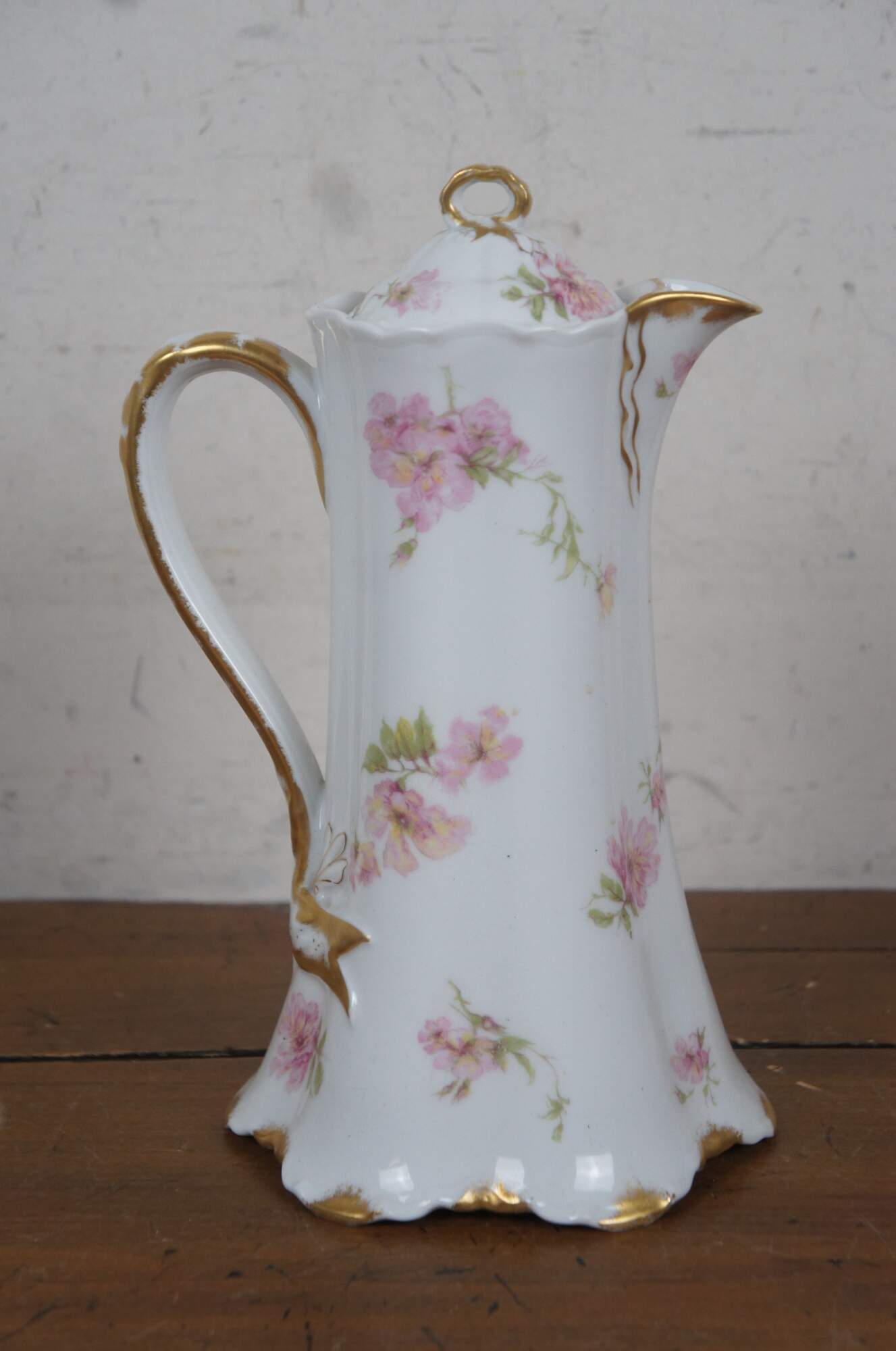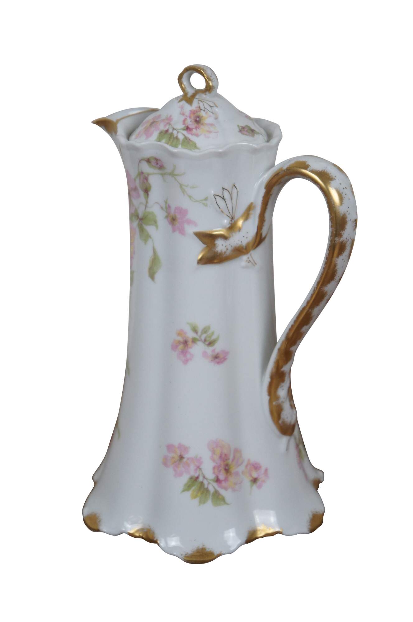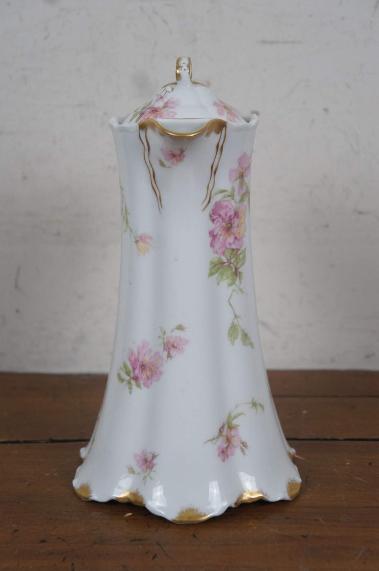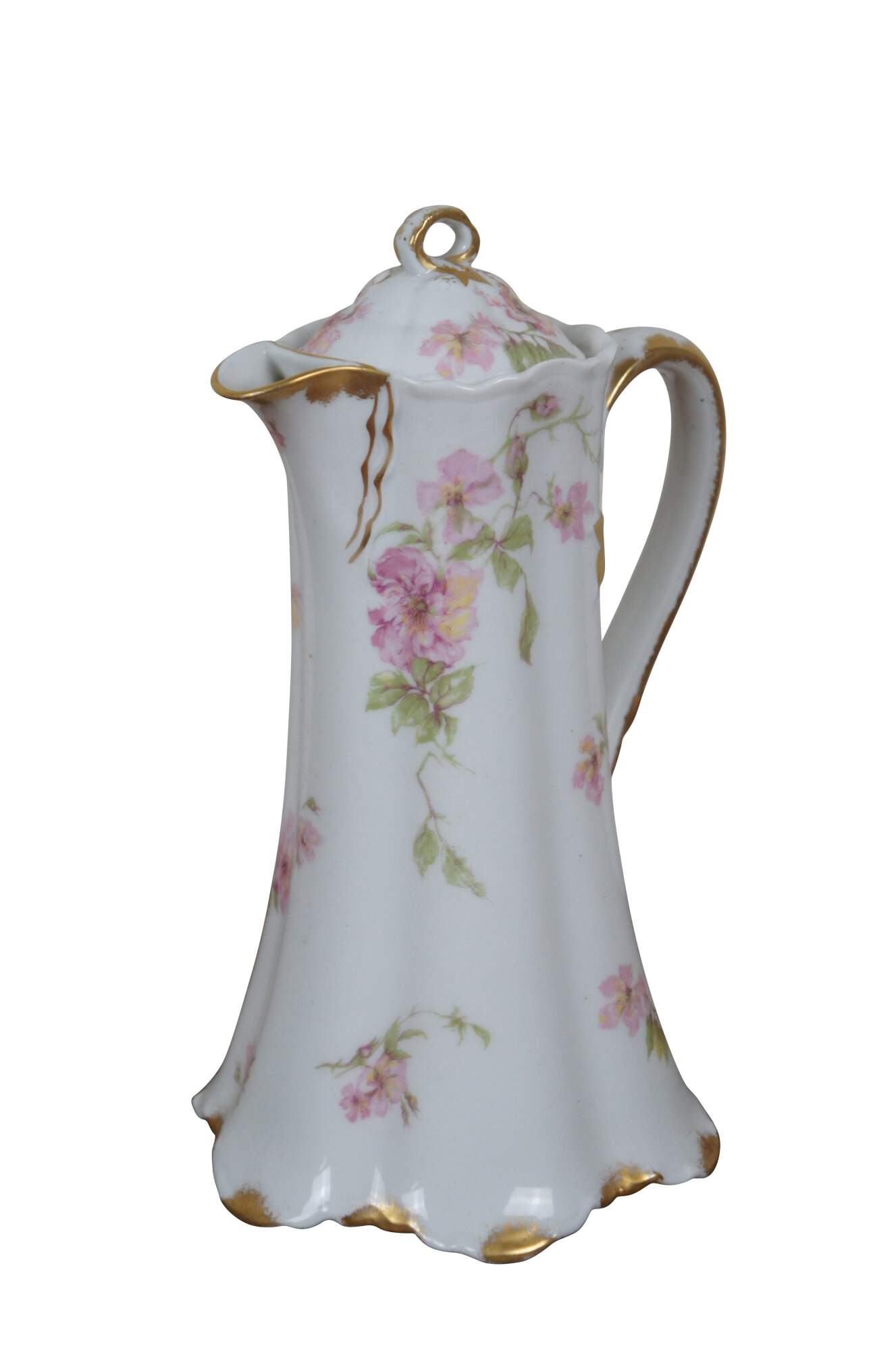 Early 20th century large Haviland & Co Limoges porcelain chocolate / tea pot. Tall with scalloped base and upper edge, ribbon shaped handle, hand painted with springs of pink roses and gilded details.