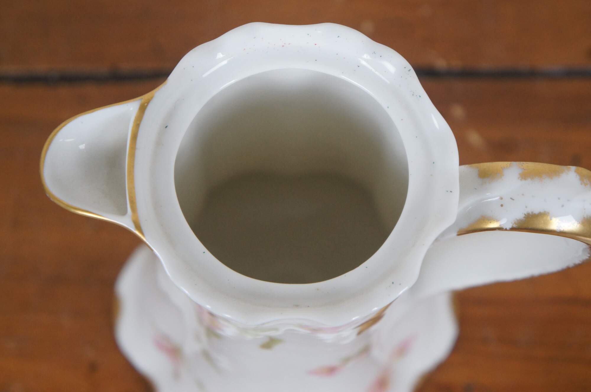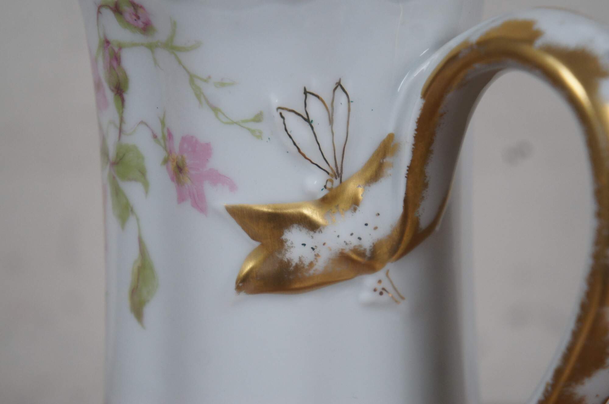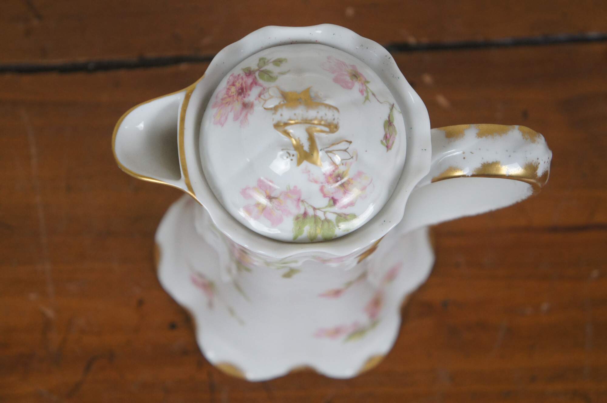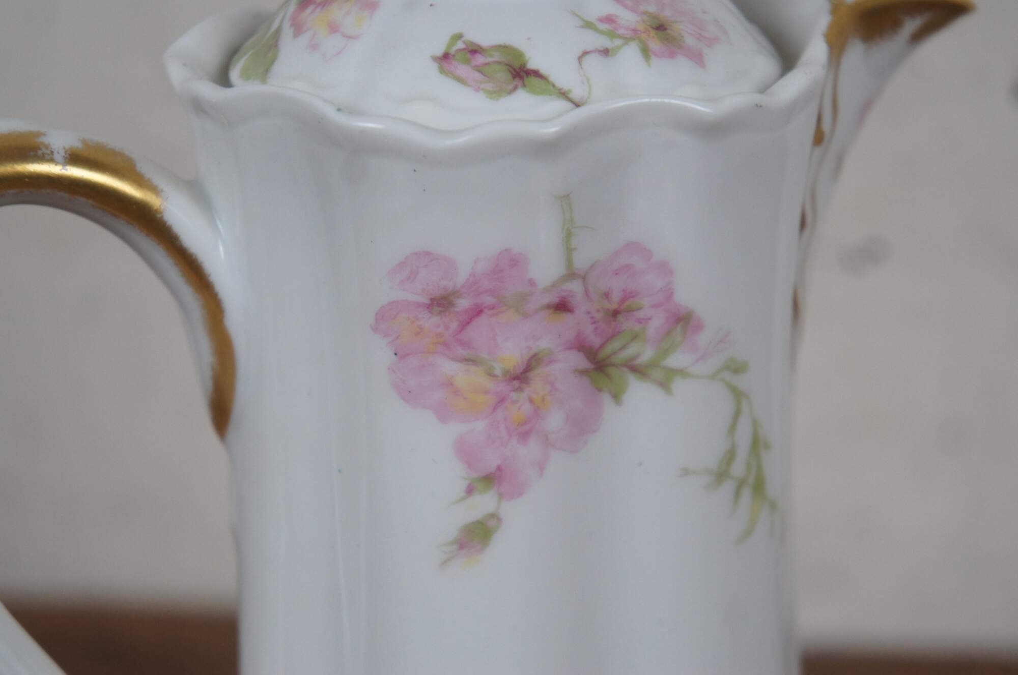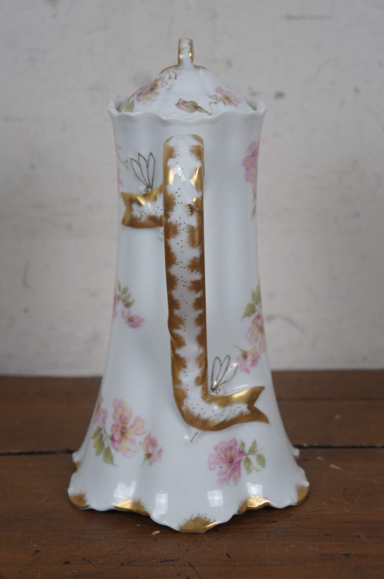 Early 20th century large Haviland & Co Limoges porcelain chocolate / tea pot. Tall with scalloped base and upper edge, ribbon shaped handle, hand painted with springs of pink roses and gilded details.