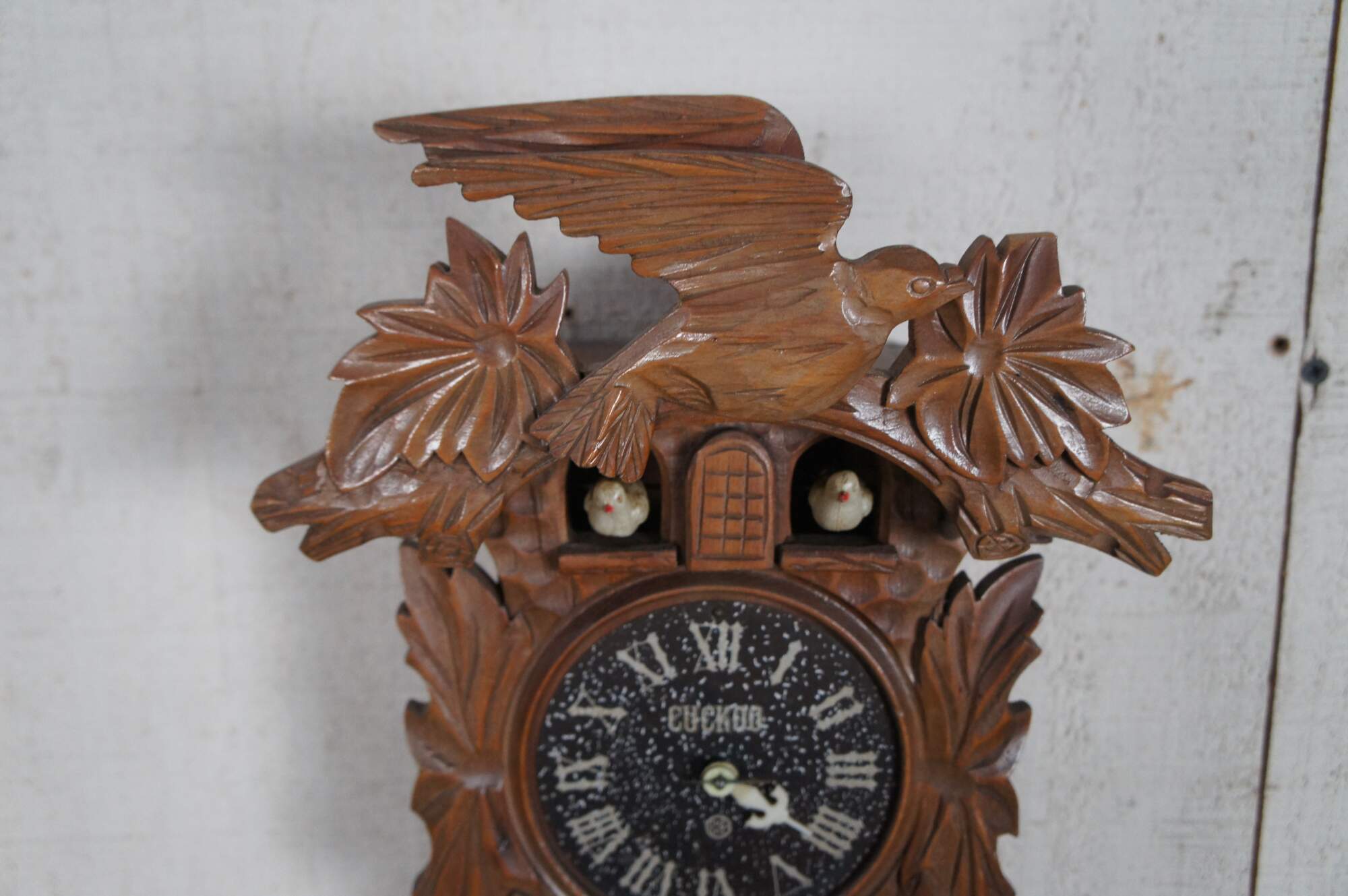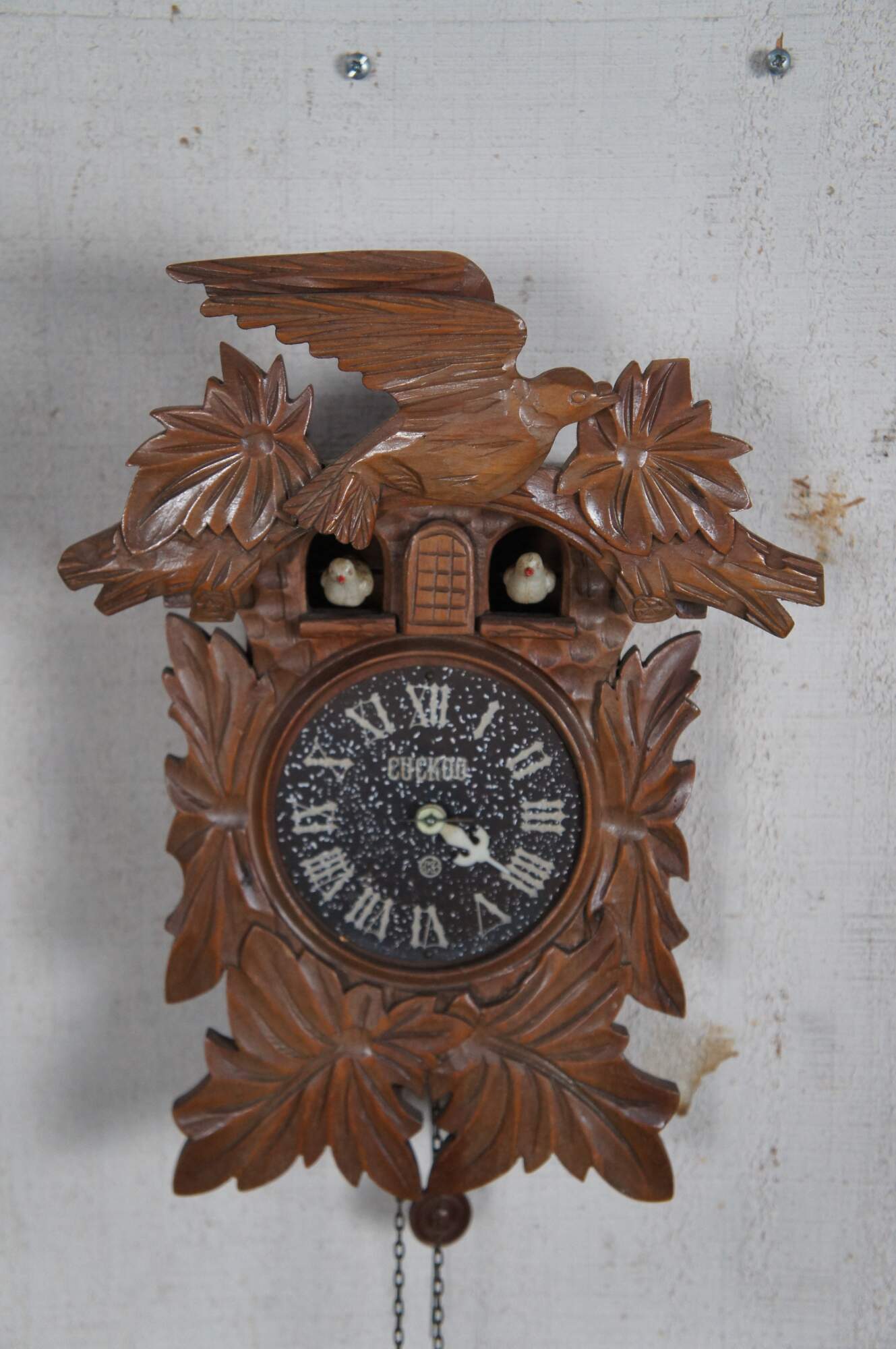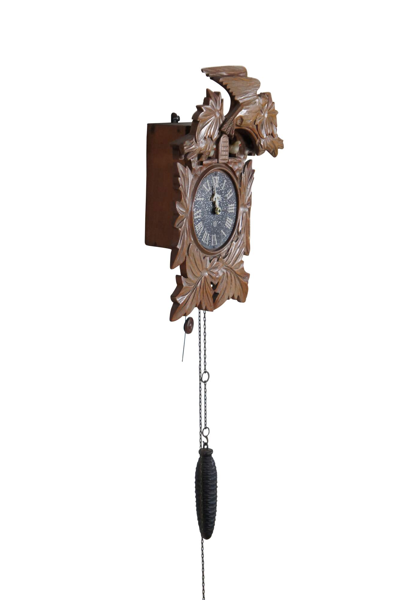 A quaint German walnut cuckoo clock. Features a Roam numeral face with a "K" mark towards the bottom. Includes one weight and pendulum.