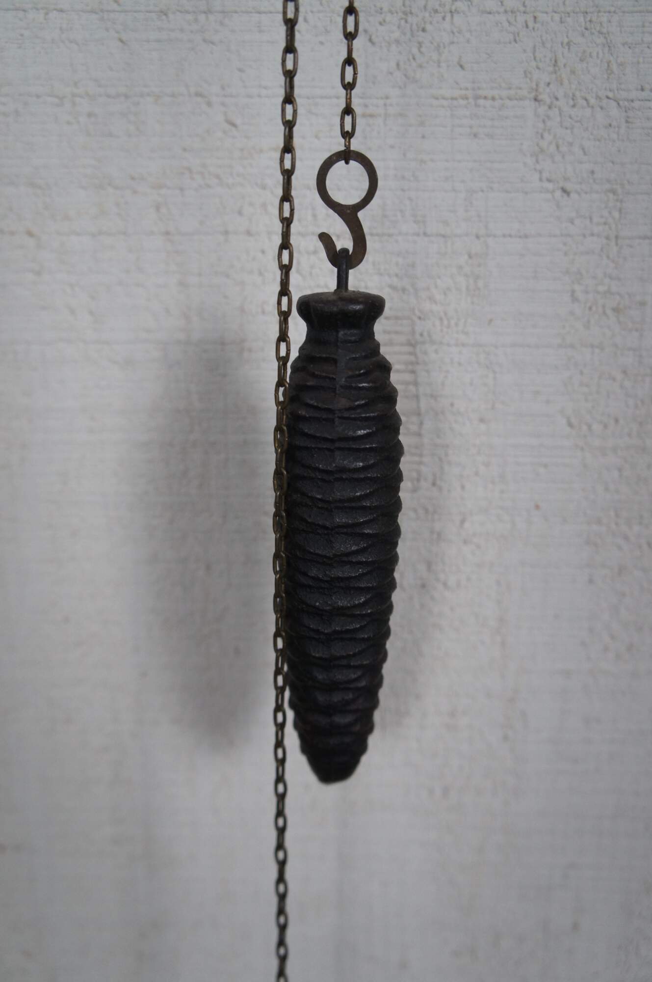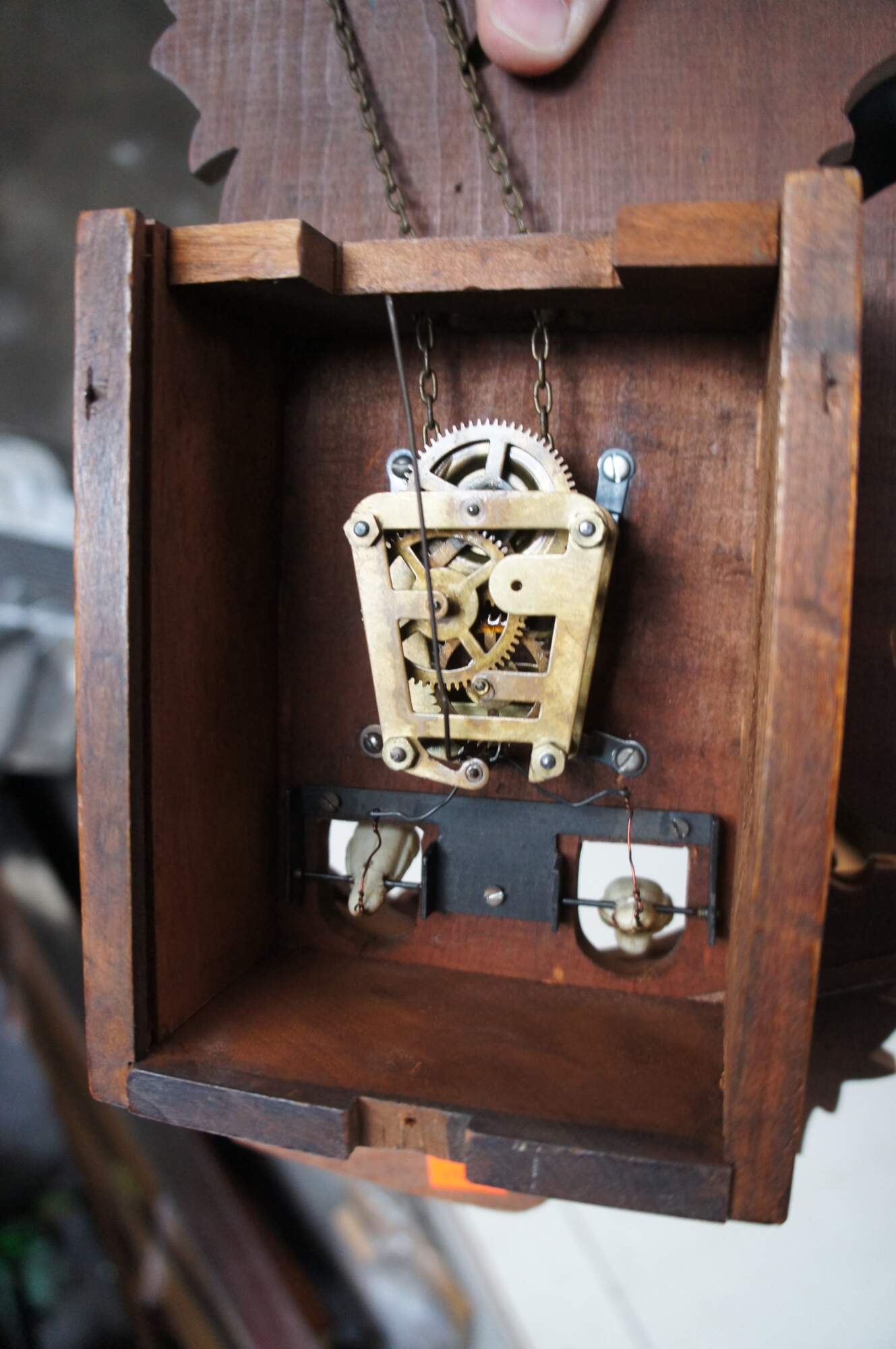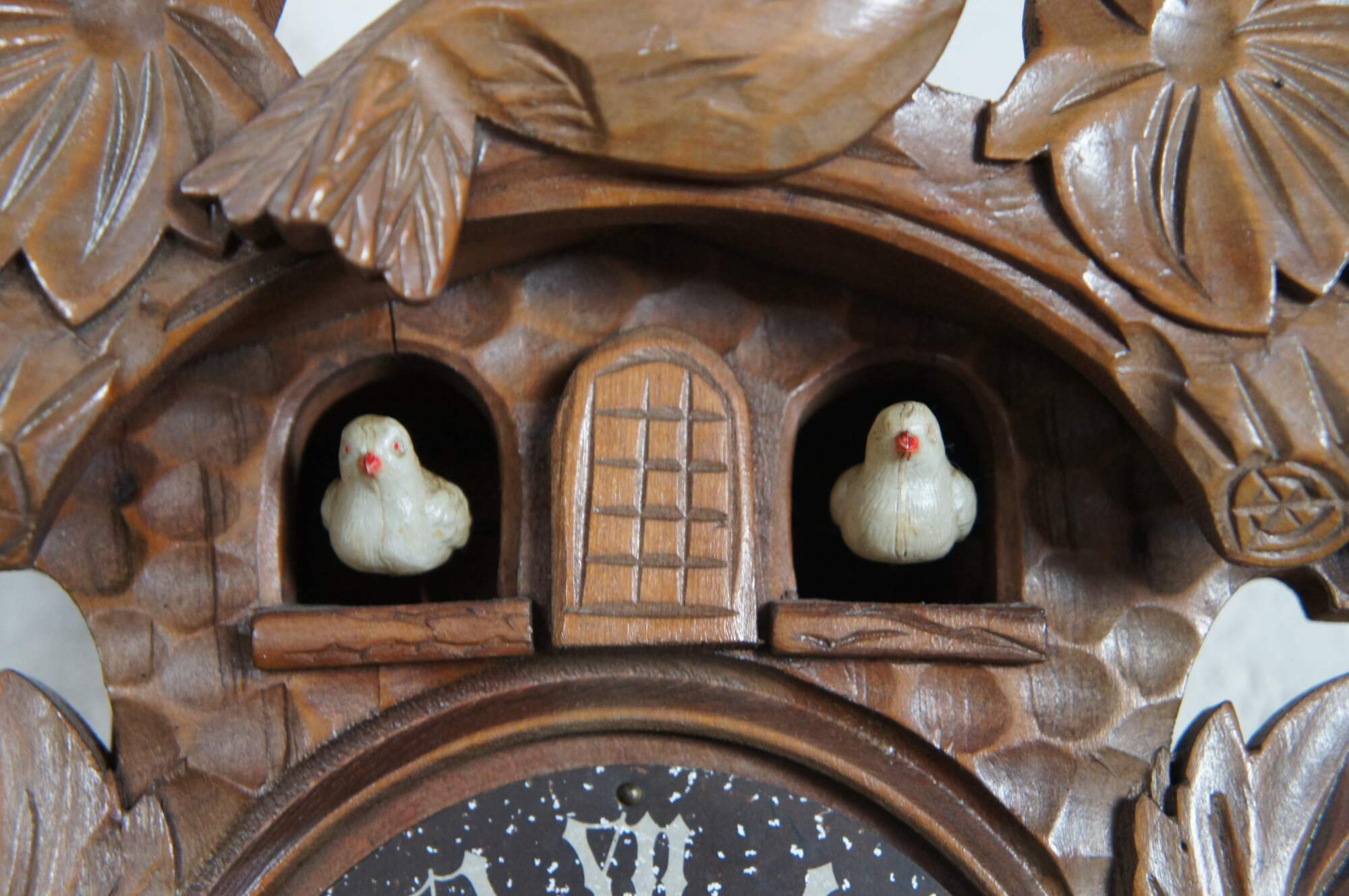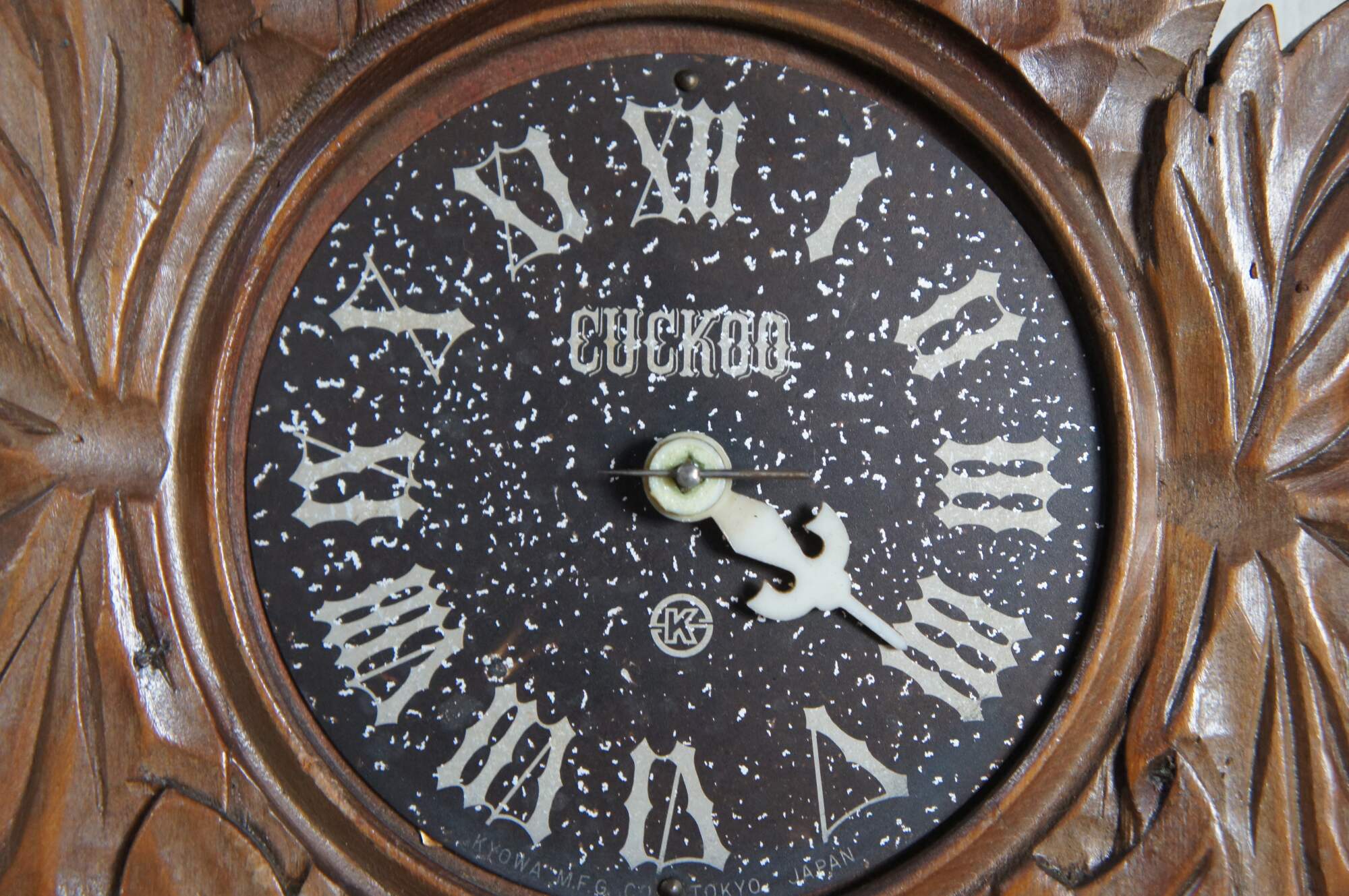 A quaint German walnut cuckoo clock. Features a Roam numeral face with a "K" mark towards the bottom. Includes one weight and pendulum.