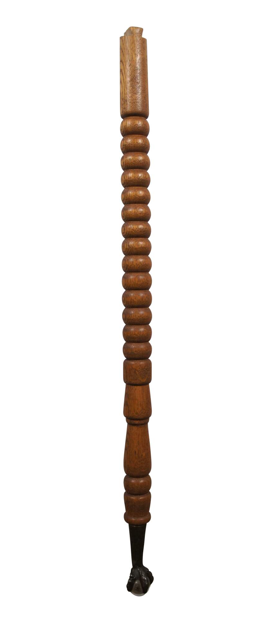 Set of four matching early 20th century turned oak spindle table legs with metal and glass marble ball and claw style feet.