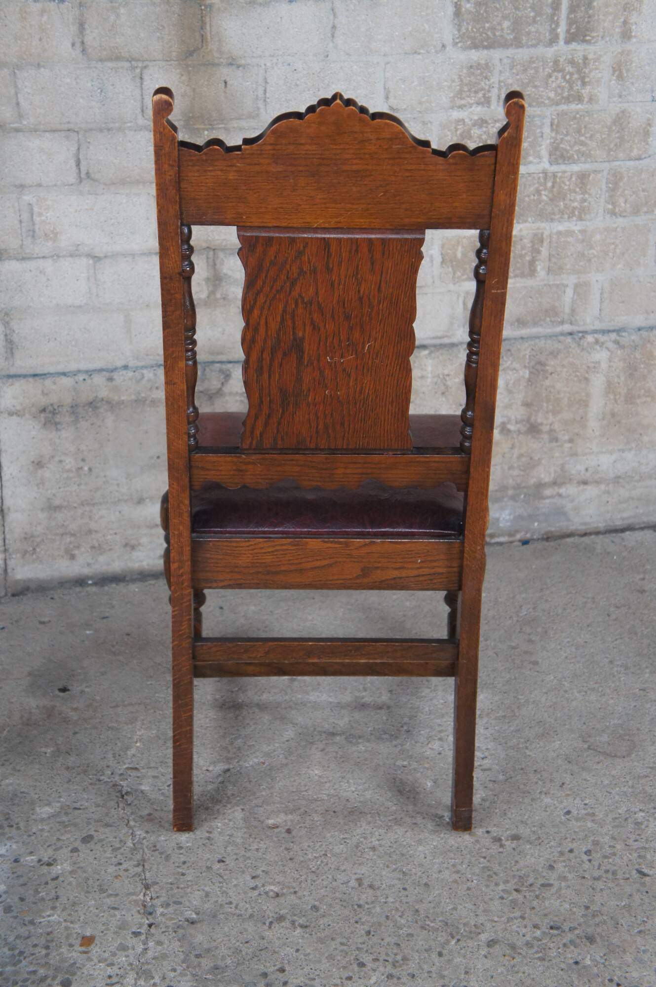 Set of six antique Jacobean dining chairs. Made of oak featuring carved serpentine design with carved floral panel backs and red oxblood leather seats.