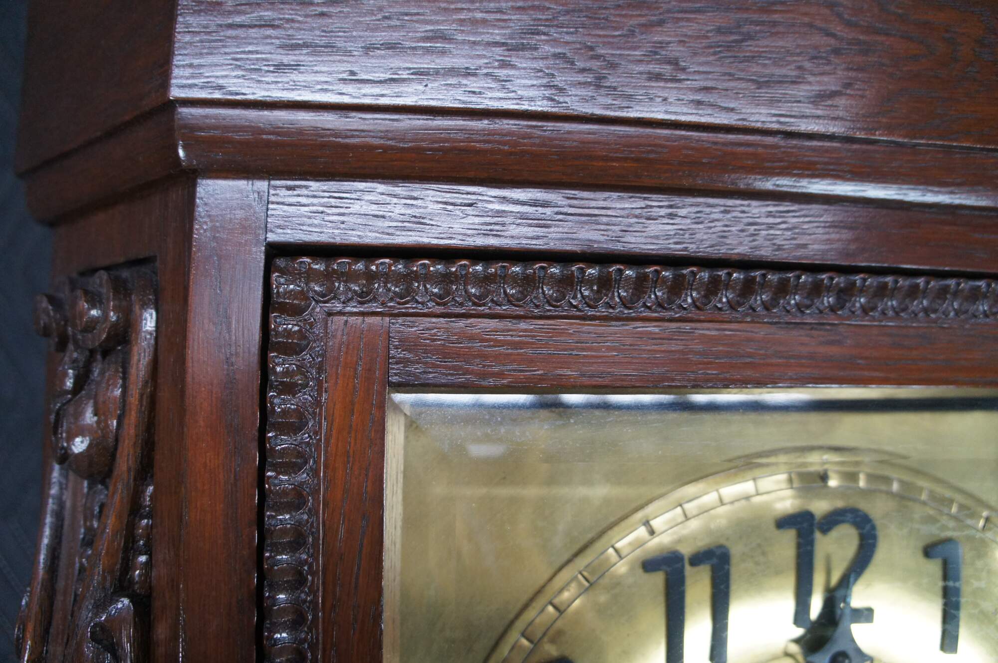 Antique Victorian German long case grandfather clock. Made of oak featuring a faceted design with carved panels, beveled glass and brass face / weights / pendulum.