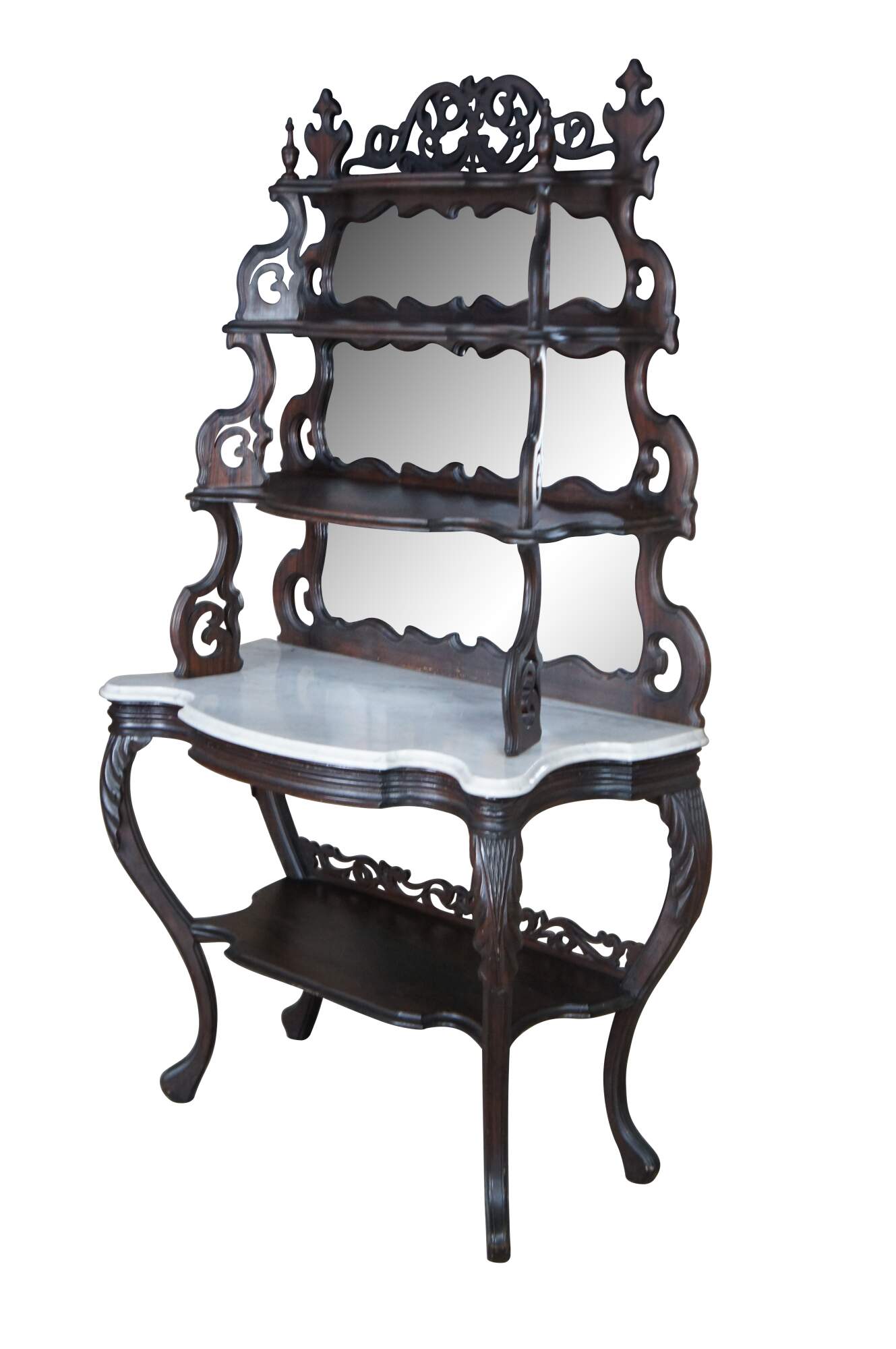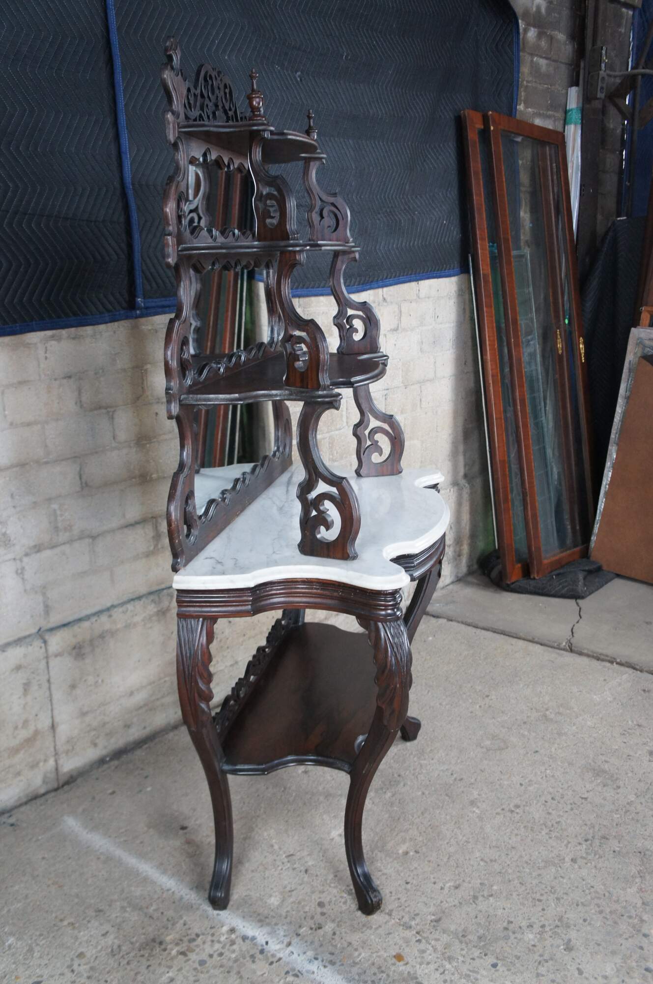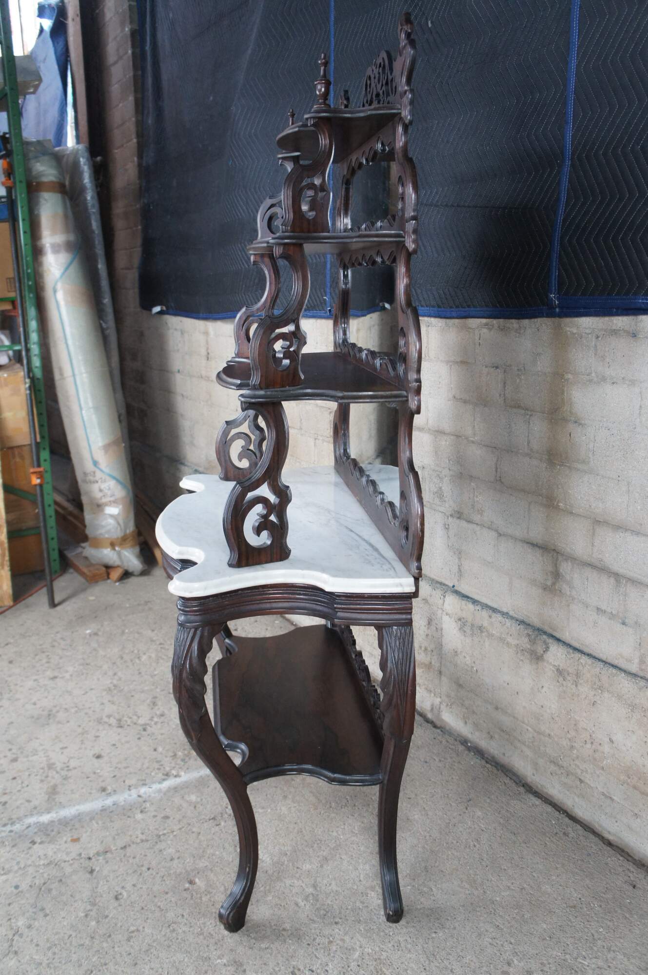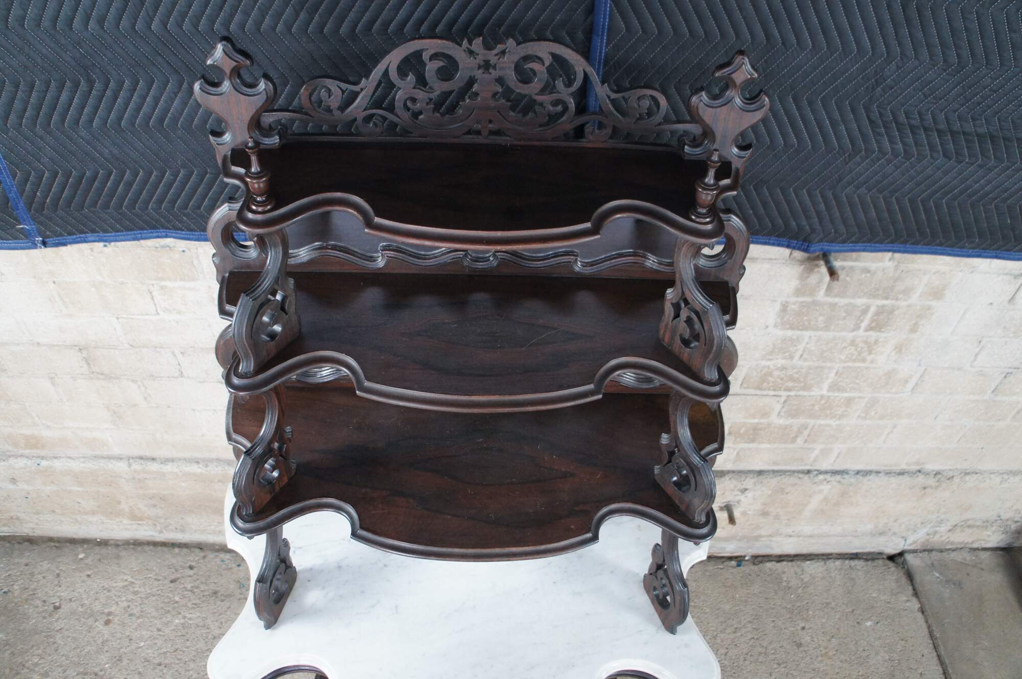 Antique Victorian tiered etagere display shelf / library bookshelf / parlor console. Made of Rosewood featuring serpentine pierced reticulated scanthus design with five tiers and marble top.