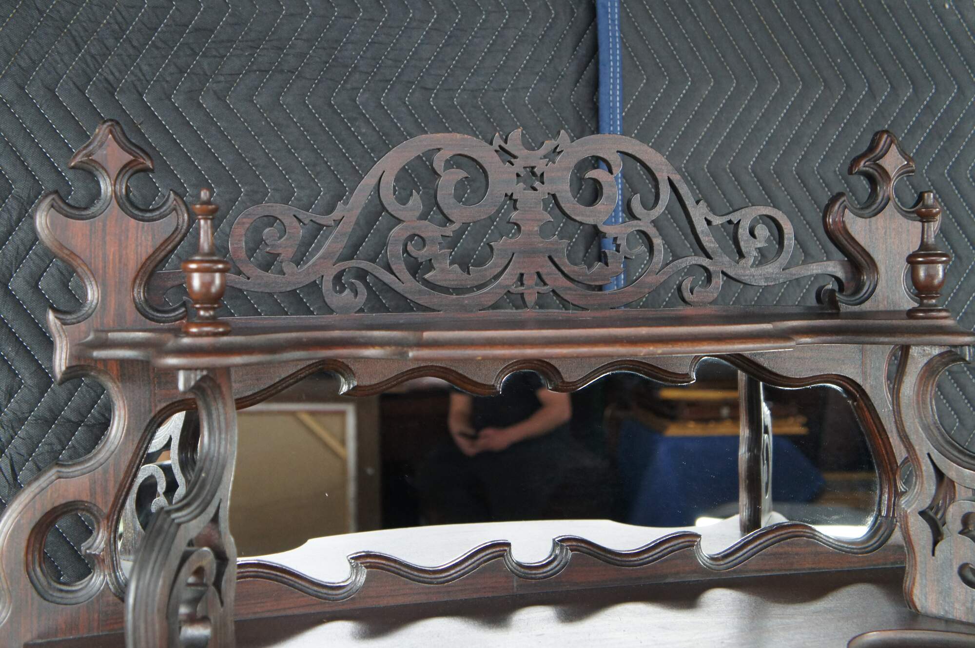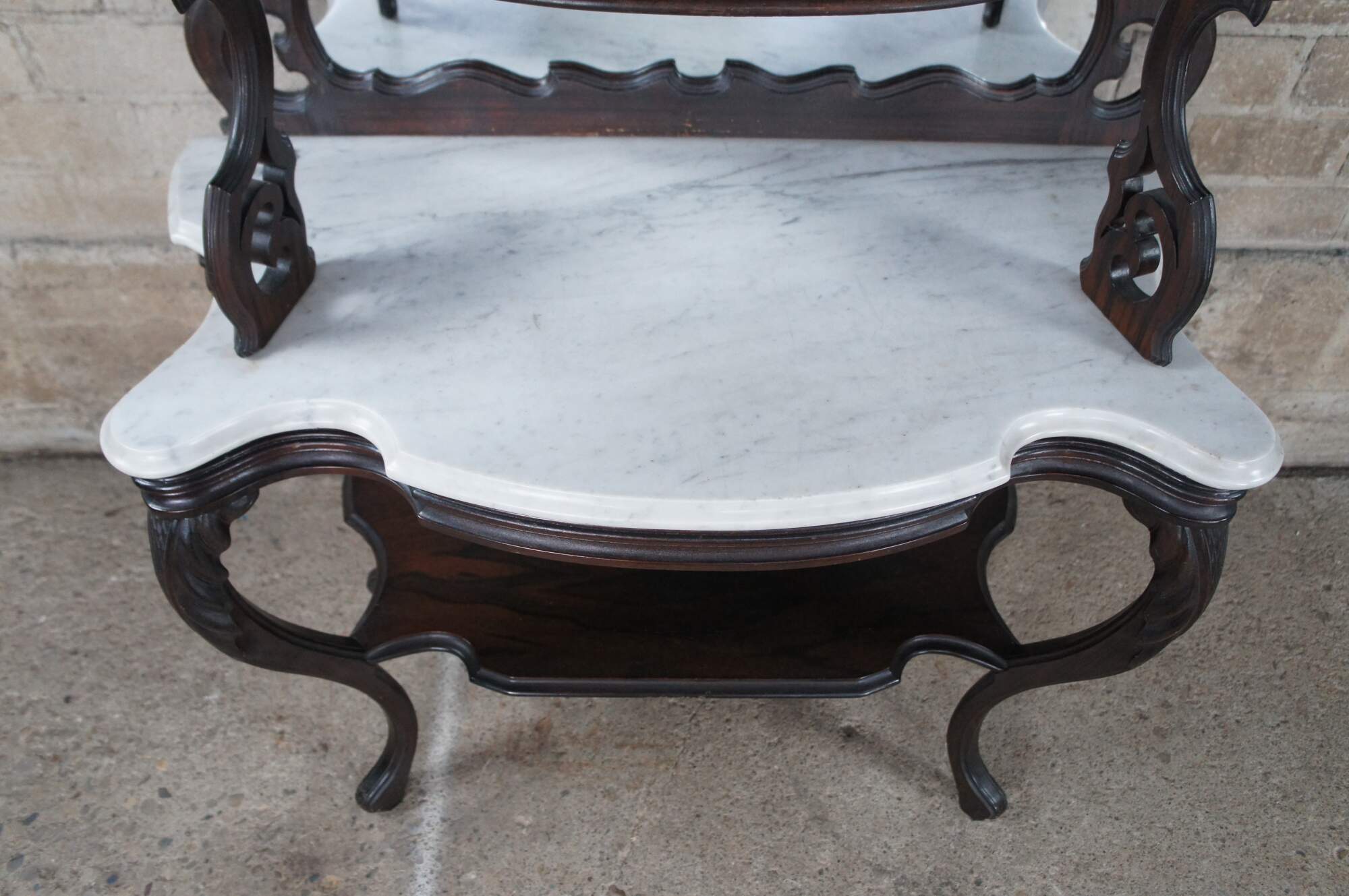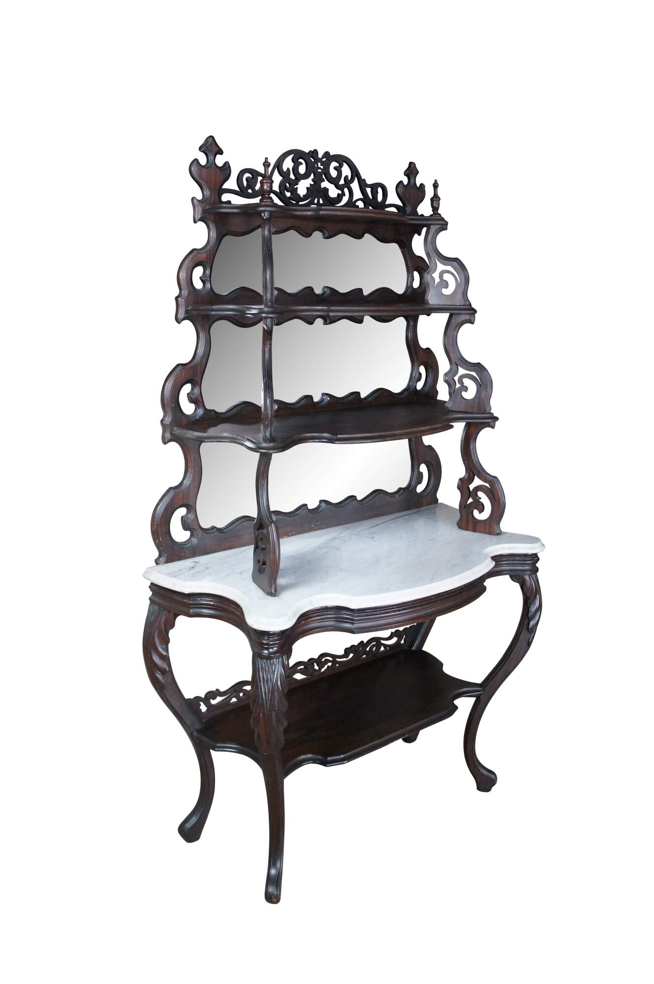 Antique Victorian tiered etagere display shelf / library bookshelf / parlor console. Made of Rosewood featuring serpentine pierced reticulated scanthus design with five tiers and marble top.