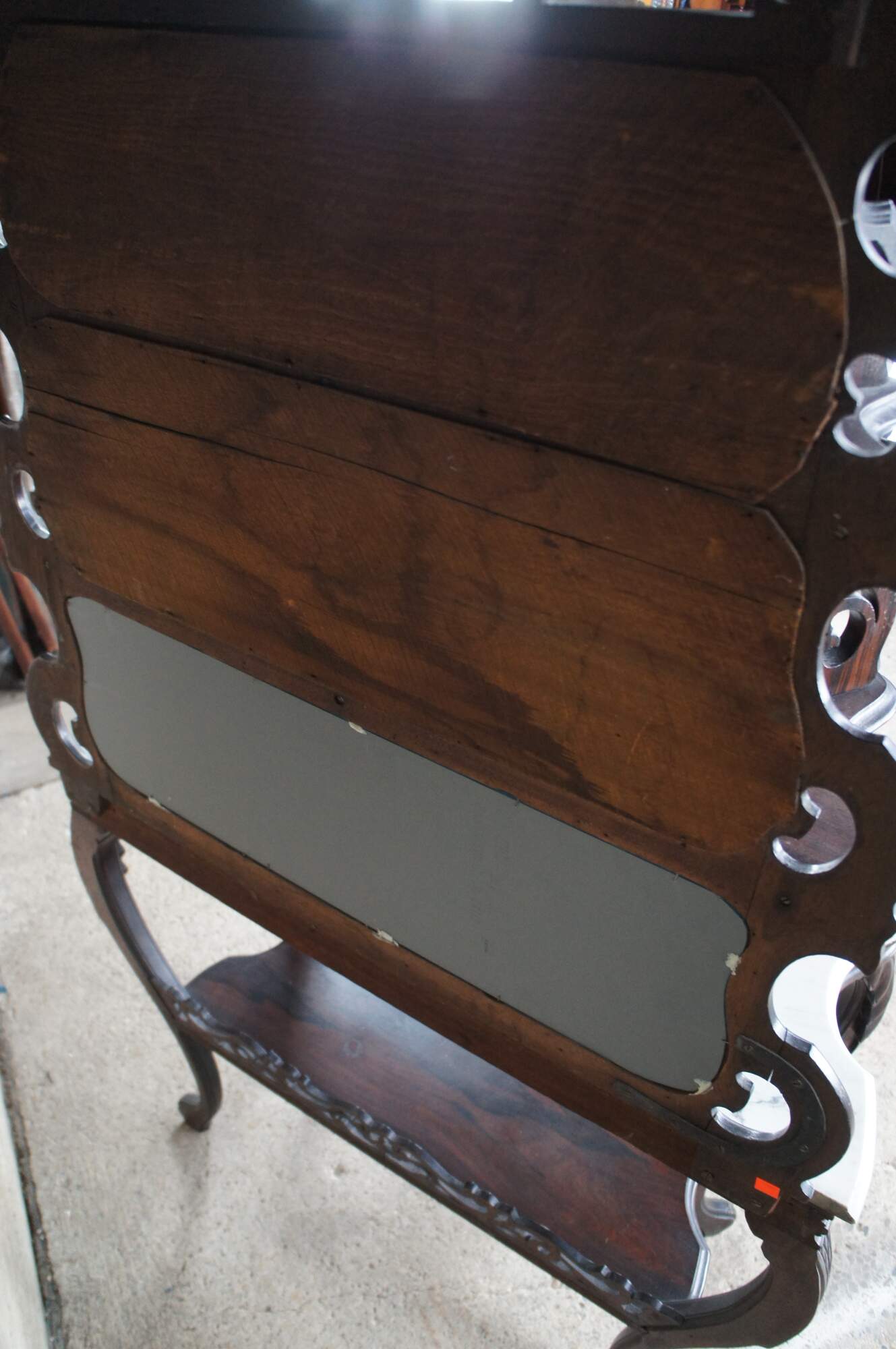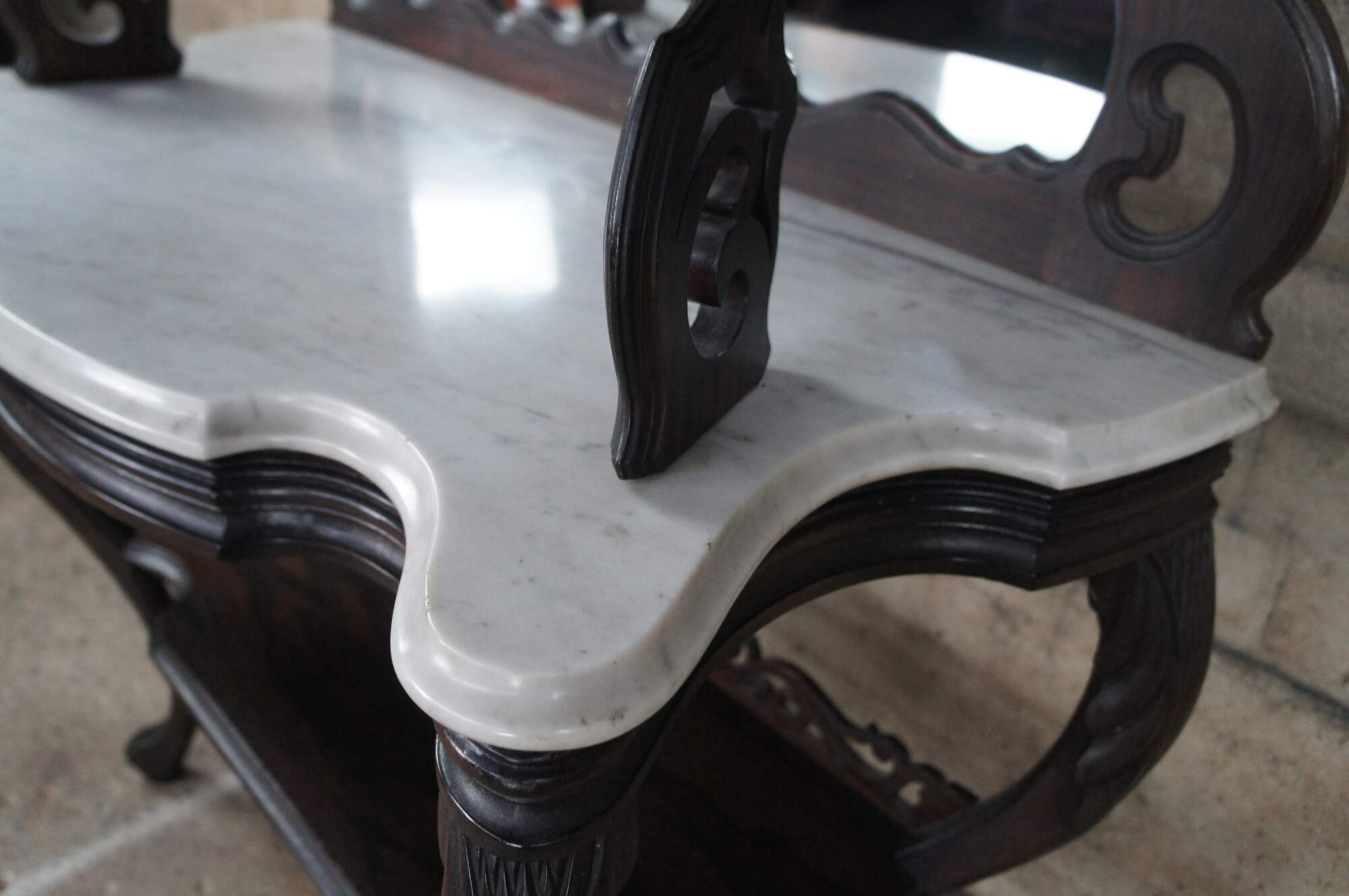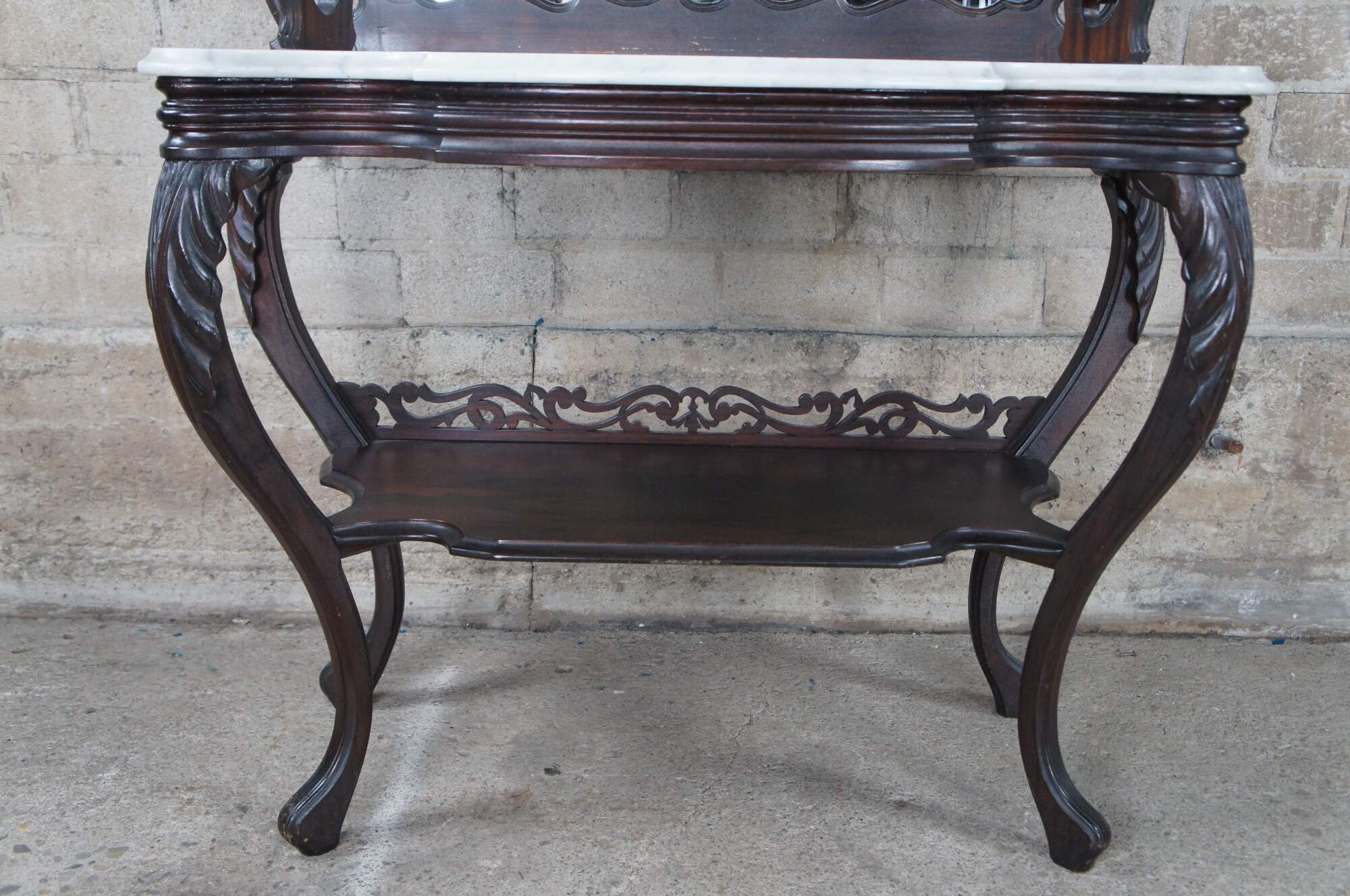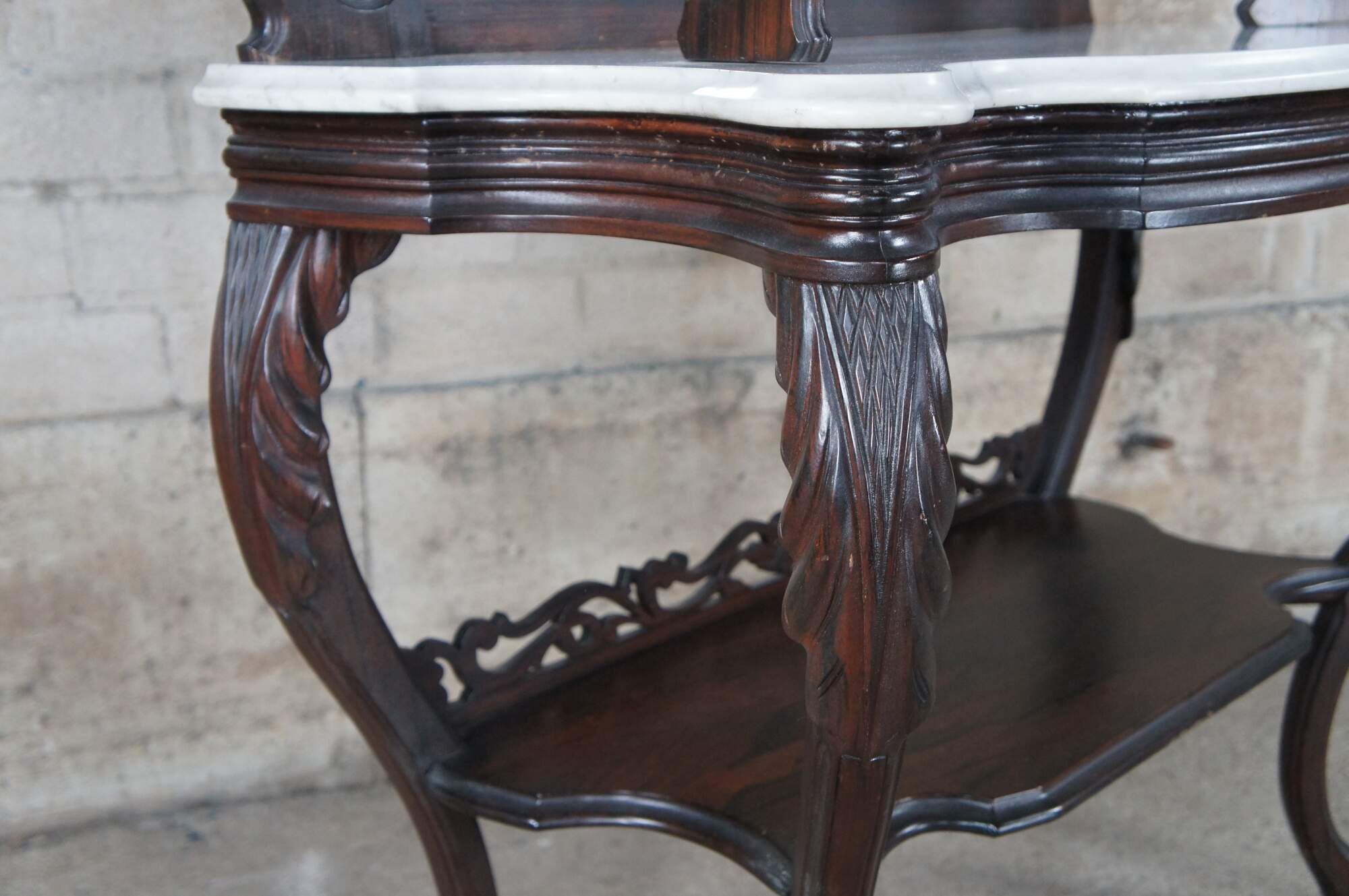 Antique Victorian tiered etagere display shelf / library bookshelf / parlor console. Made of Rosewood featuring serpentine pierced reticulated scanthus design with five tiers and marble top.