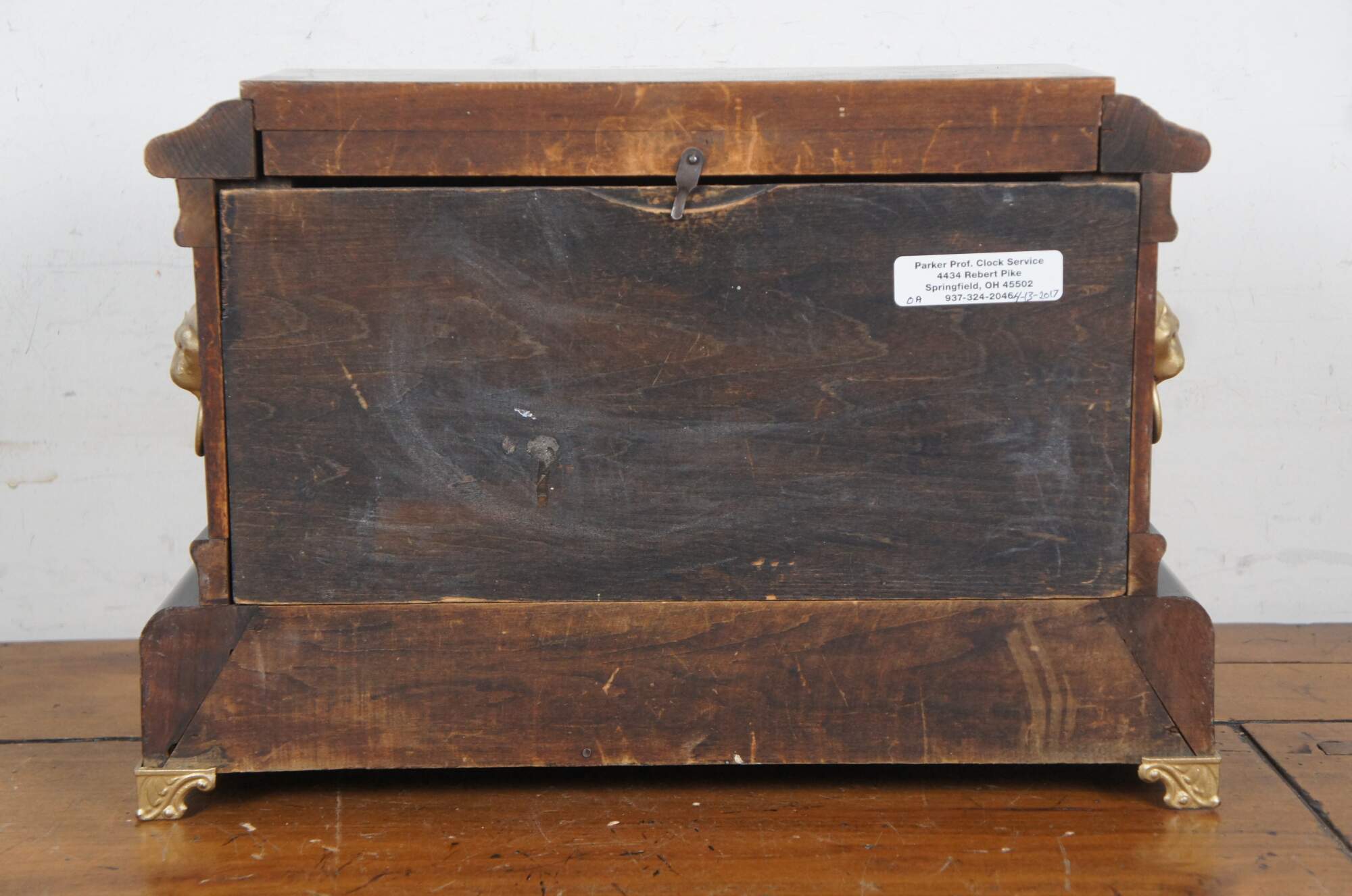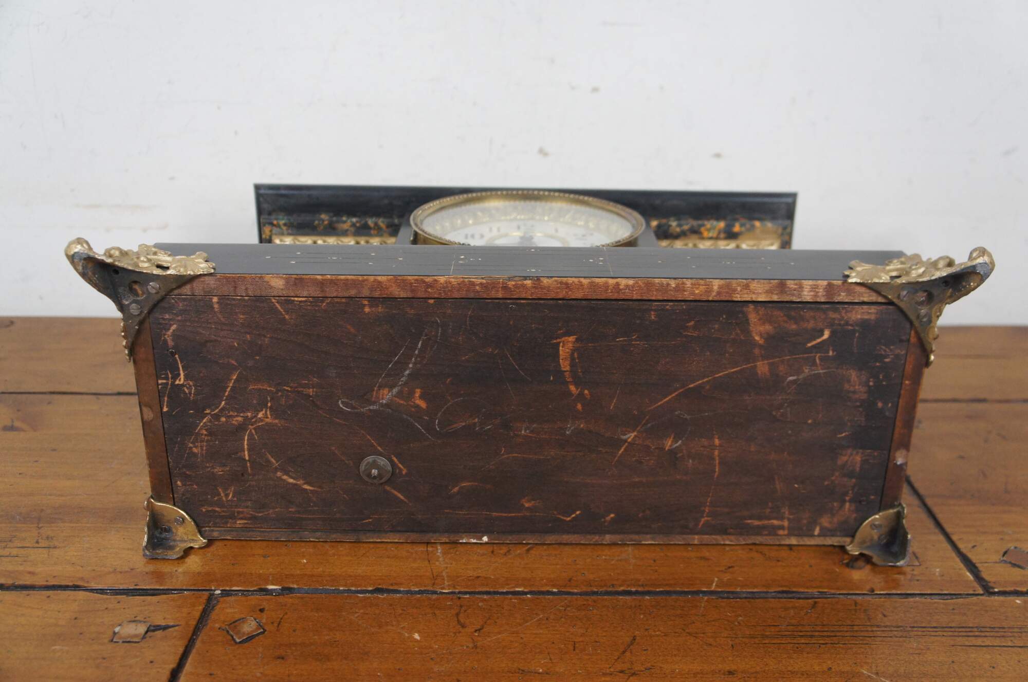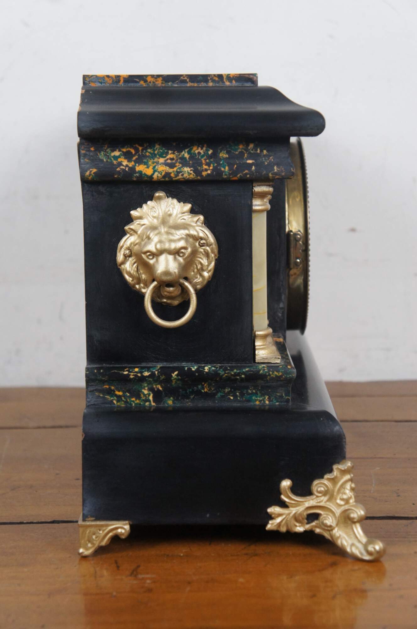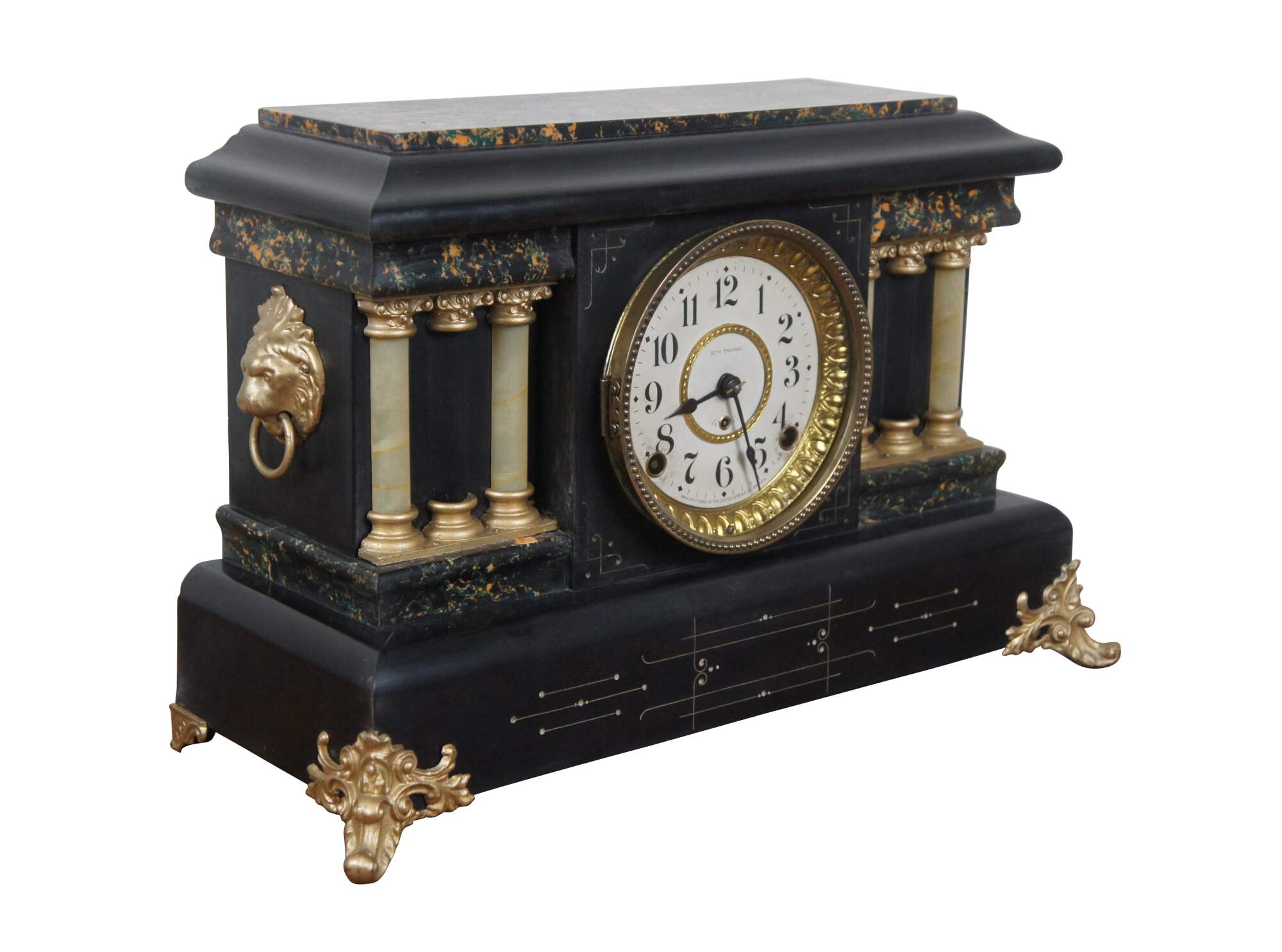 Early 20th century seth Thomas key wound, 8 day chiming mantel clock. Ebonized wood body with delicate white art deco details, green / orange / black adamantine accents and six off white adamantine columns. Brass acanthus leaf feet, lion's head ring handles and ionic column caps.