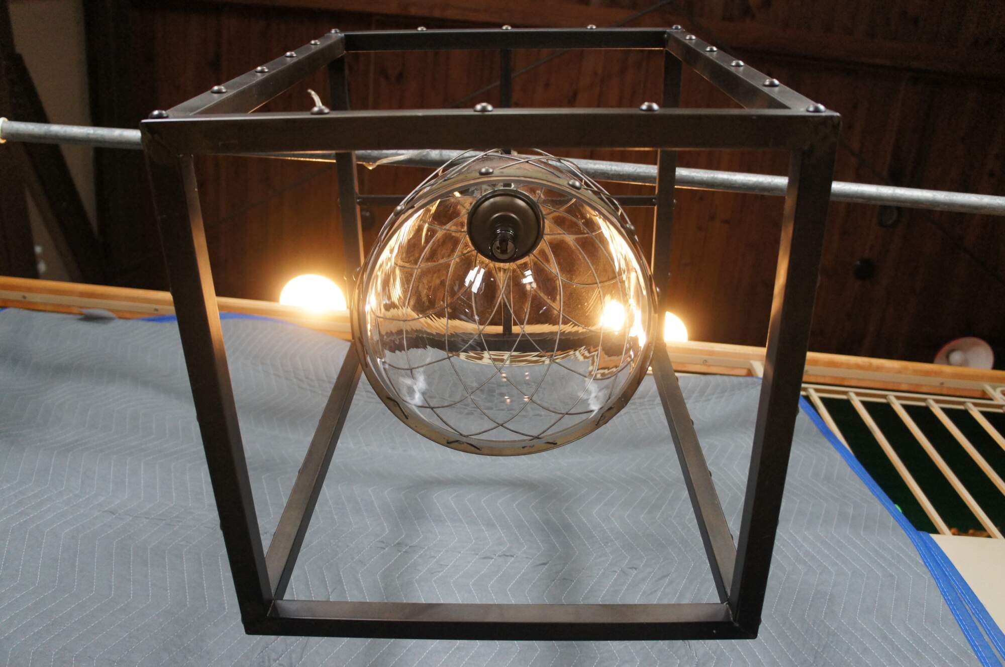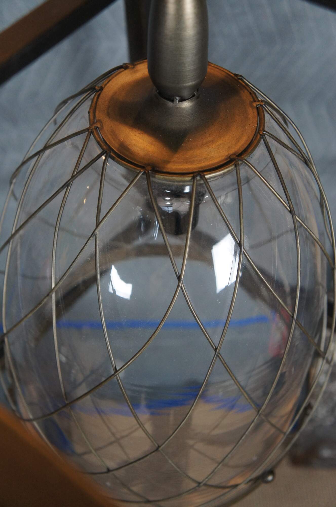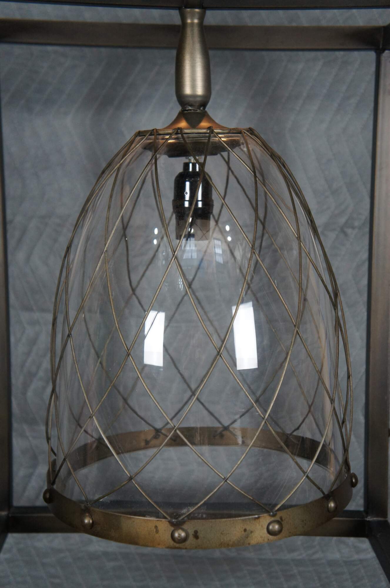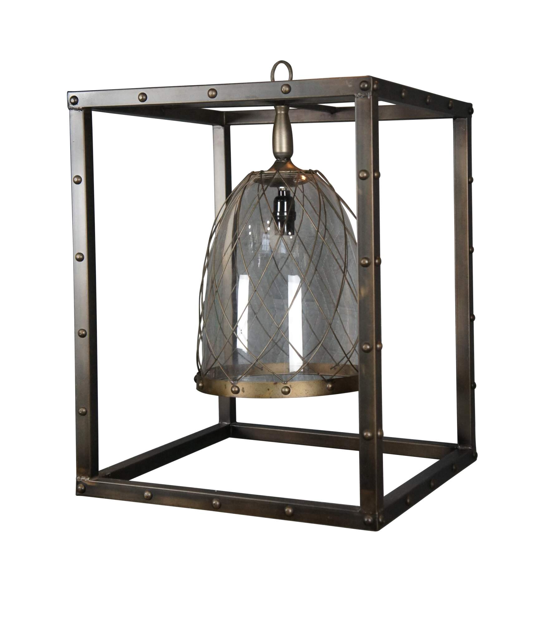 Vintage Karlin pendant swag light / chandelier. Features a modern / industrial style riveted rectangular frame around a glass bell wraped in a wire bird cage. Antique brushed nickel / oiled bronze finish. Plain round ceiling medallion. Hard wired.