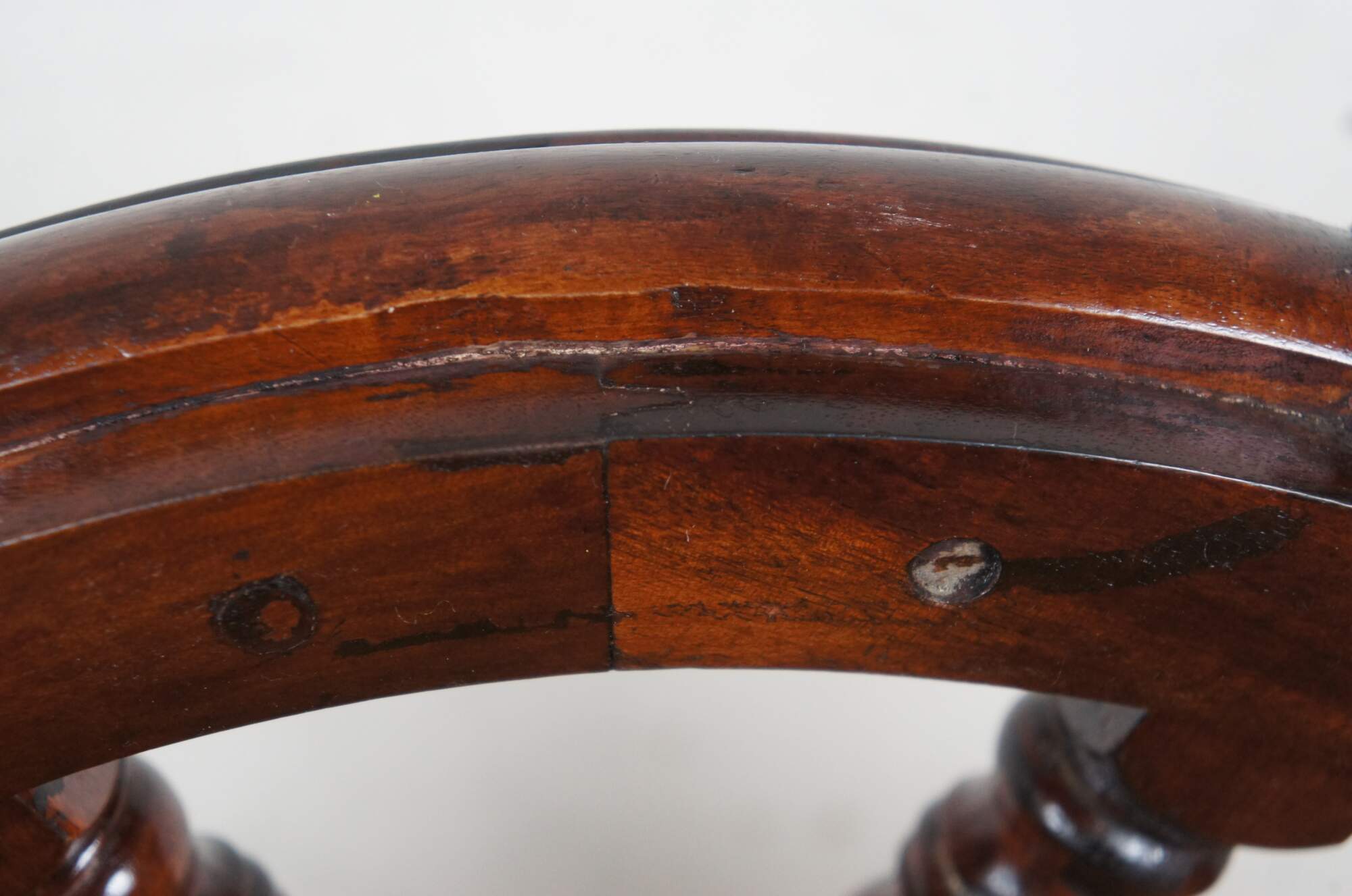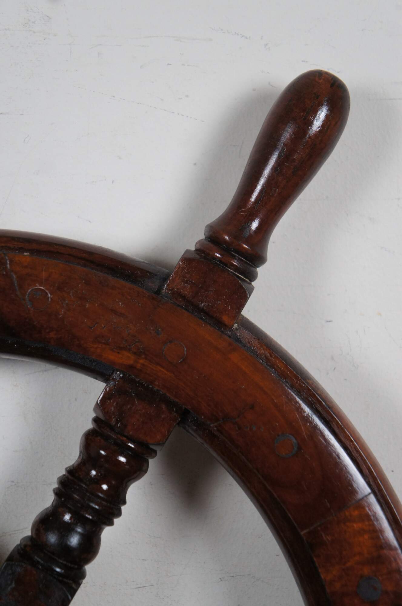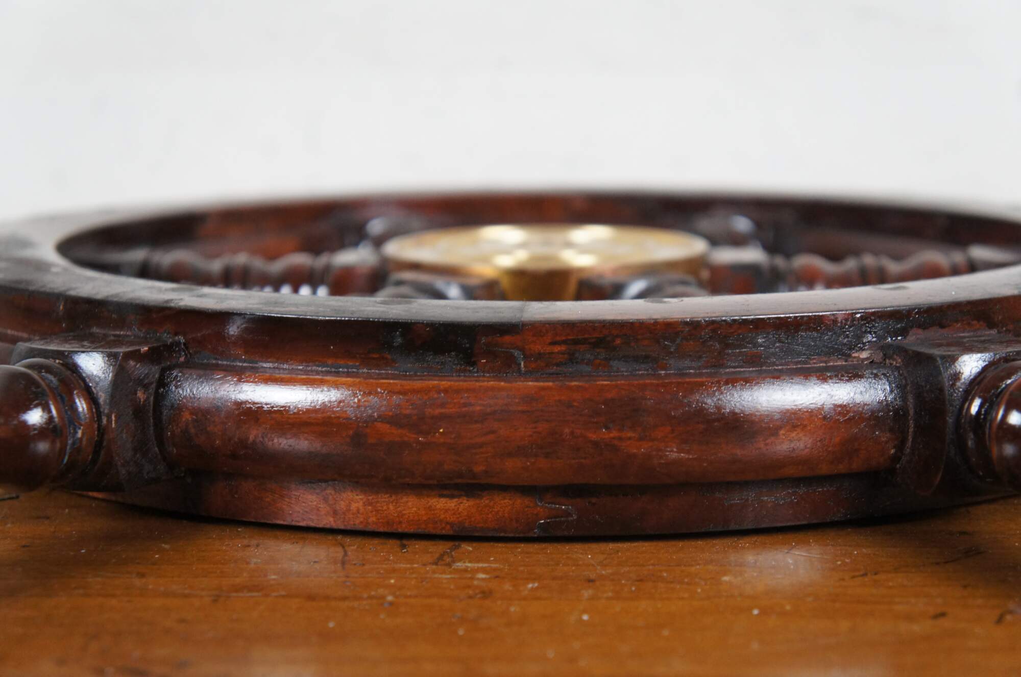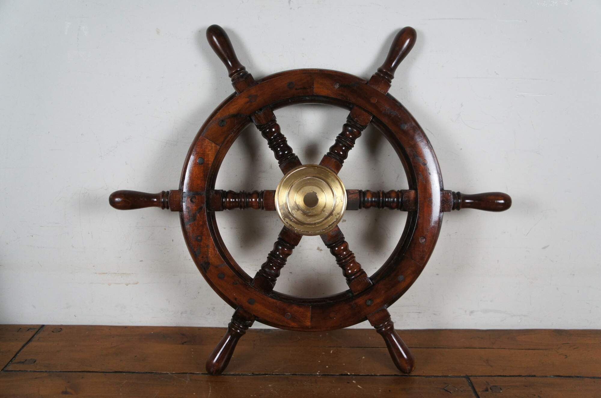 Mid 20th century wood and brass ship's steering wheel / helm. Traditionally styled with six turned spokes and brass center mount.