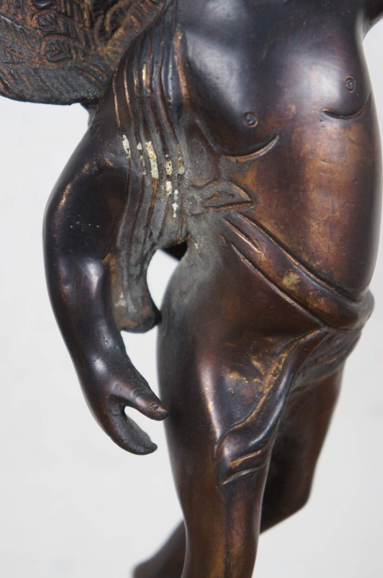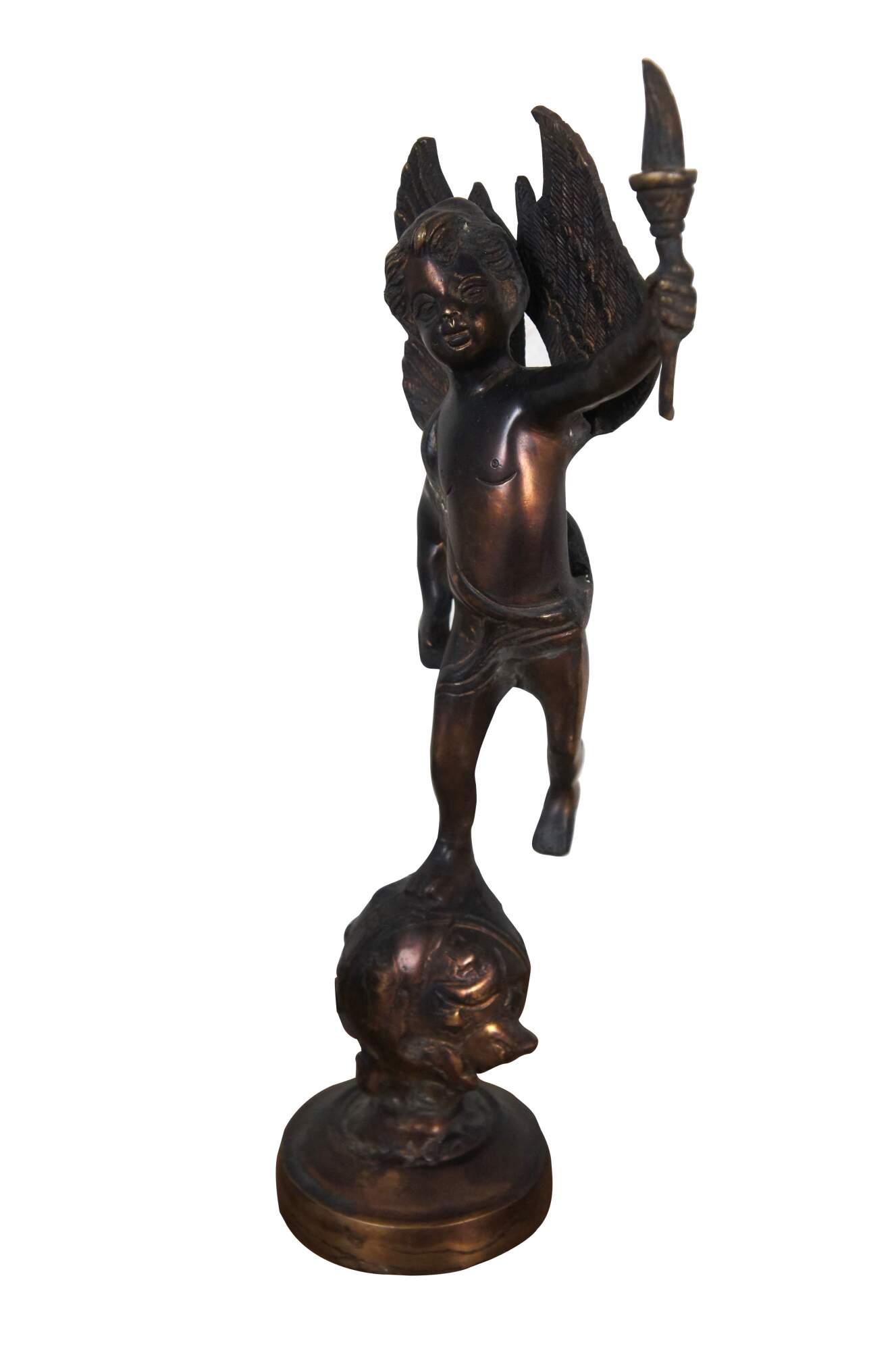 Vintage cast bronze sculpture / figurine in the shape of a putto / cherub / angel carrying a torch, perched on top of a globe studded with stars.