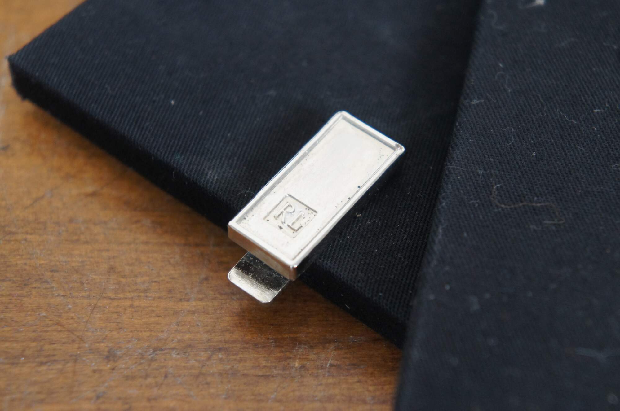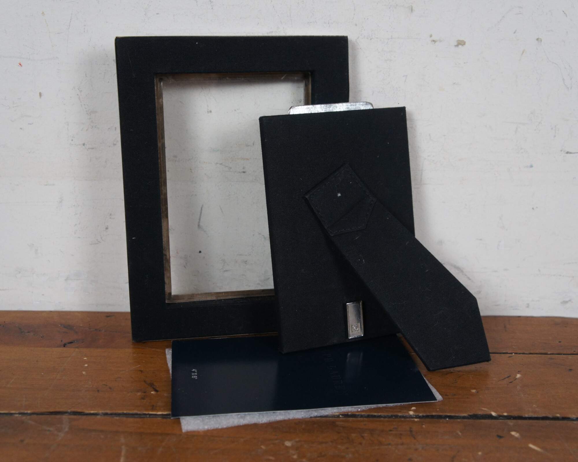 Rare vintage Ralph Lauren silver plate easel style photo frame, simple rectangular design with lined border and applied polo pony logo in lower right corner. Black fabric back secured with sliding monogram latch.