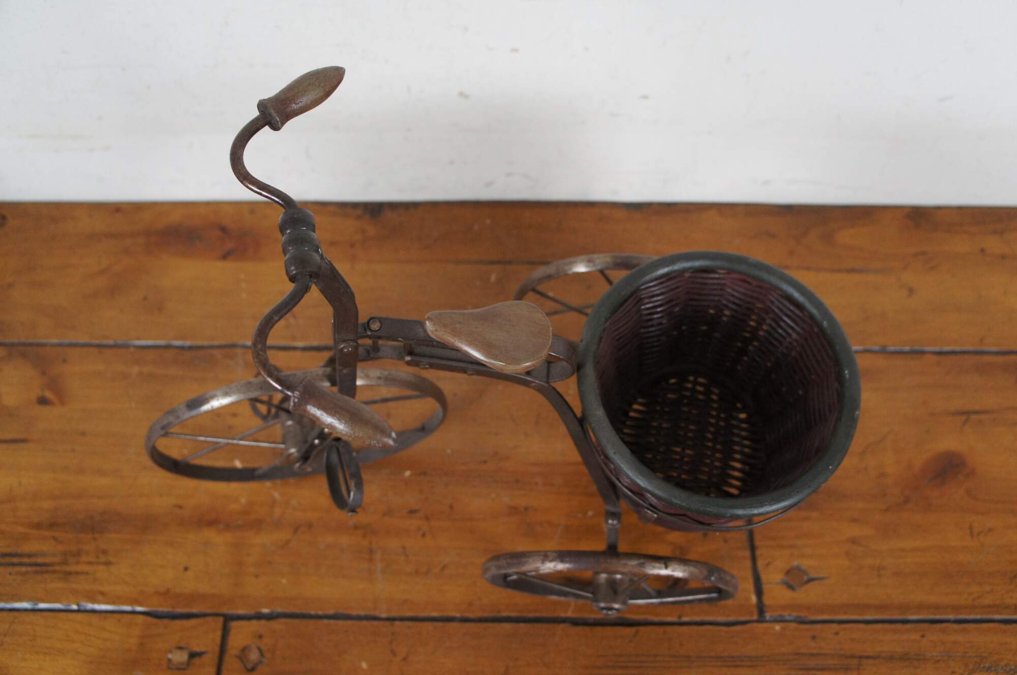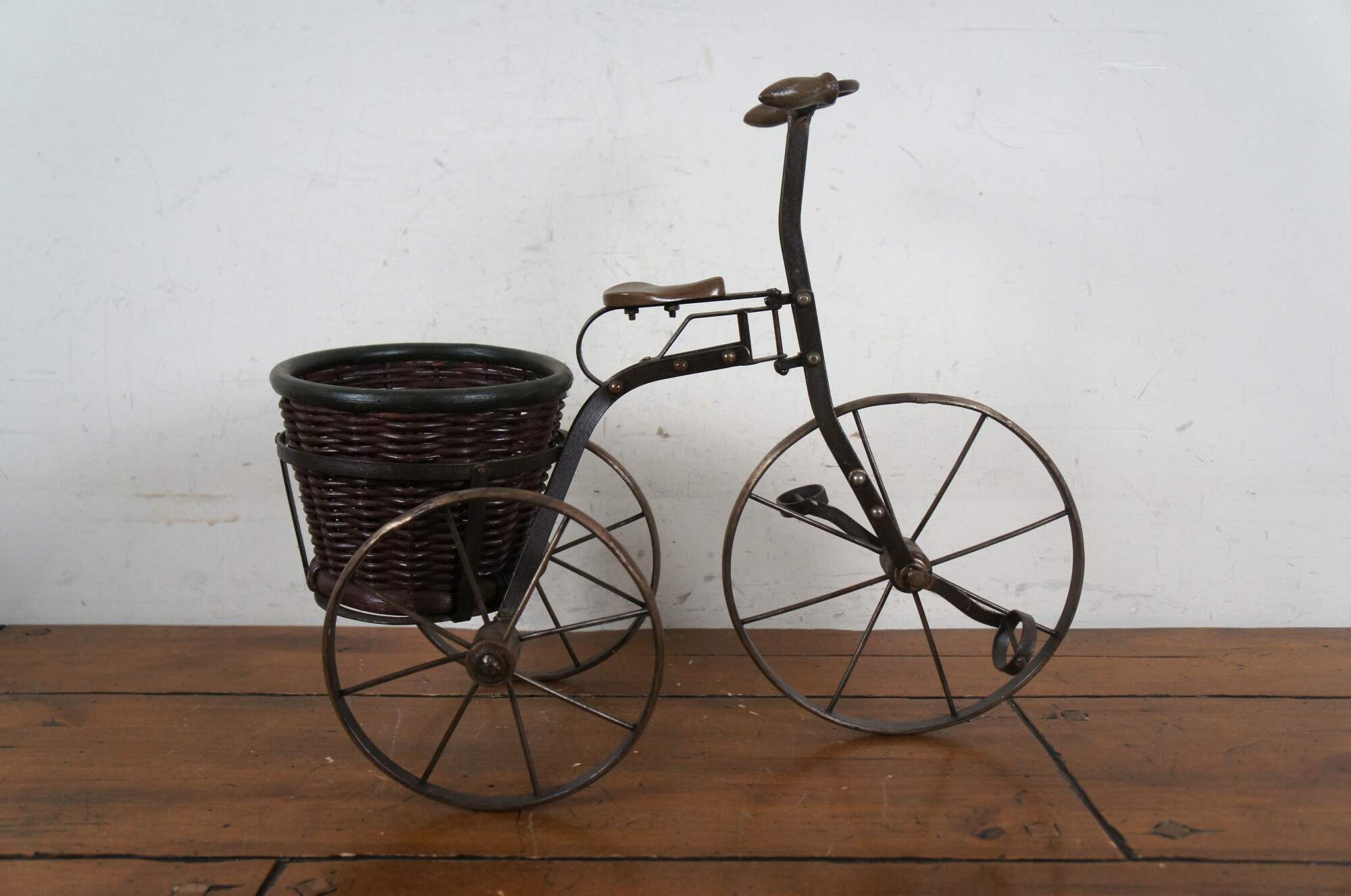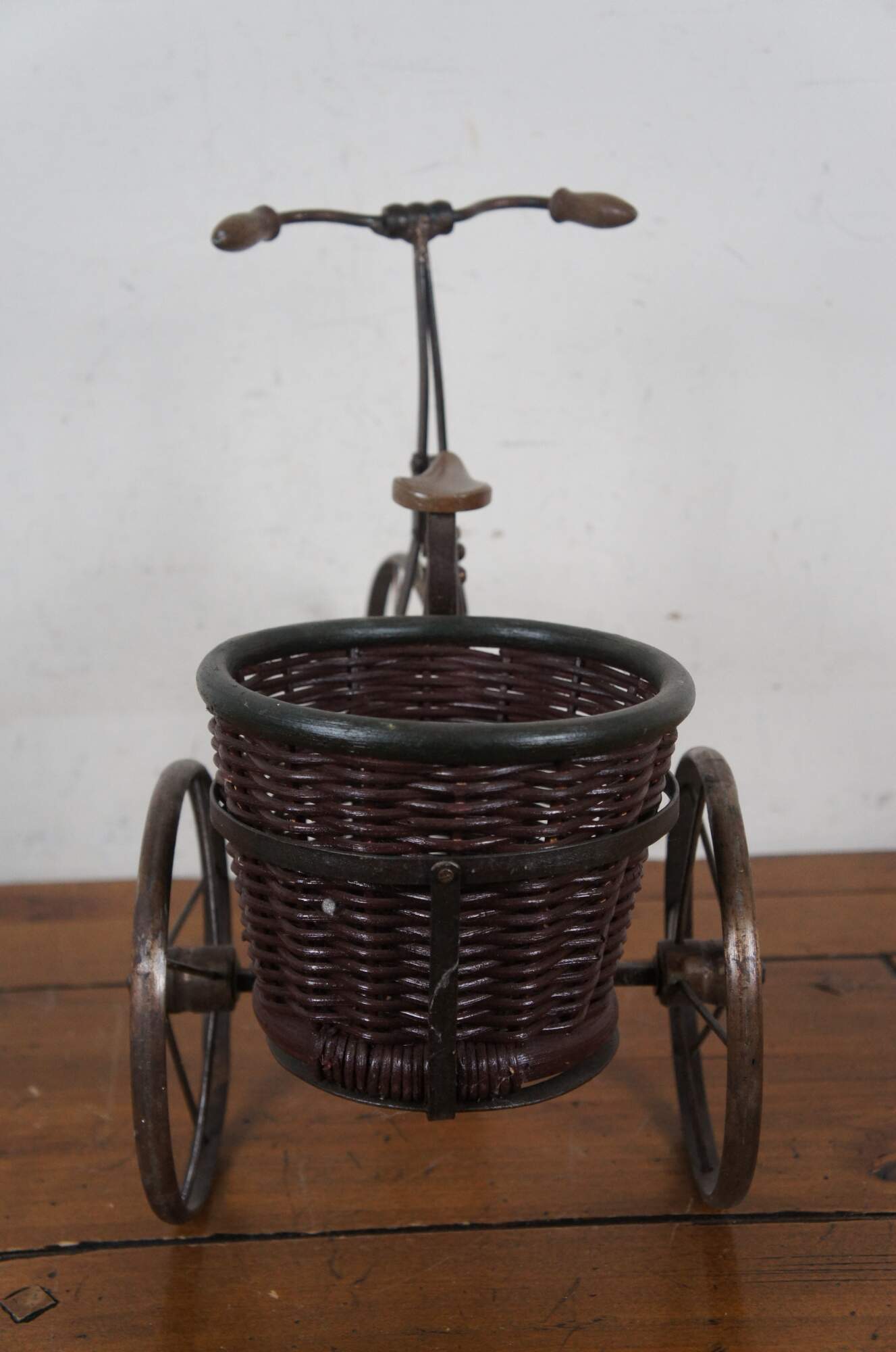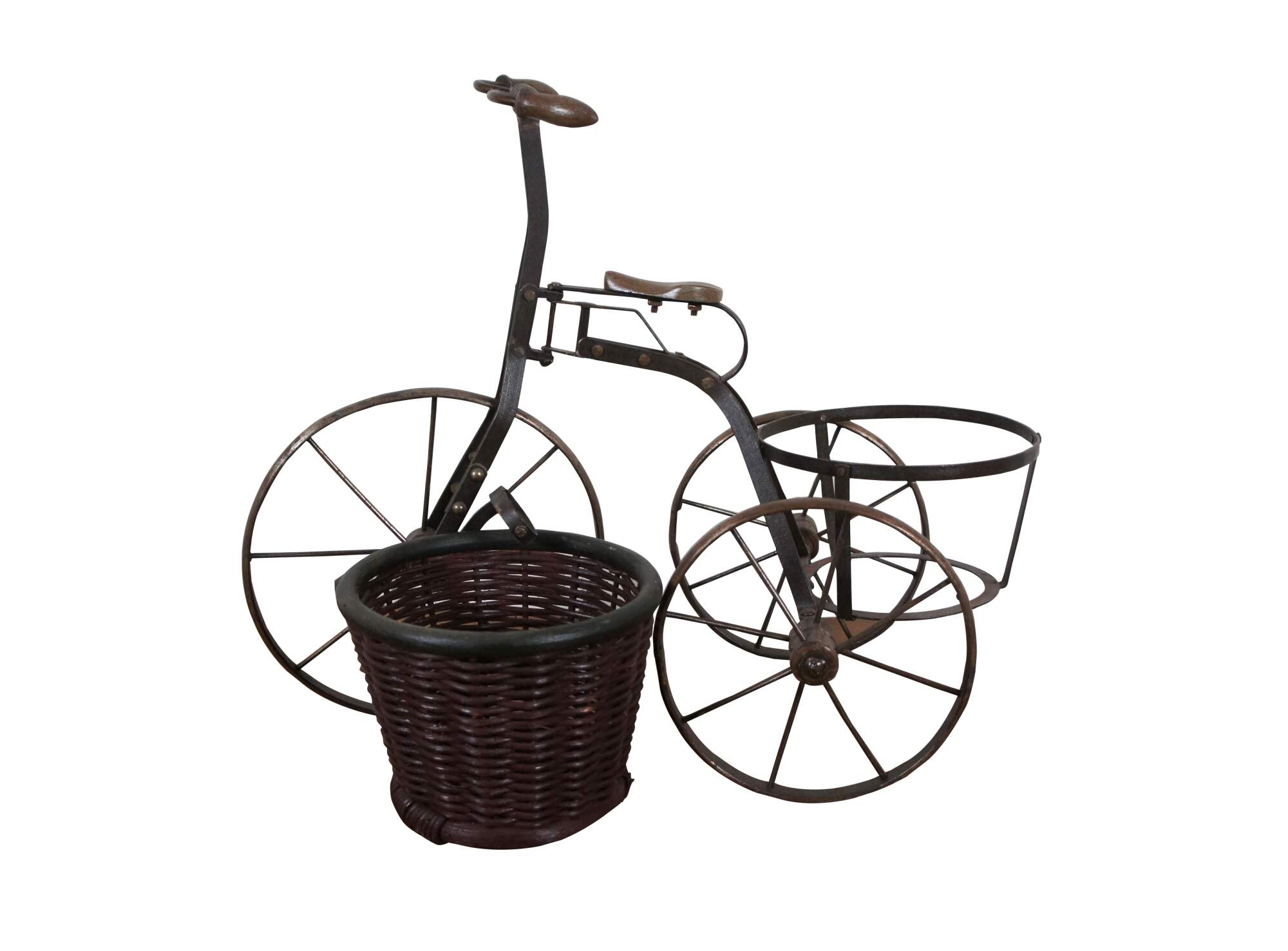 Late 20th century metal tricycle shaped plant stand with wooden handles and seat, and cylindrical woven planter basket with green painted rim.
