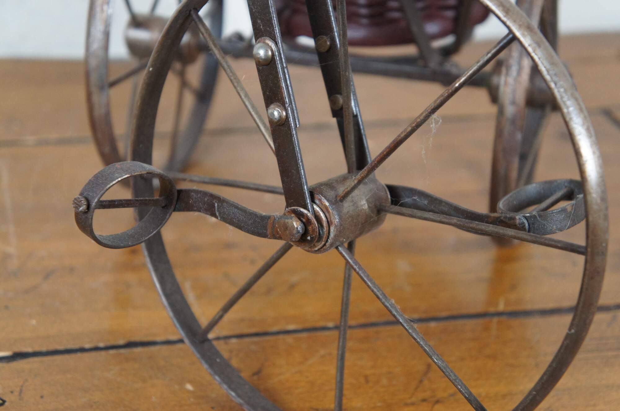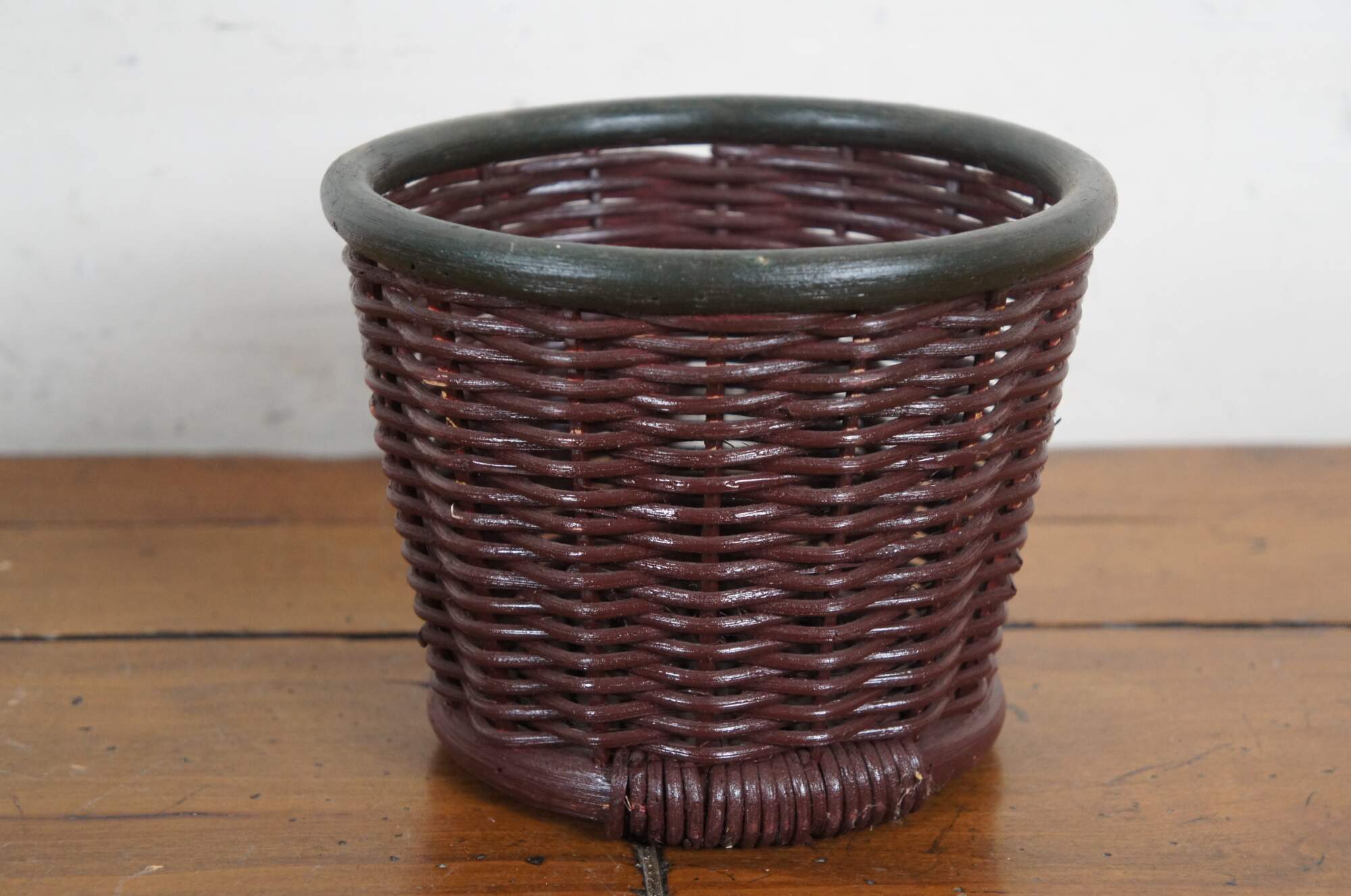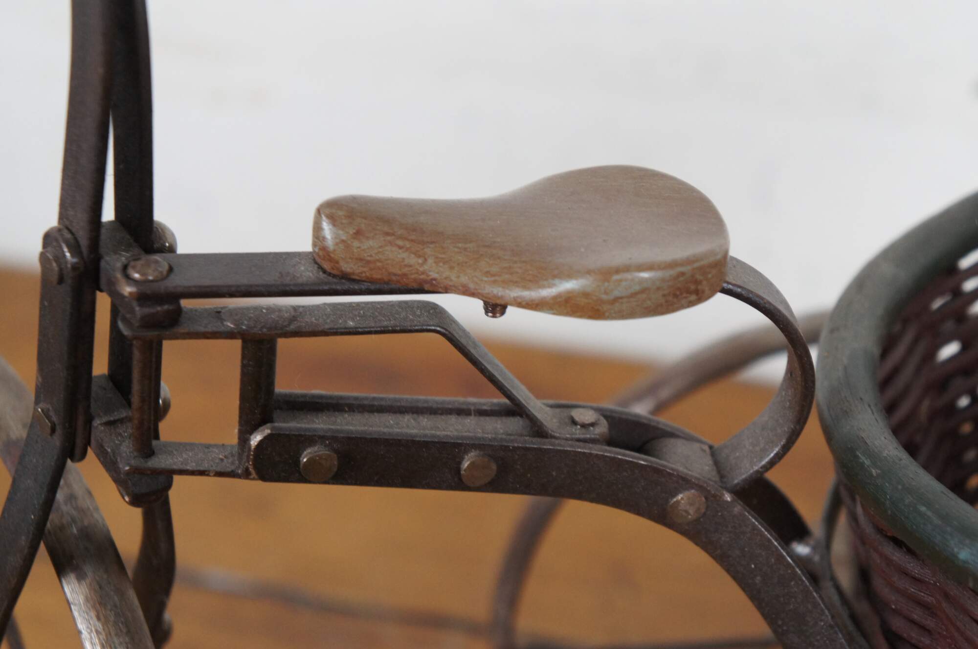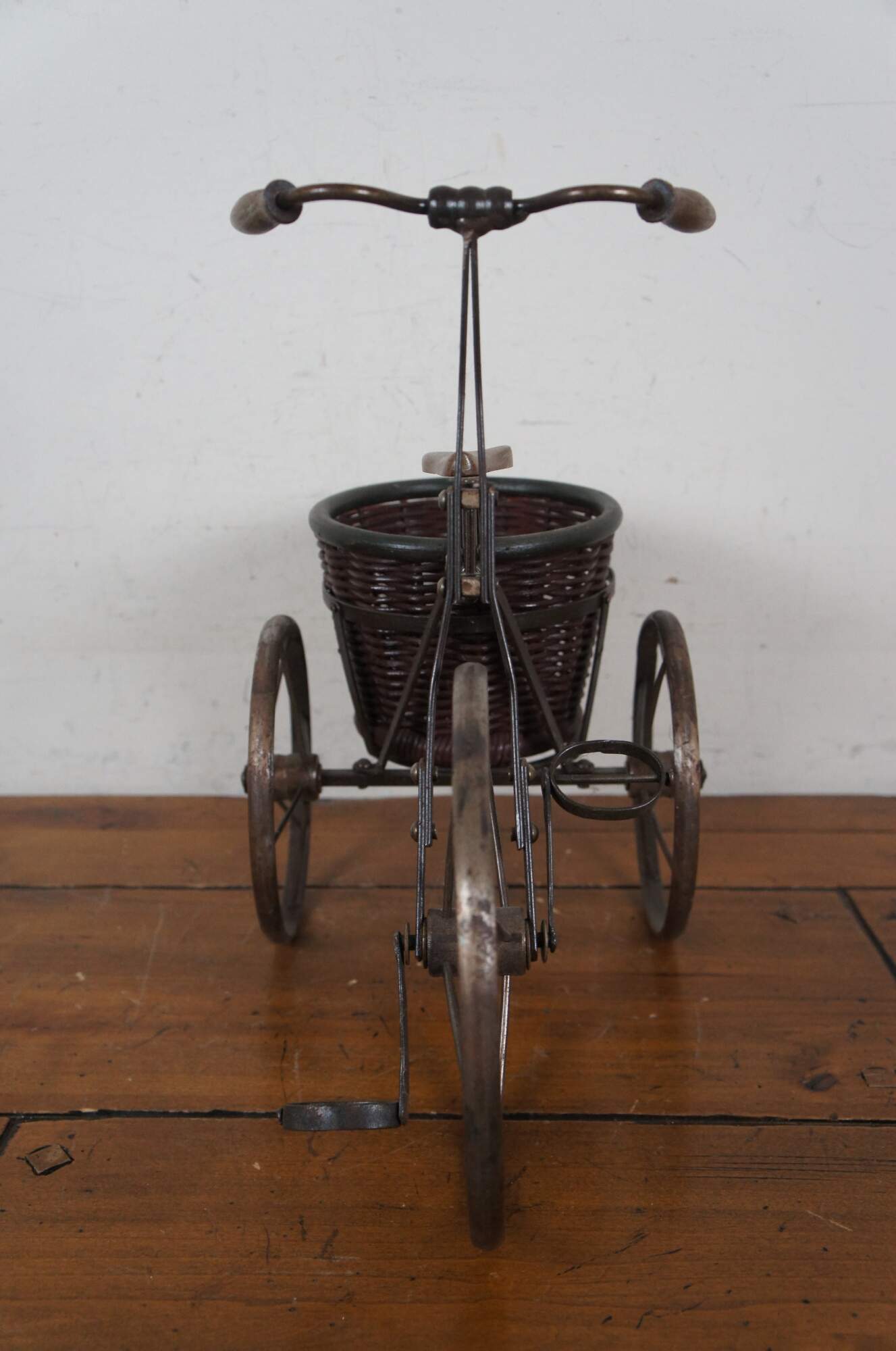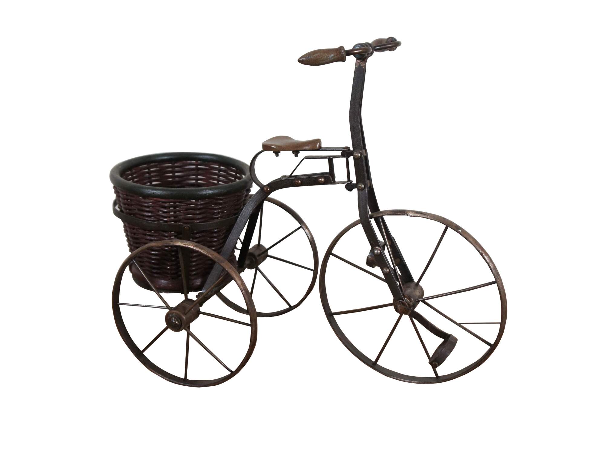 Late 20th century metal tricycle shaped plant stand with wooden handles and seat, and cylindrical woven planter basket with green painted rim.