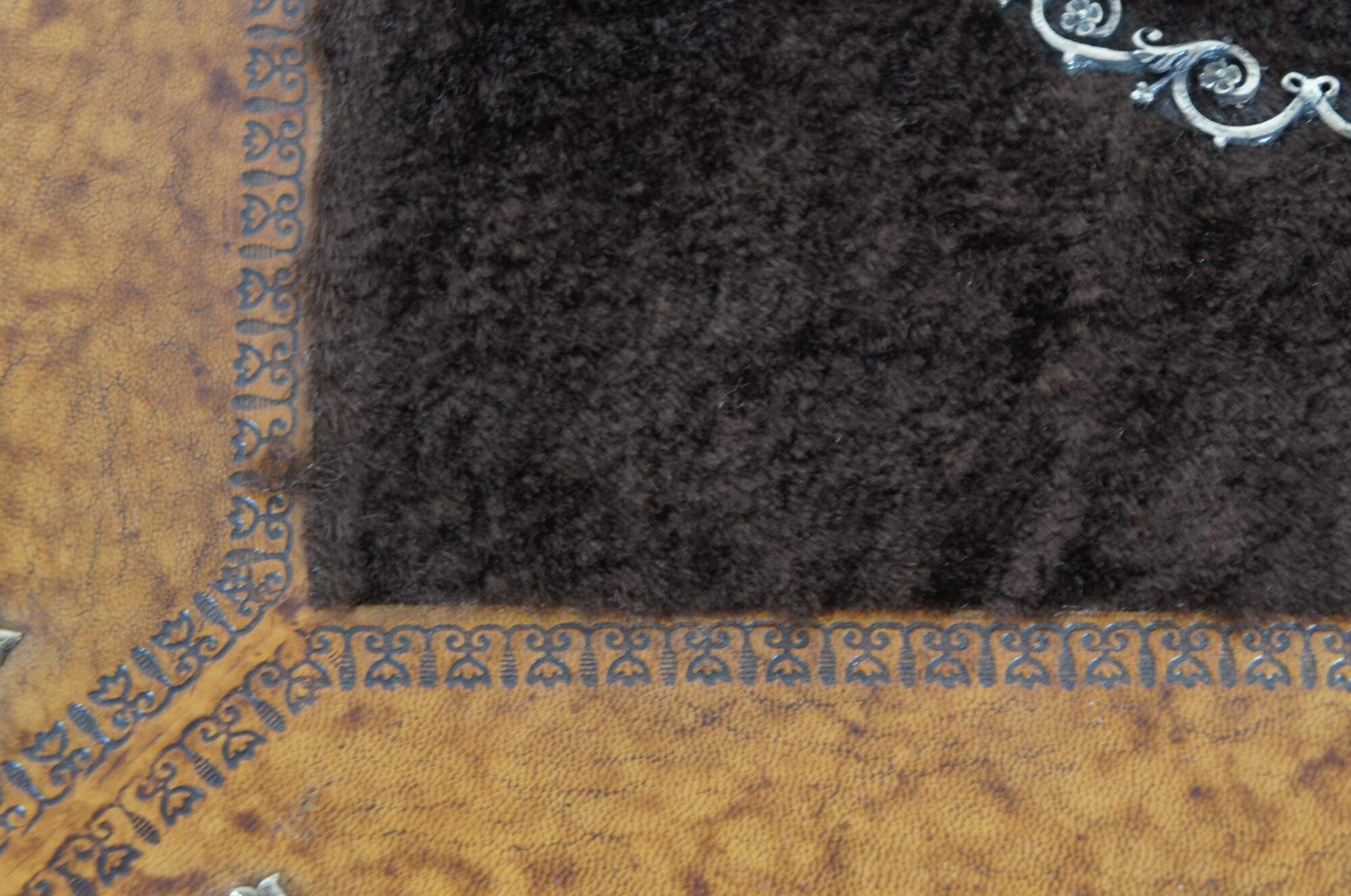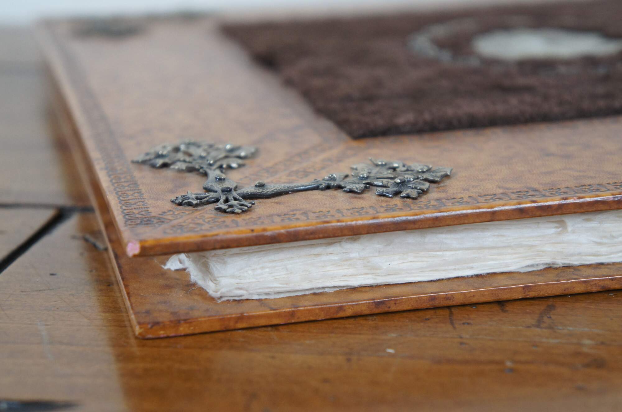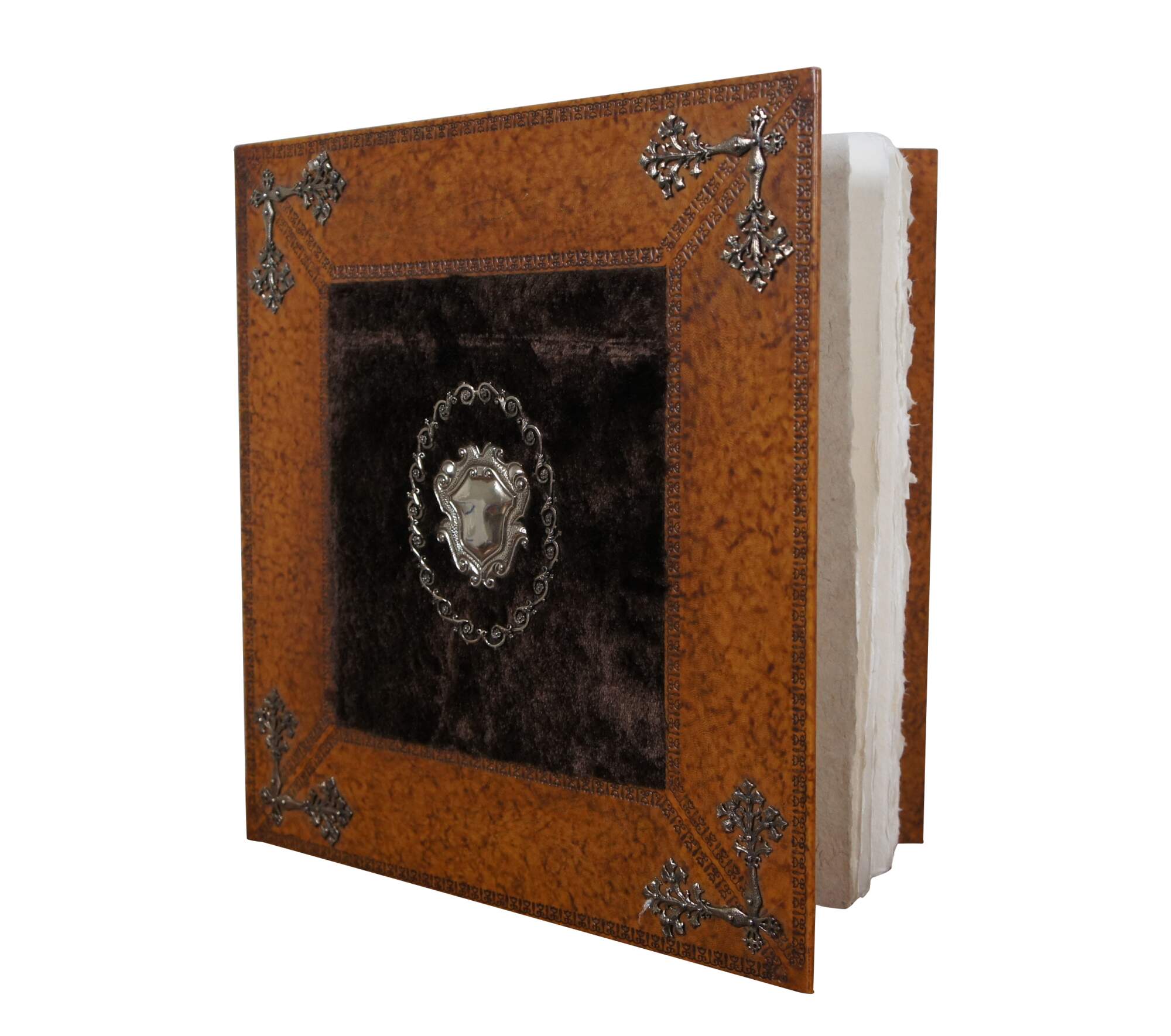 Vintage late 20th century Maitland Smith French Regency style photo album / scrap book. Bound in mottled tooled leather with panel of faux fur at the center, and accented with a shield and floral silver plate appliques. Raw edged blank pages.