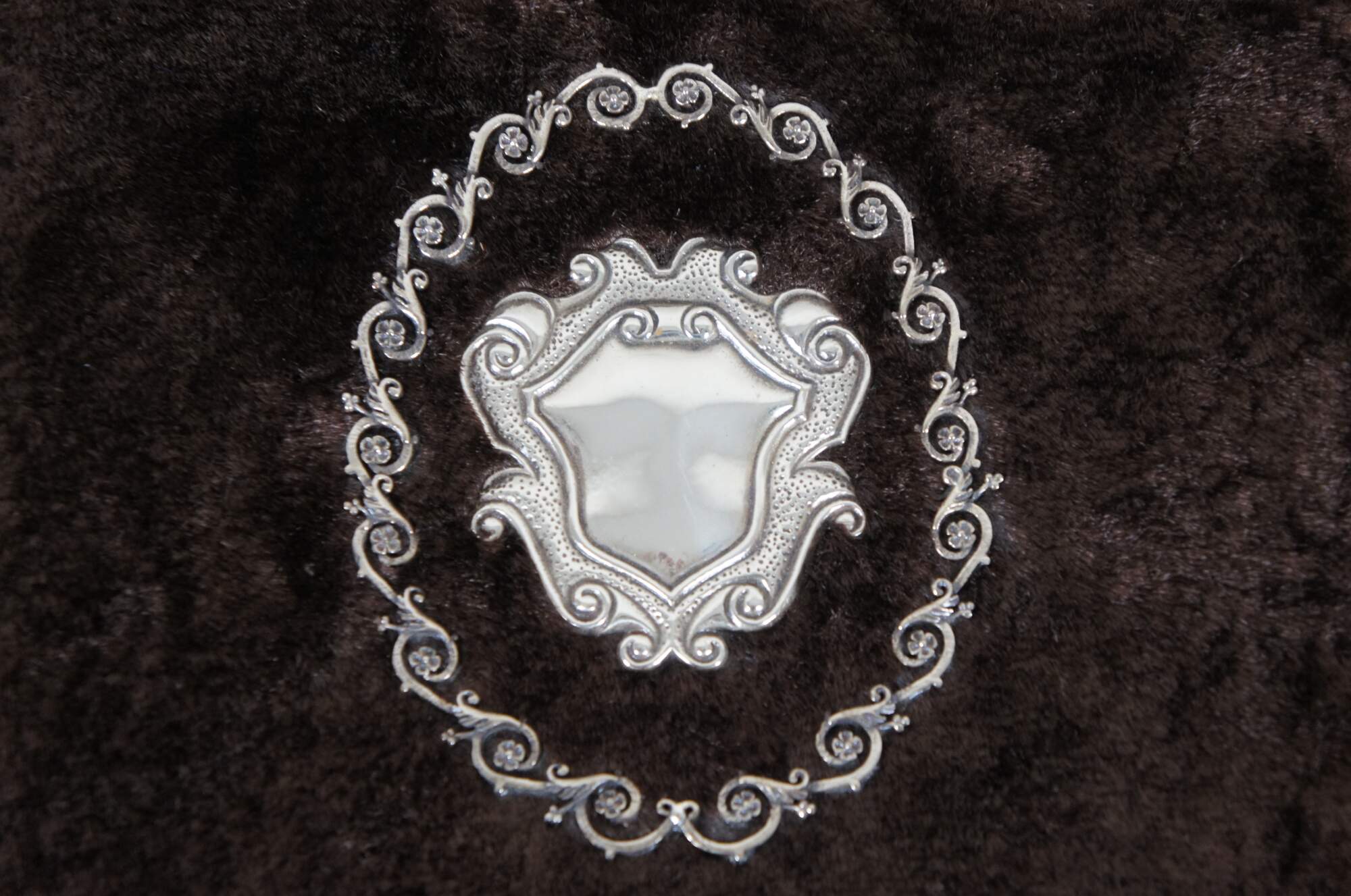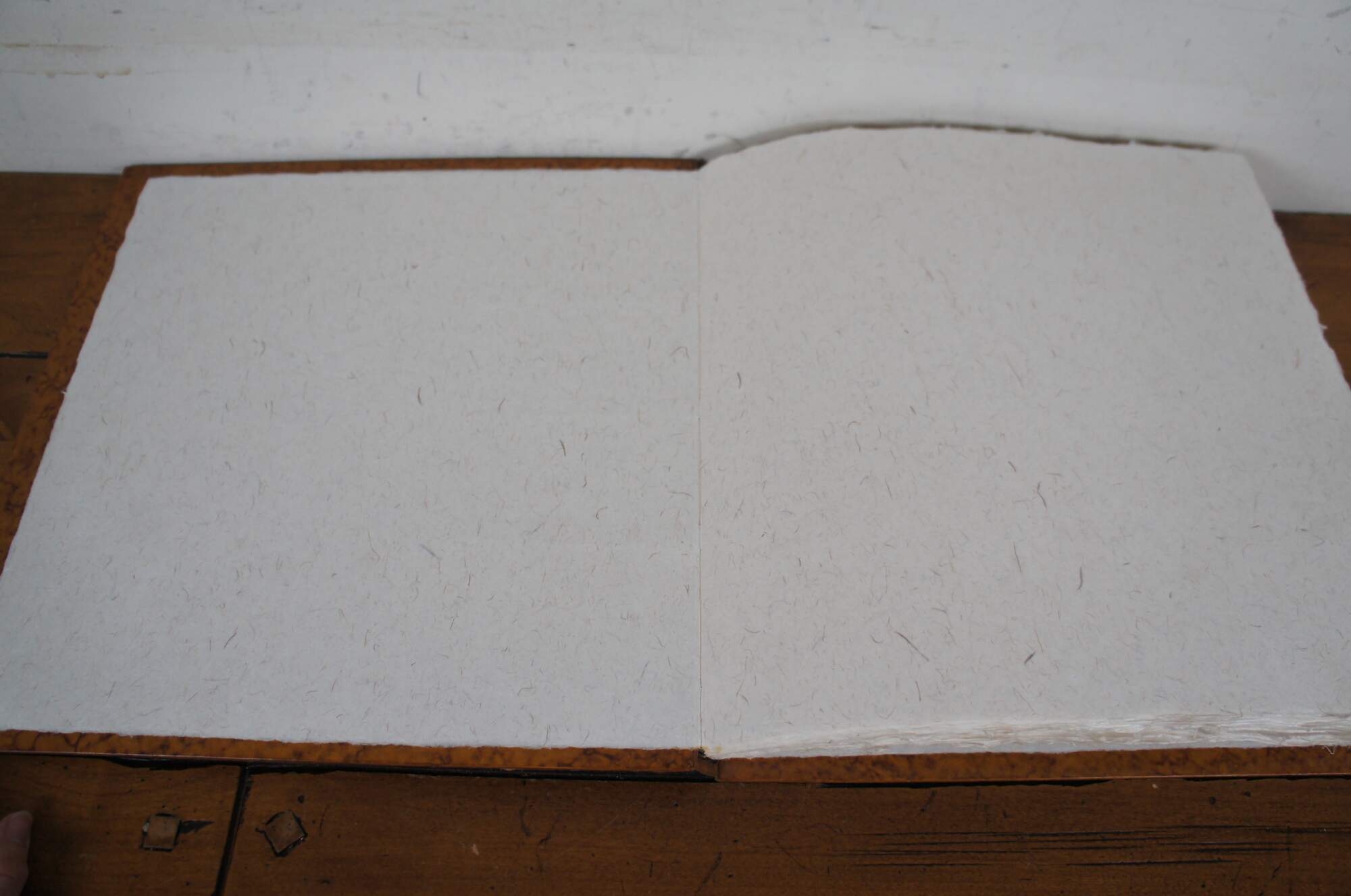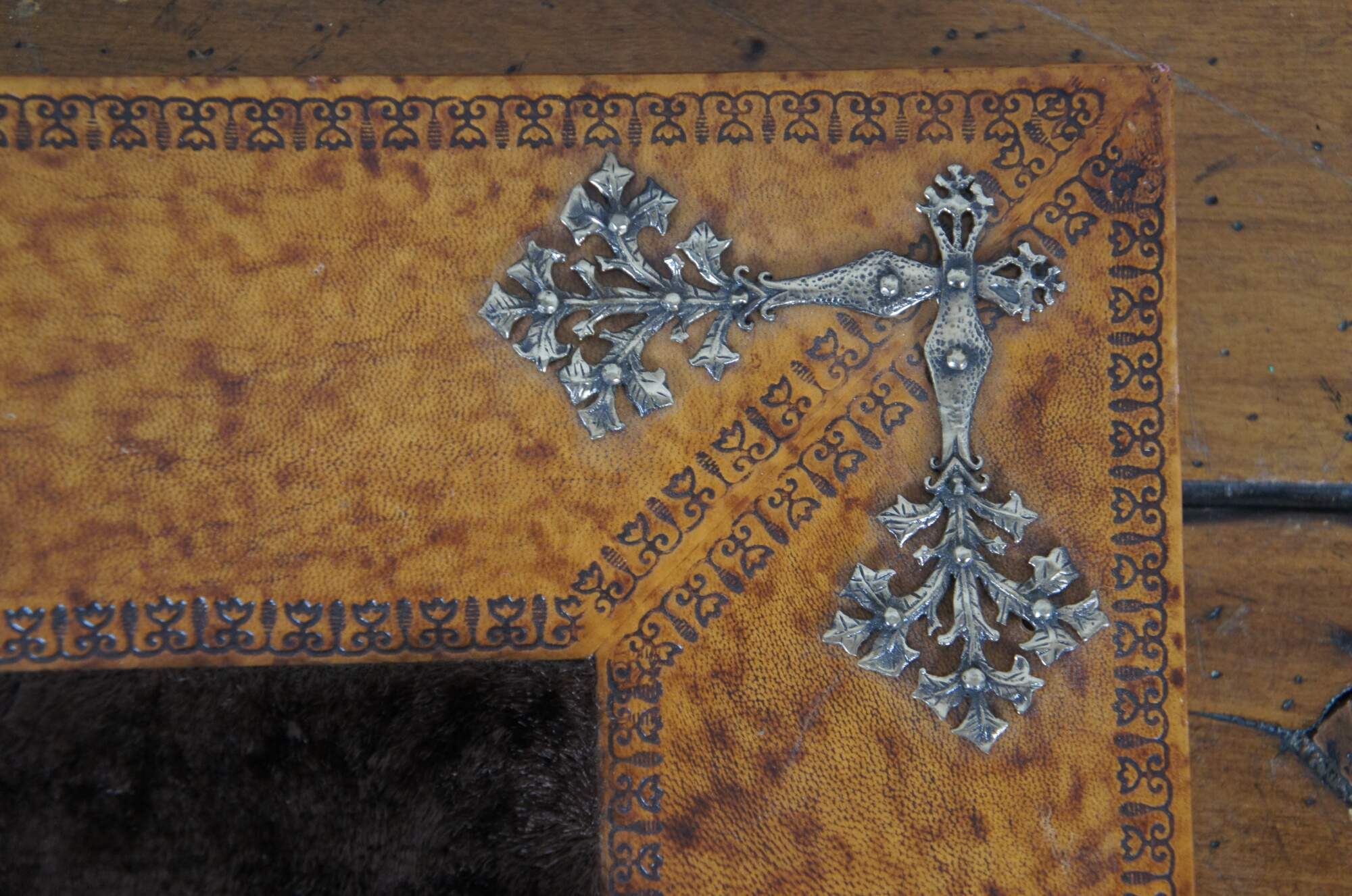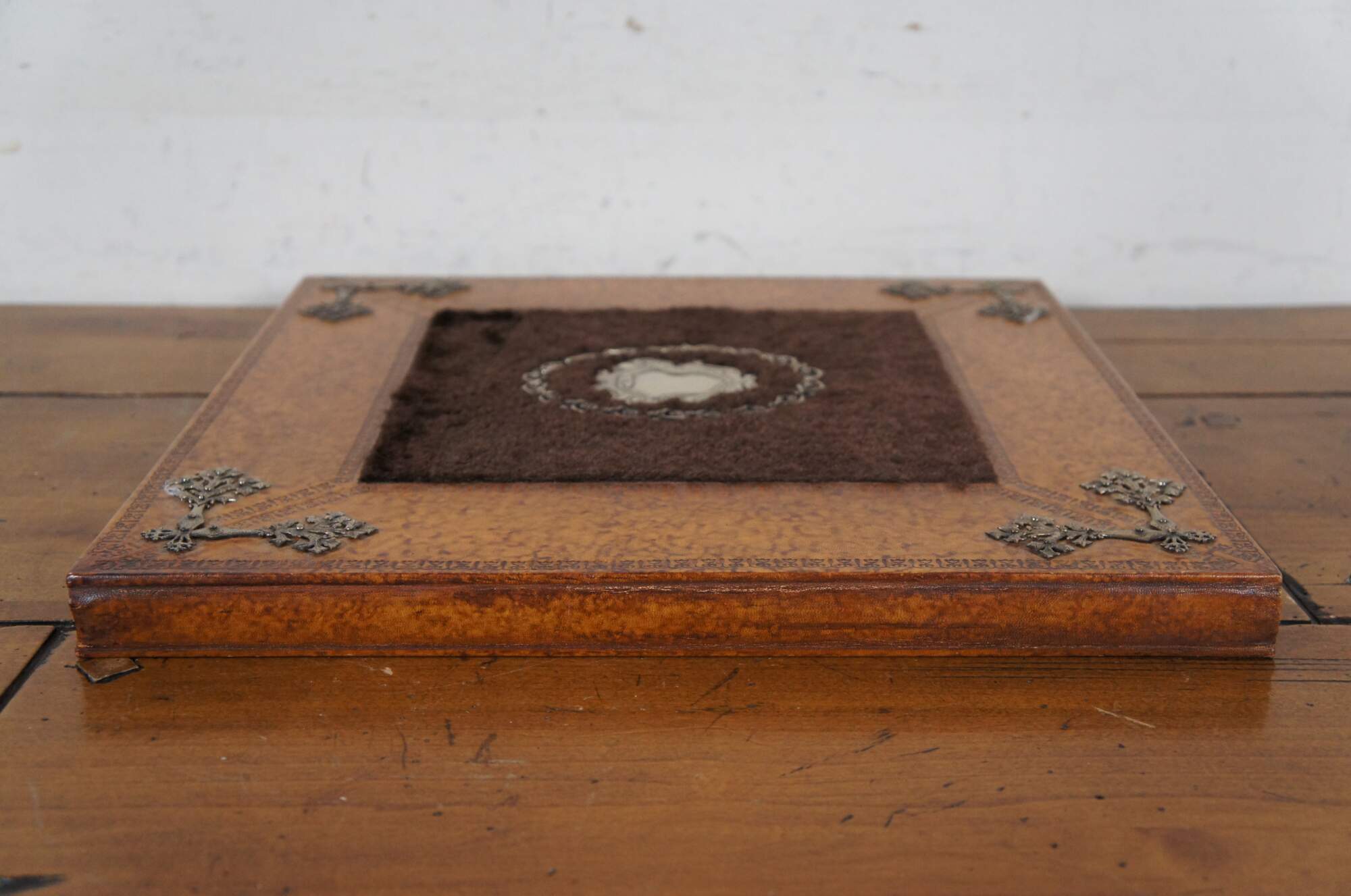Vintage late 20th century Maitland Smith French Regency style photo album / scrap book. Bound in mottled tooled leather with panel of faux fur at the center, and accented with a shield and floral silver plate appliques. Raw edged blank pages.