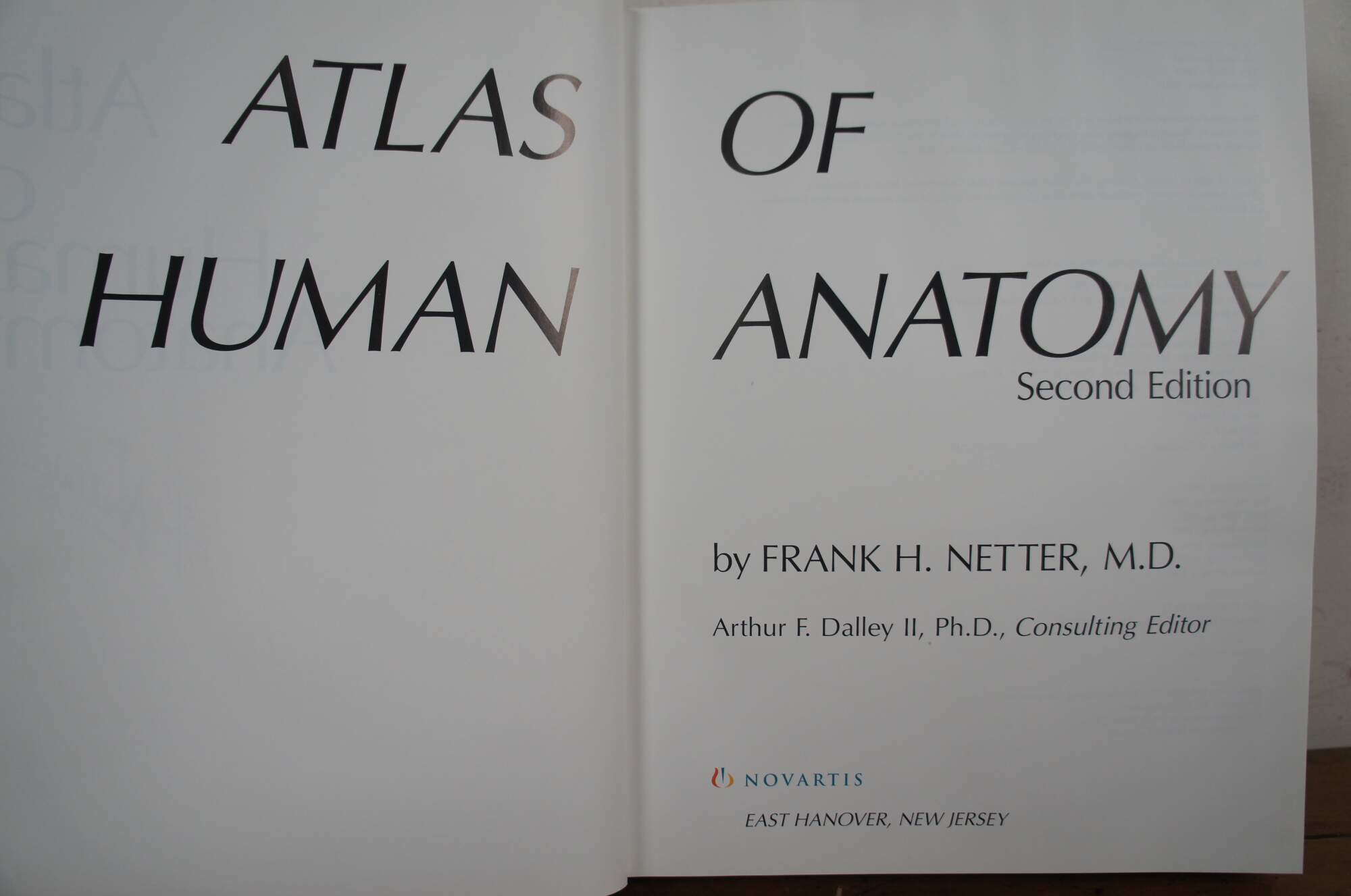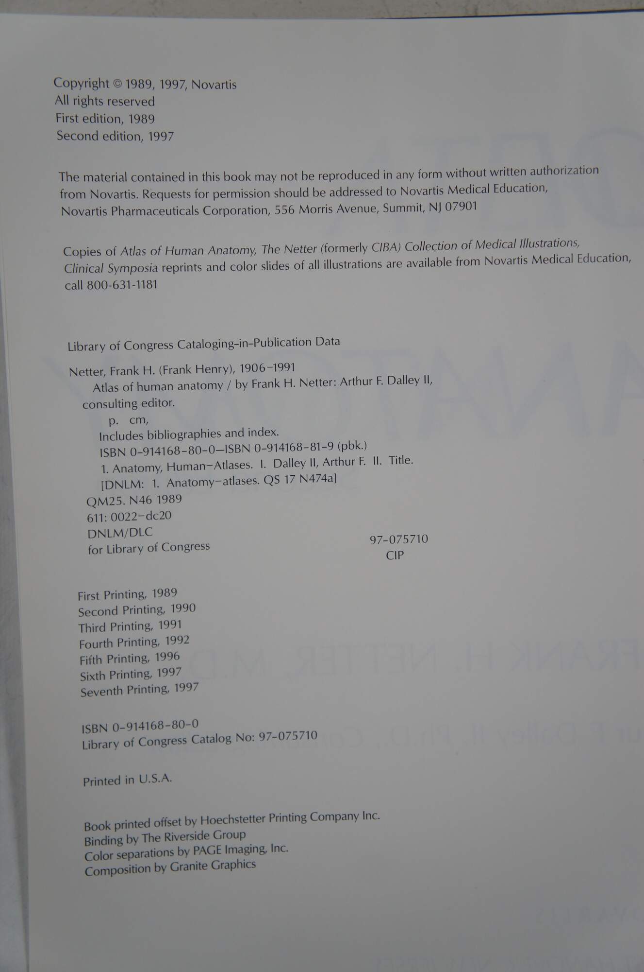 Atlas of Human Anatomy - Second Edition by Frank H. Netter, M.D. - Arthur F. Dalley II, Ph.D., Consulting Editor - published by Novartis, East Hanover, New Jersey, 1997 - Seventh Printing - ISBN 0-914168-80-0 - Printed in USA. Hard bounc cloth cover with marbled spine; no jacket.