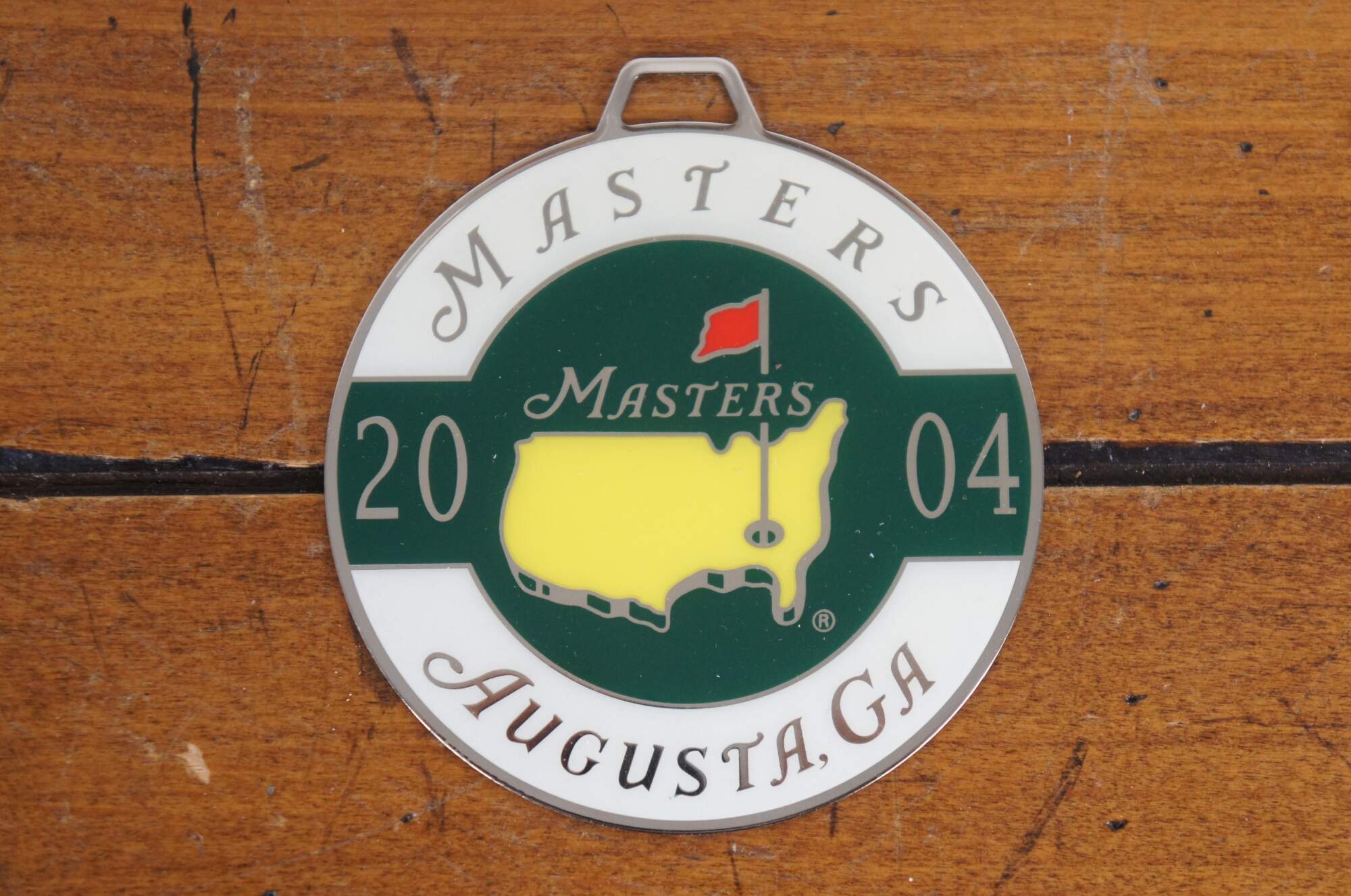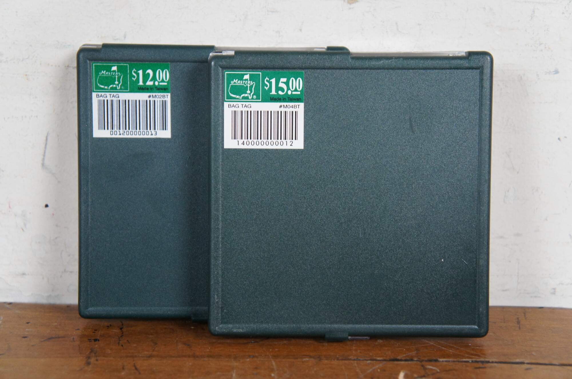 Pair of metal golf bag tags from the 2002 and 2004 PGA Masters Tournament in Augusta, GA. Includes green leather buckle straps and plastic cases.