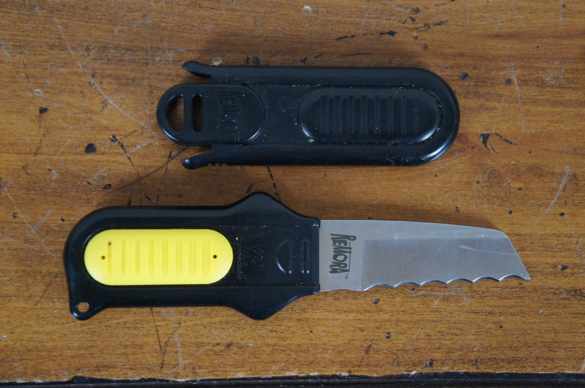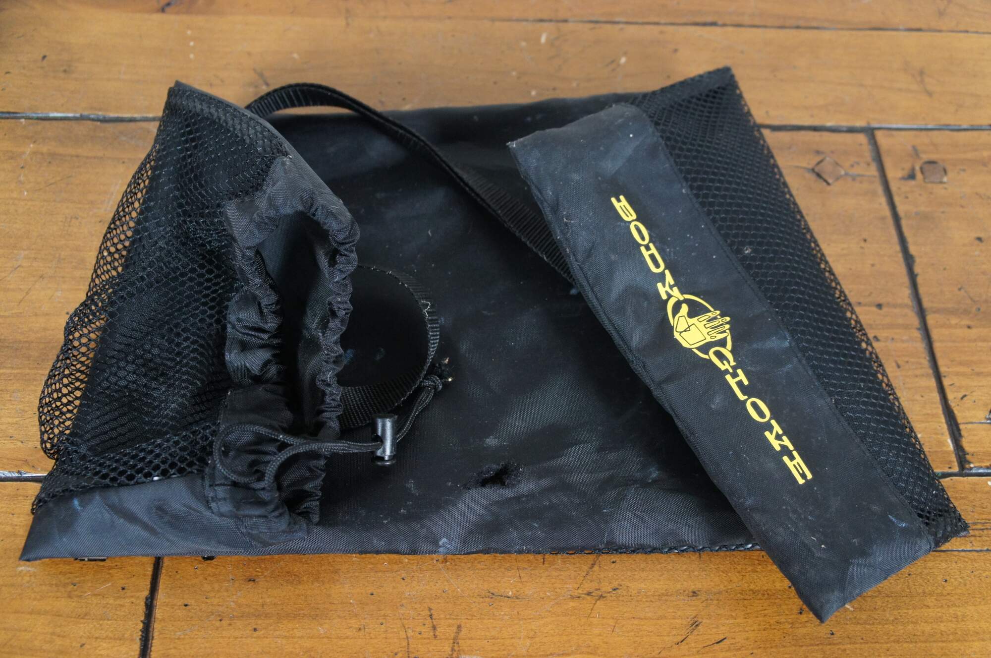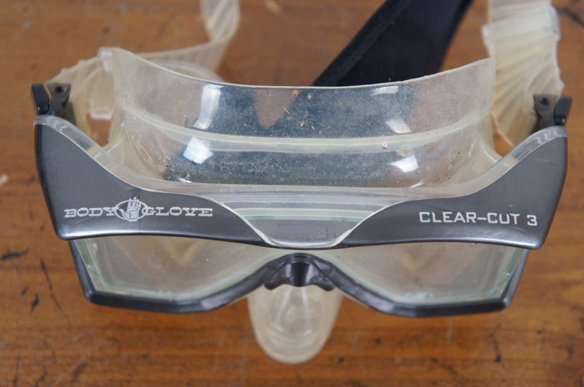 Six piece set of adult snorkel gear. Fishtail swin fins Size 42-43 / 8-9. Made in Italy. Body Glove Desert Dry snorkel and Clear-Cut 3 goggles / mask. Remora Underwater Kinetics, Hydralloy scuba dive knife and sheath. Includes Body Glove drawstring gear bag.
