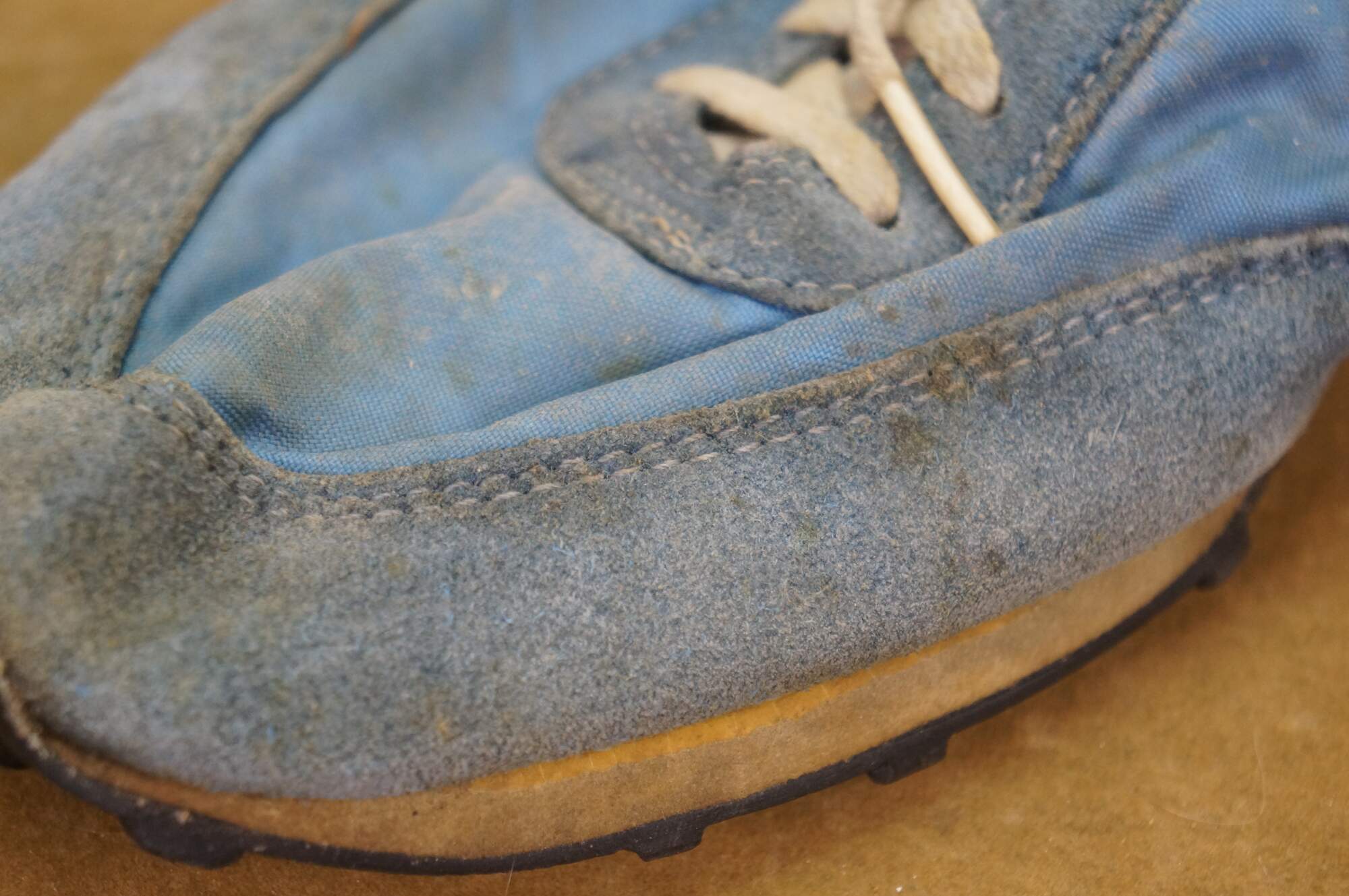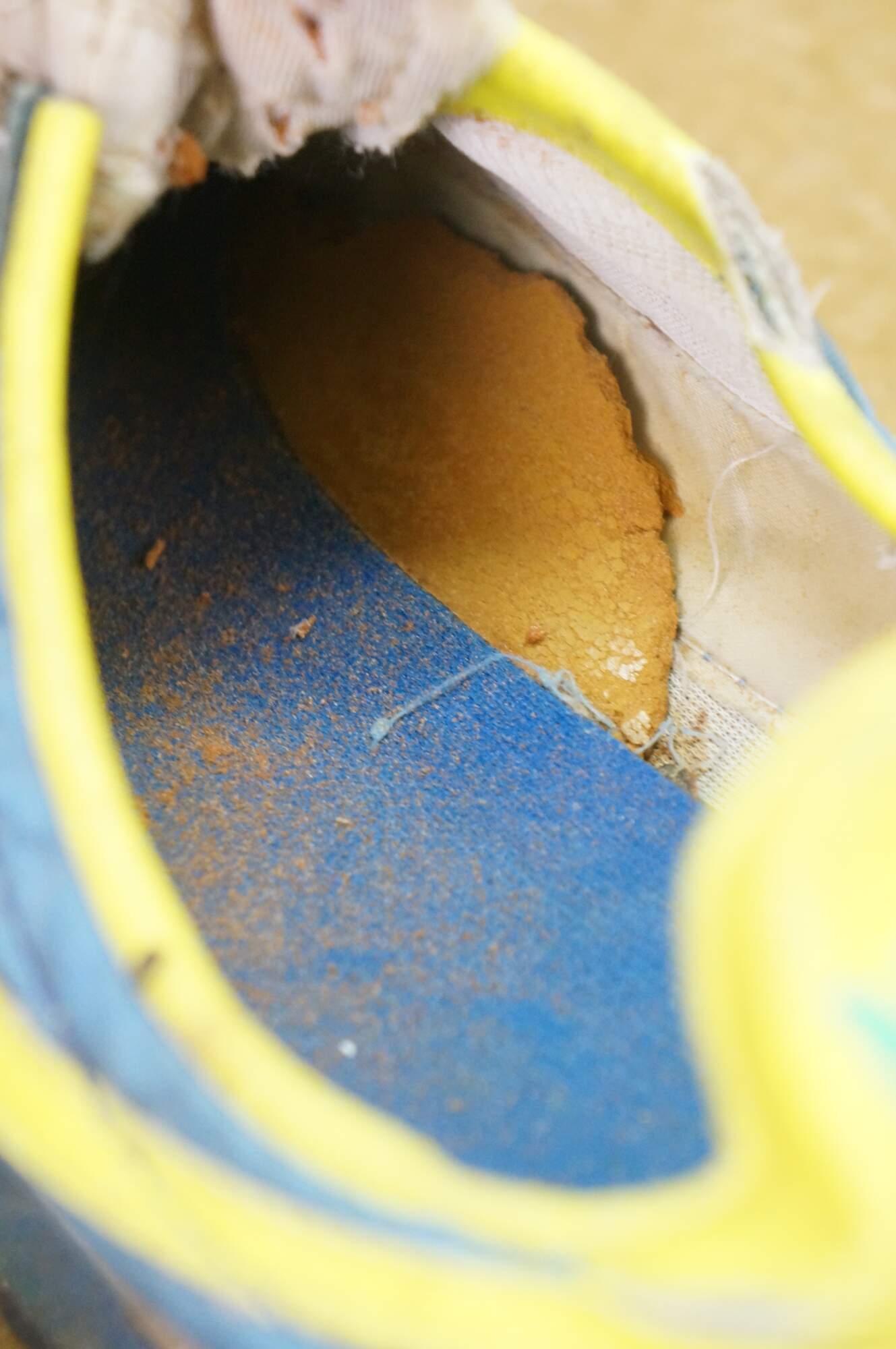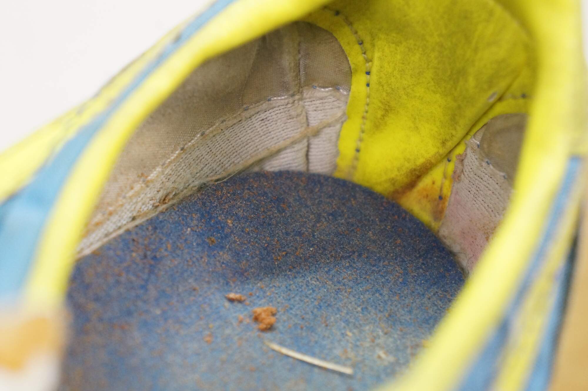 Wear and distressing from age and use; some frayed fabric/crumbling insole/dry rot.