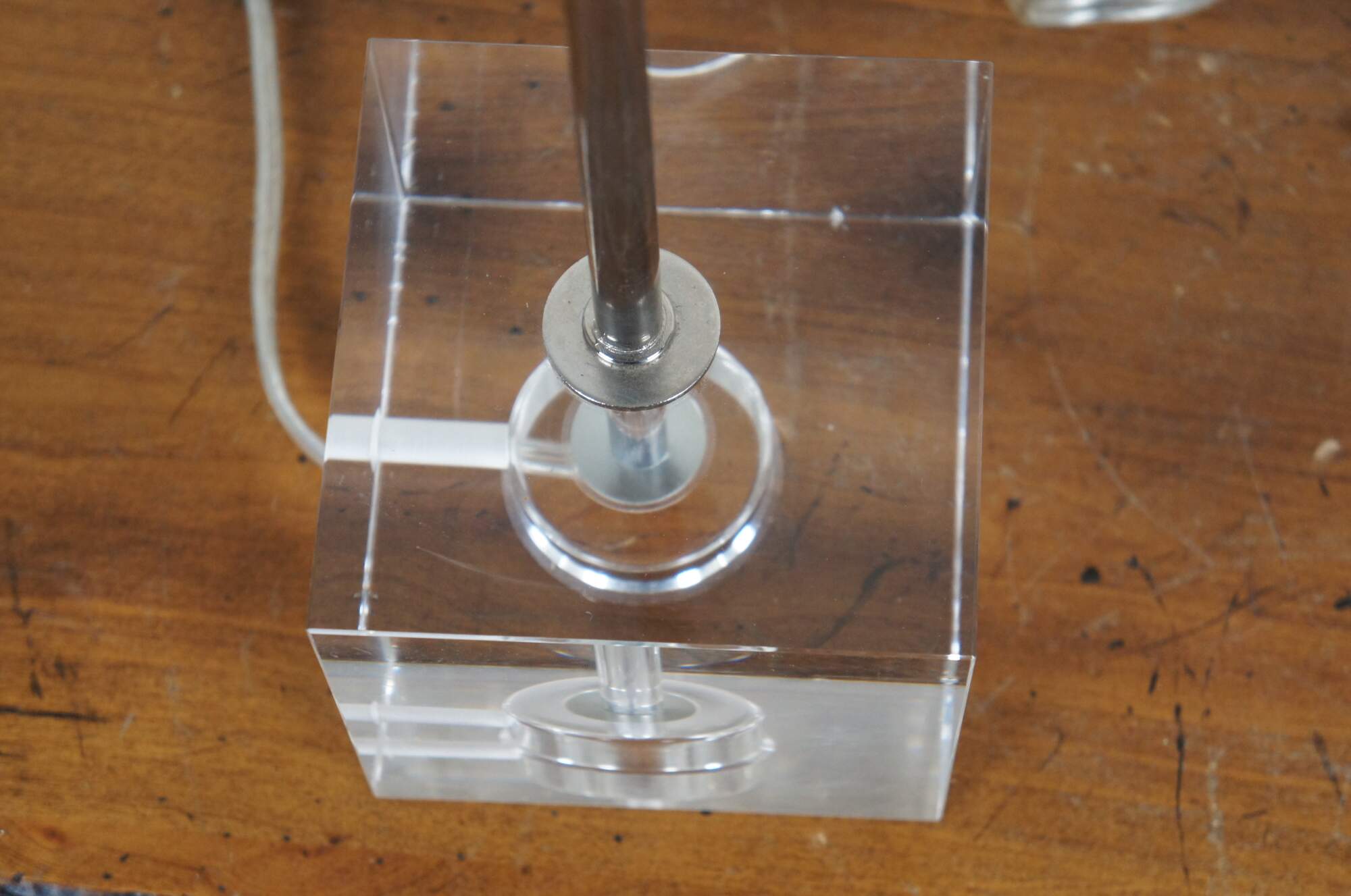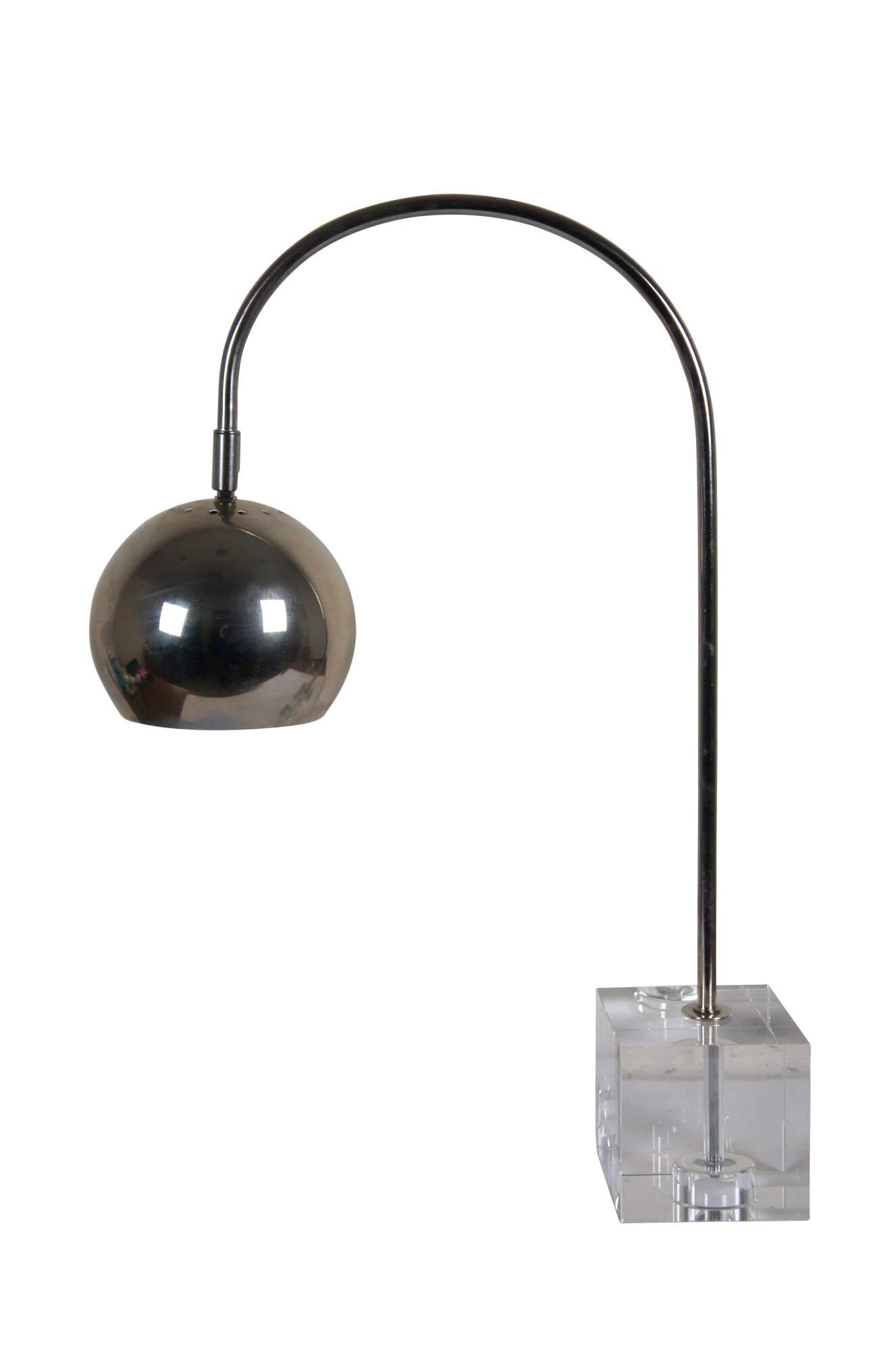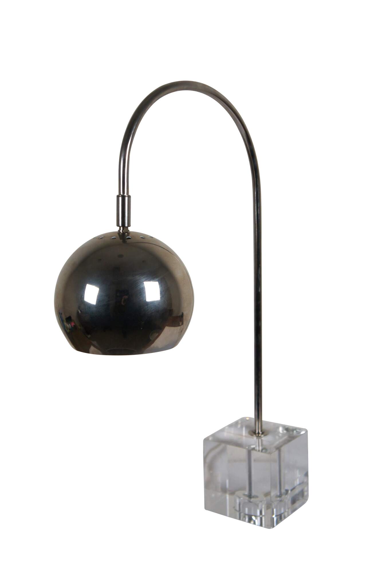 Late 20th century mid century modern style / atomic / modernist desk / table lamp featuring a cubic lucite base supporting a chrome stem arching to an orb / eyeball shaped shade.