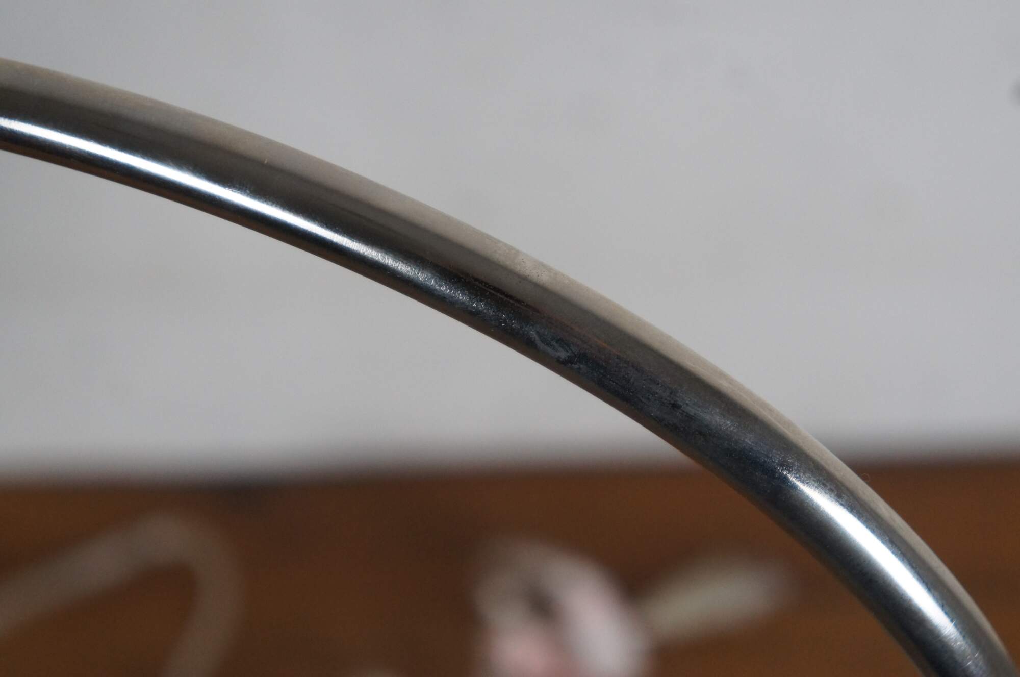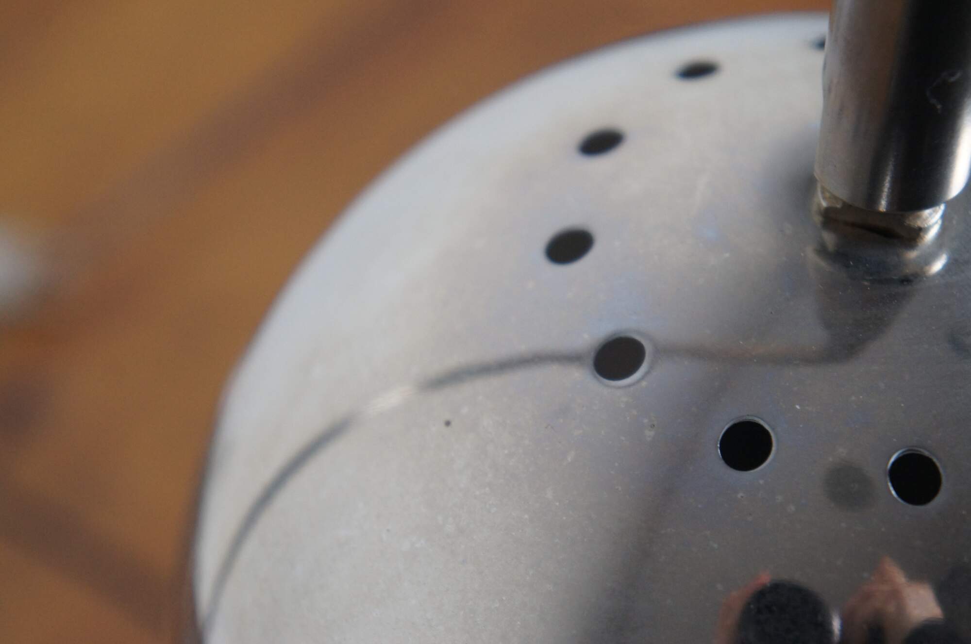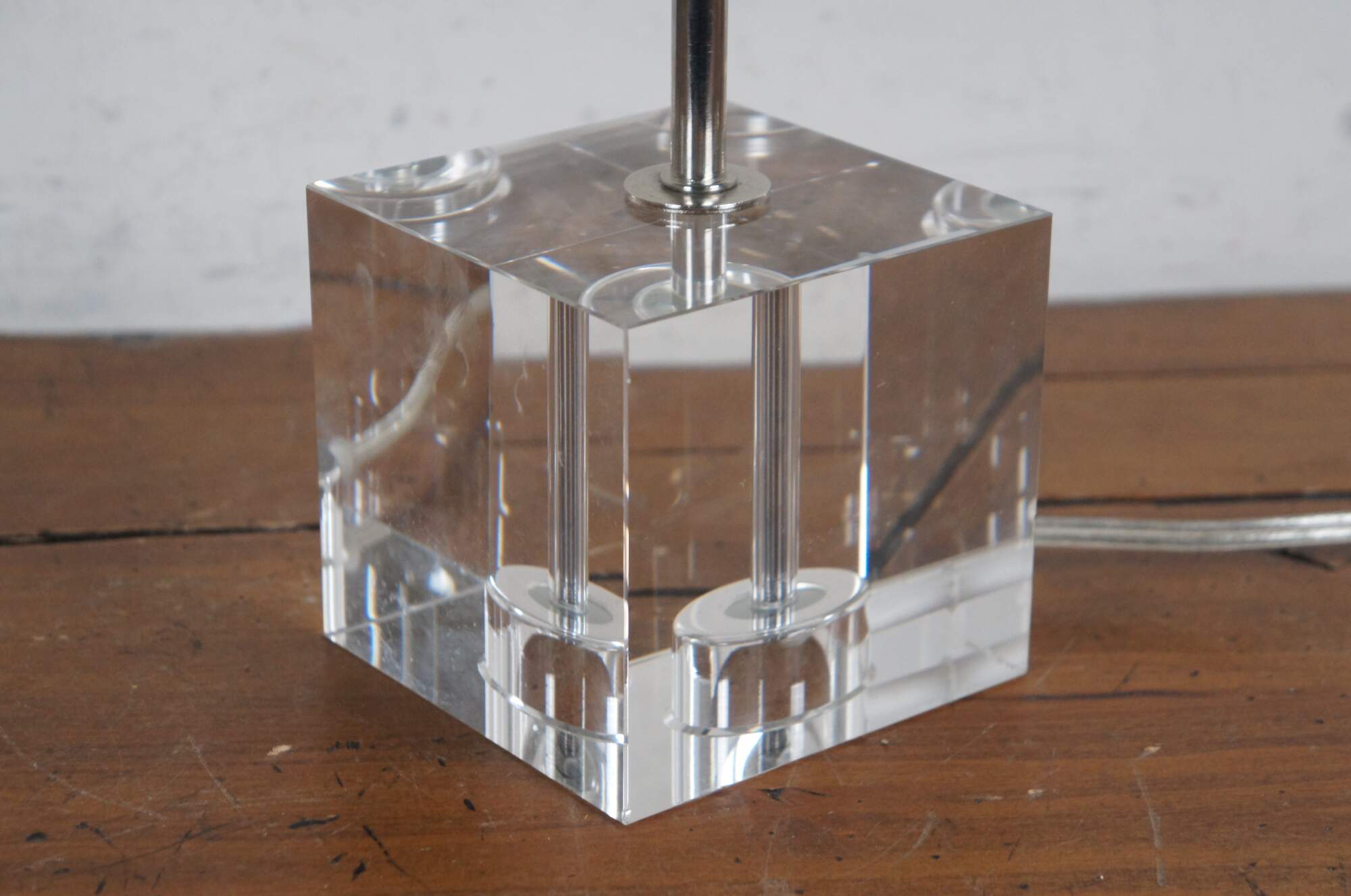 Late 20th century mid century modern style / atomic / modernist desk / table lamp featuring a cubic lucite base supporting a chrome stem arching to an orb / eyeball shaped shade.
