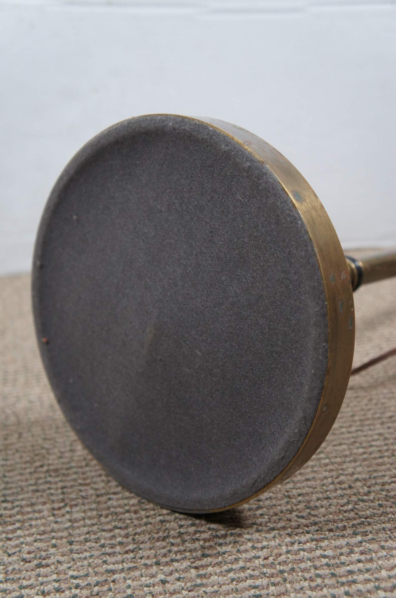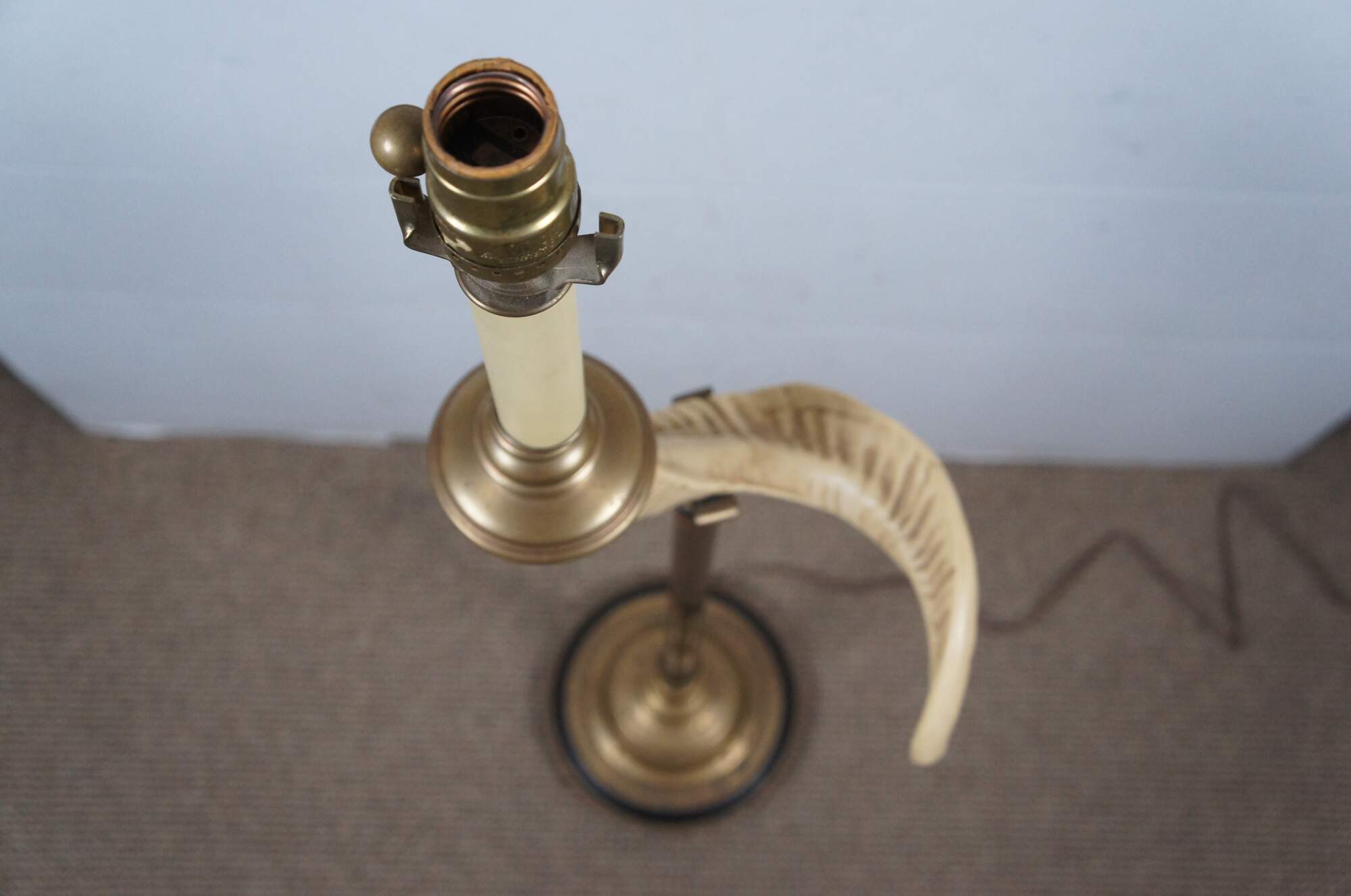 Circa 1970's Chapman Brass floor lamp featuring a round, stepped pedestal base and artificial ram's horn perched on the column body with black accents, leading to a faux candlestick top. Black paper shade with foiled interior. Includes harp and ball finial.