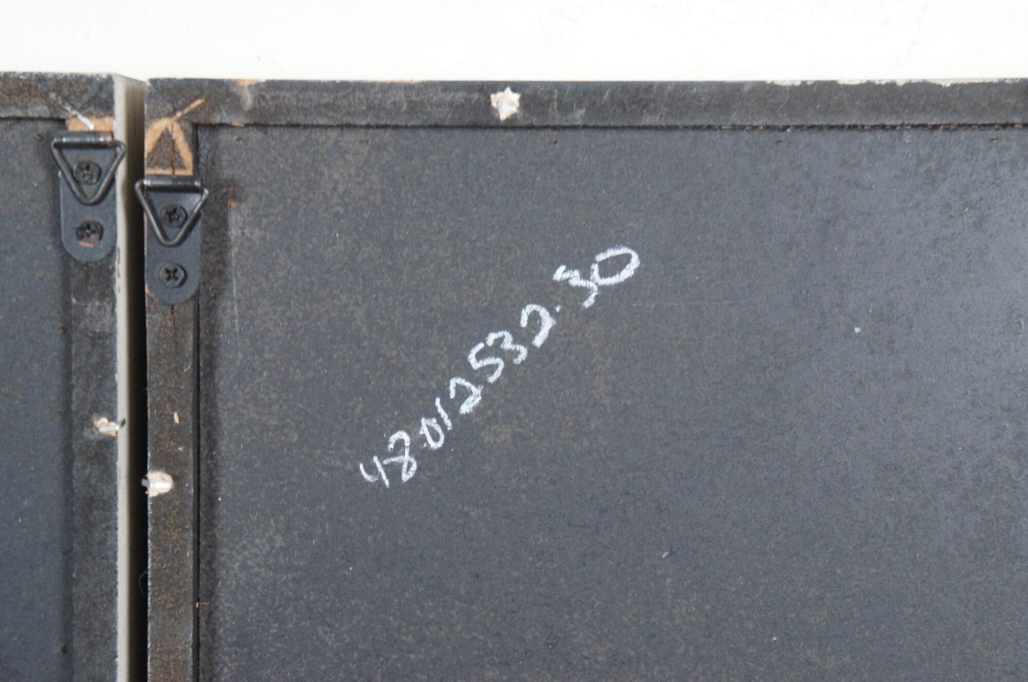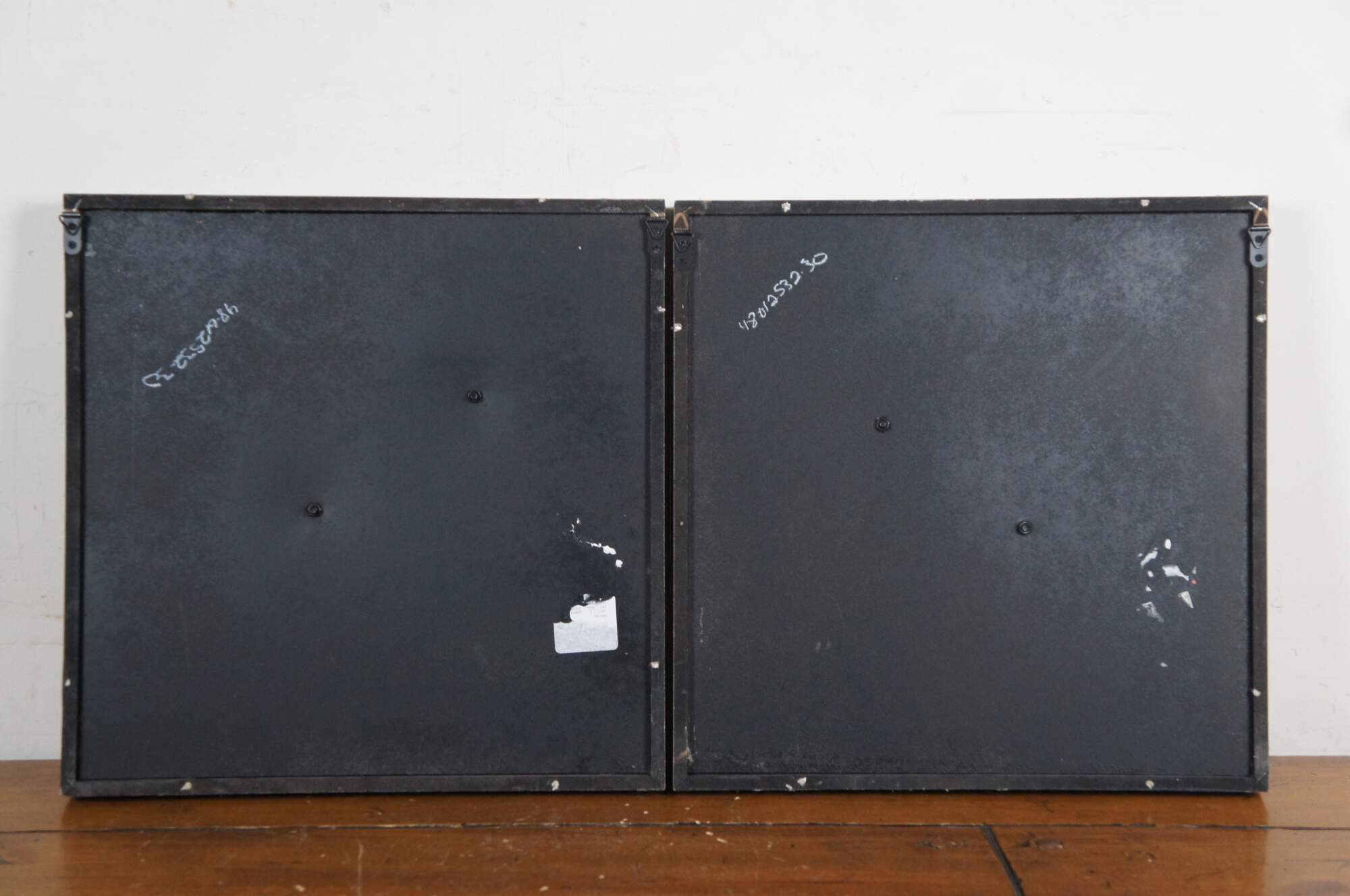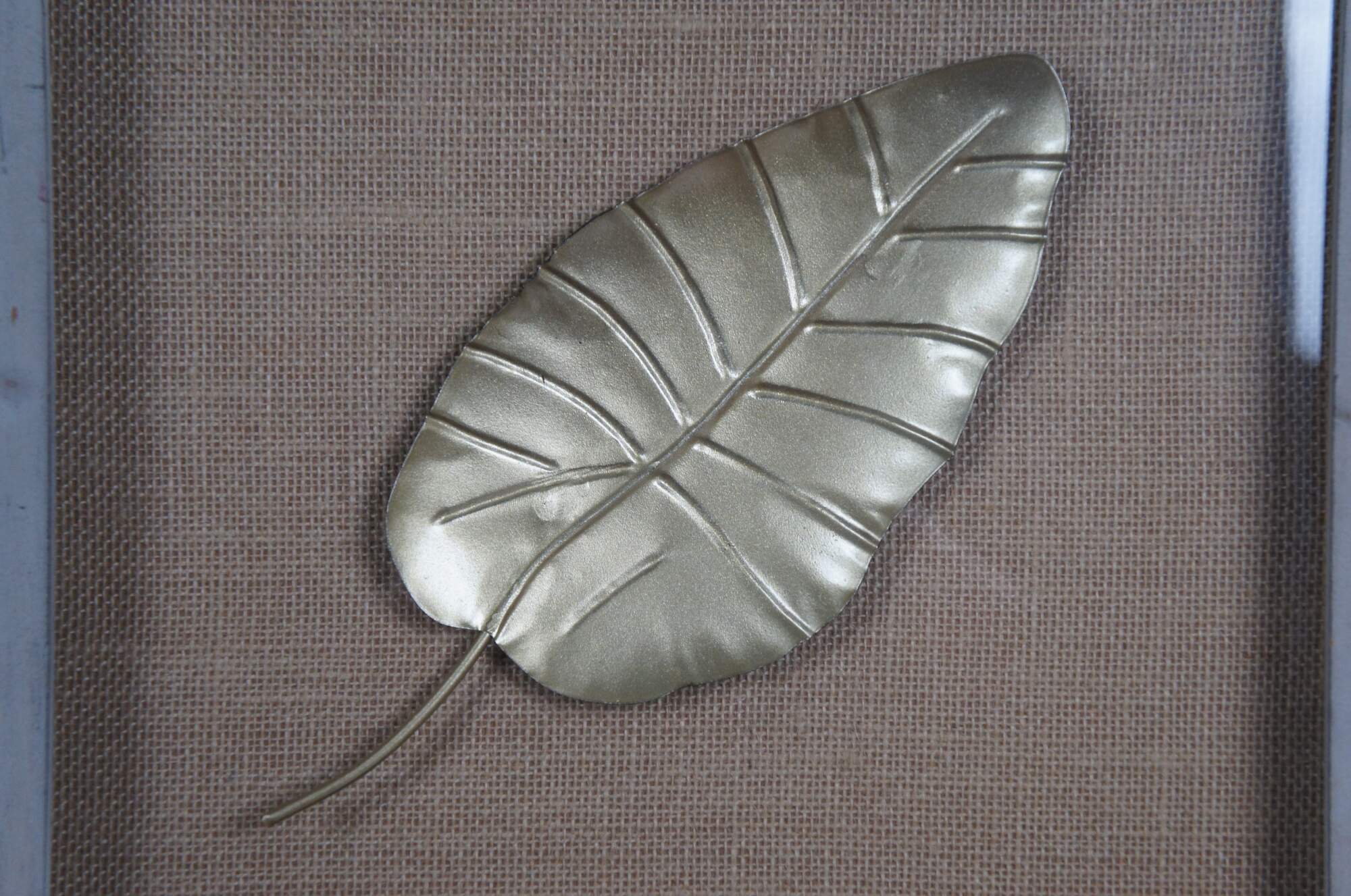 Late 20th century pair of gold / gilt metal leaves set on plain burlap mats in shadowboxes framed in distressed, gray painted wood.