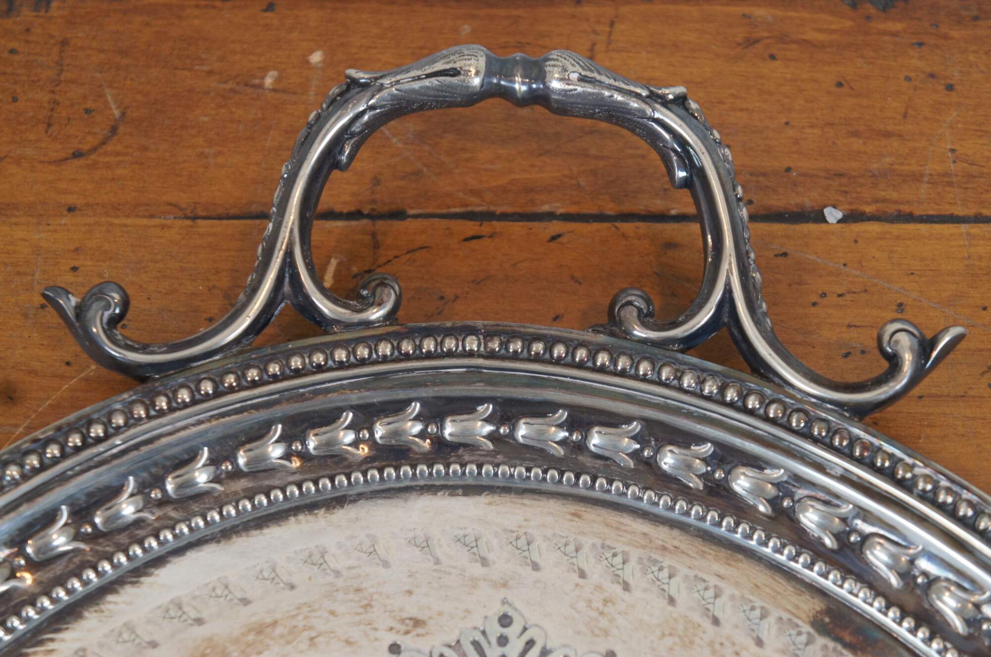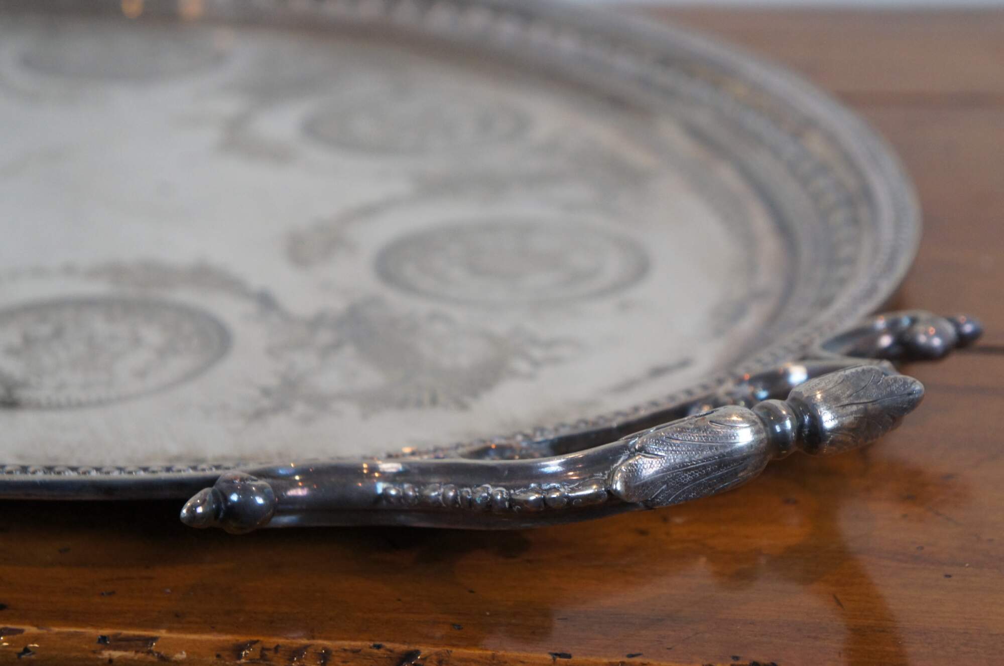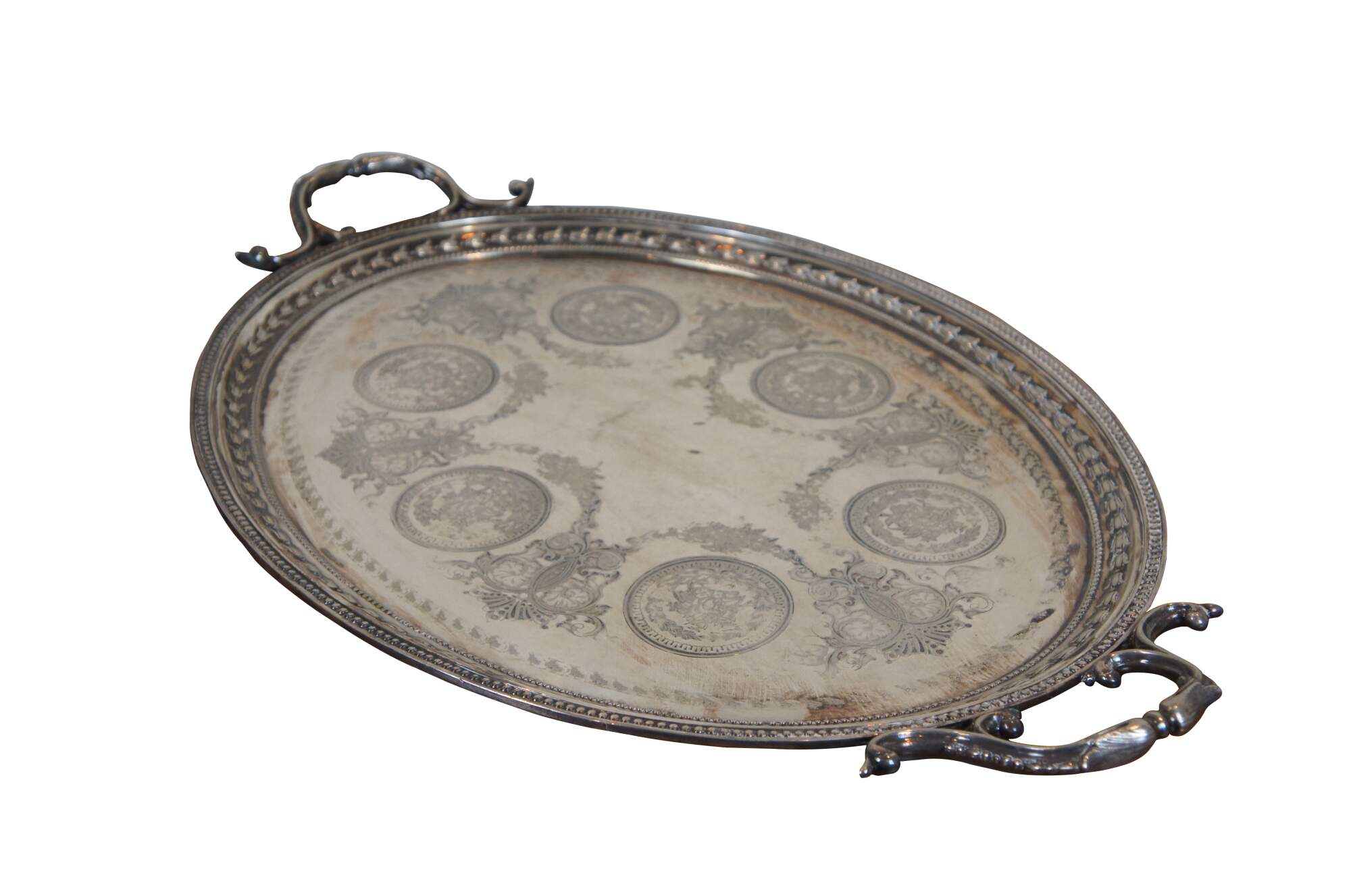 Early 20th century English Roberts & Belk silverplate butler's serving tray, item number 826.. Oval form with floral and beaded edge, scrolling foliate handles, and surface embellished with foliate swags between medallions stamped with roses.