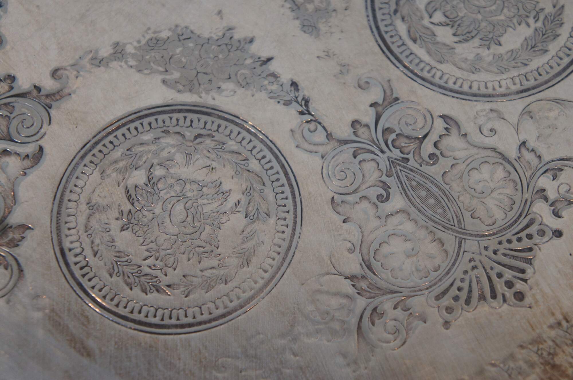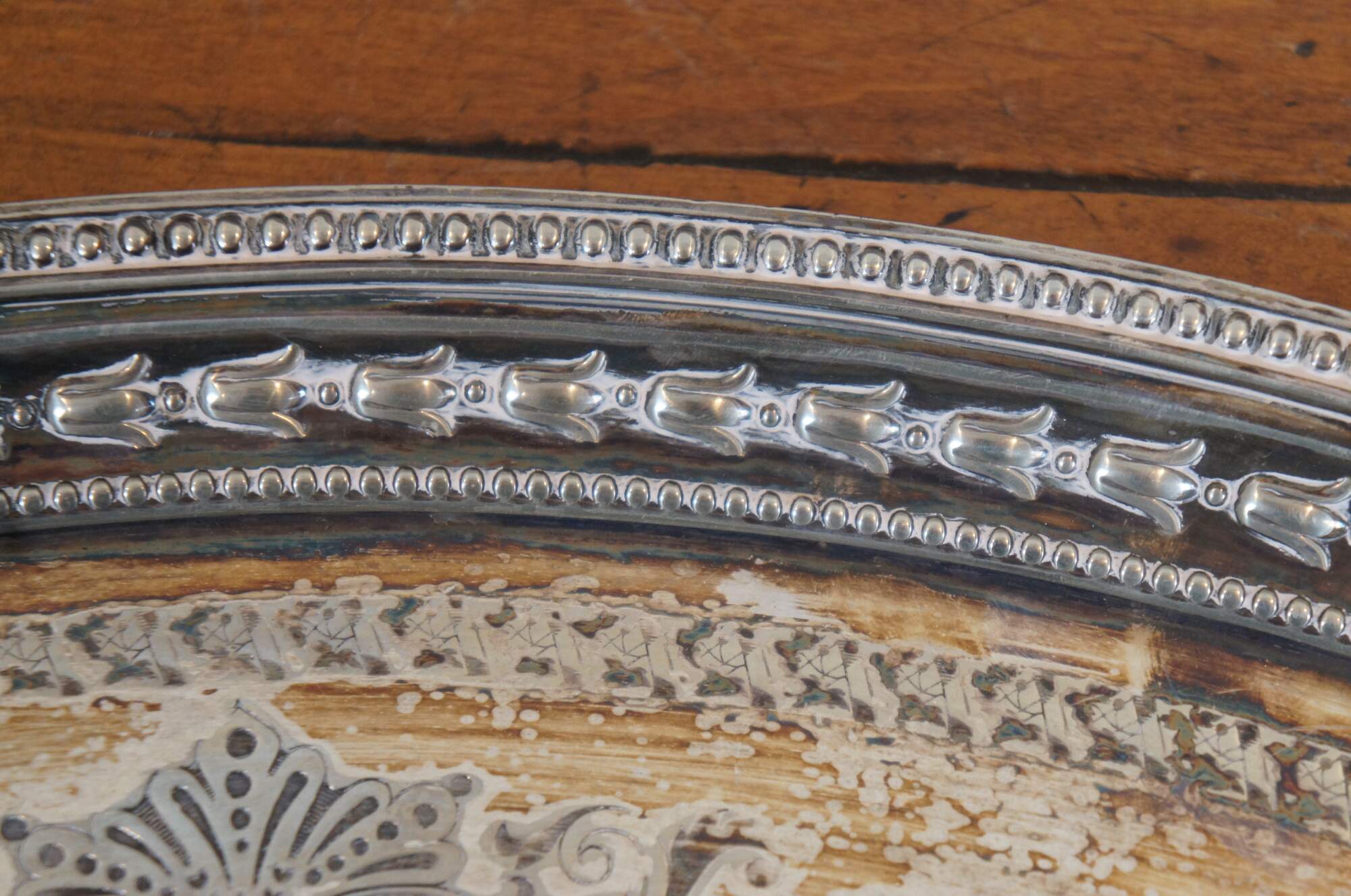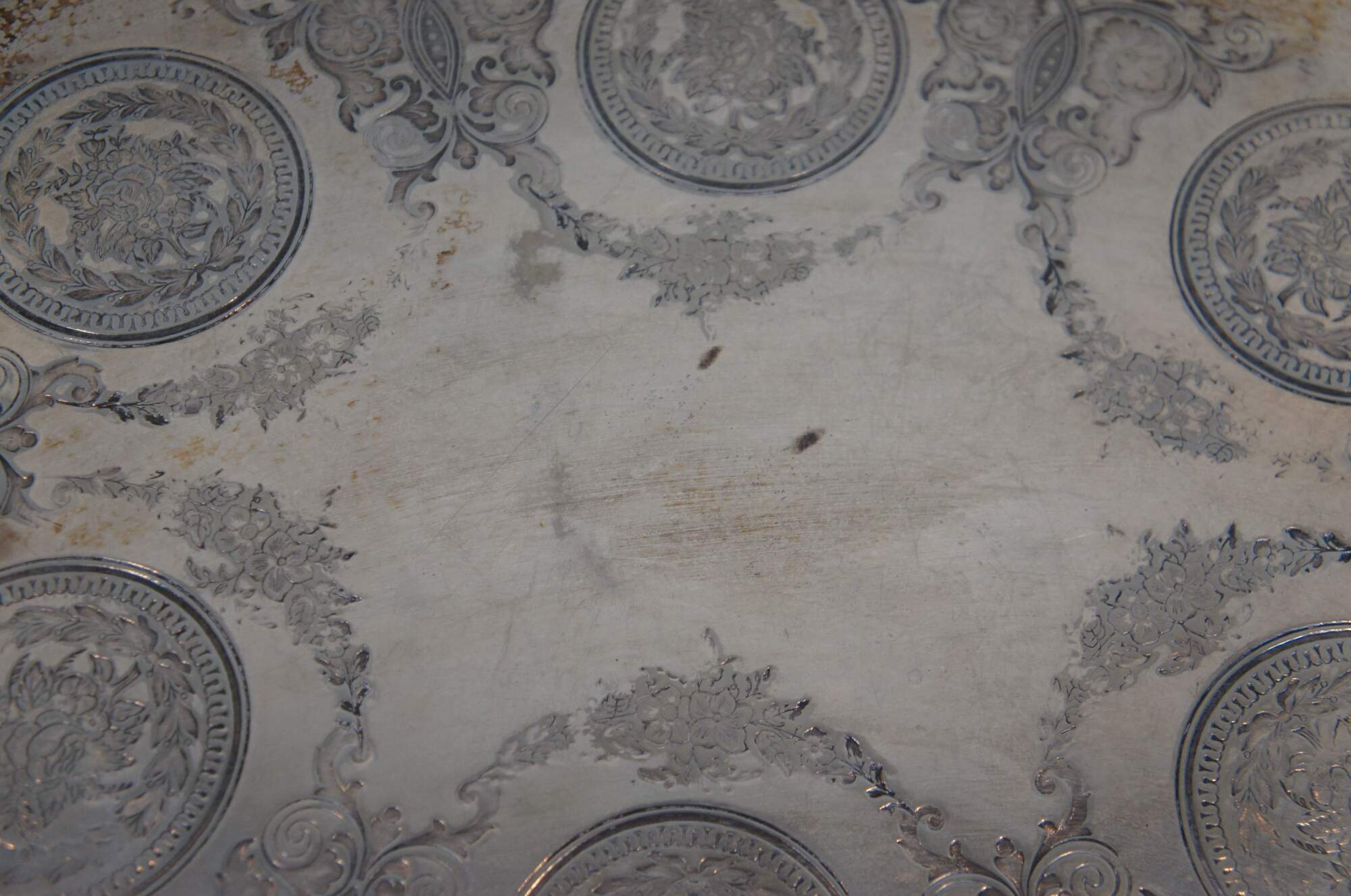 Early 20th century English Roberts & Belk silverplate butler's serving tray, item number 826.. Oval form with floral and beaded edge, scrolling foliate handles, and surface embellished with foliate swags between medallions stamped with roses.