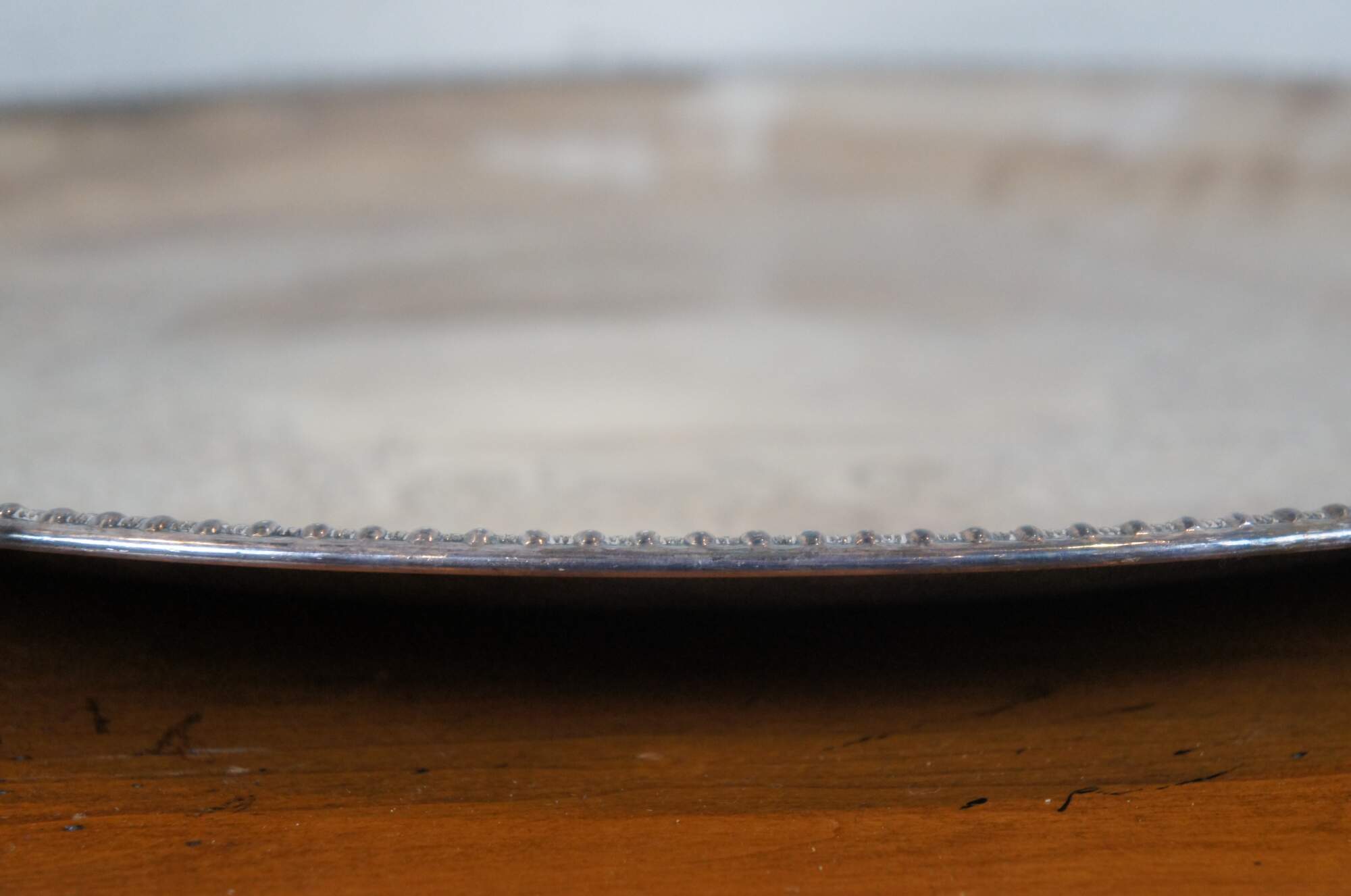 20th century Wilcox International Silver Plate serving platter / tray, in the Brandon Hall pattern. Round form with rope twist edge and surface etched with scrolling foliate/floral motif.