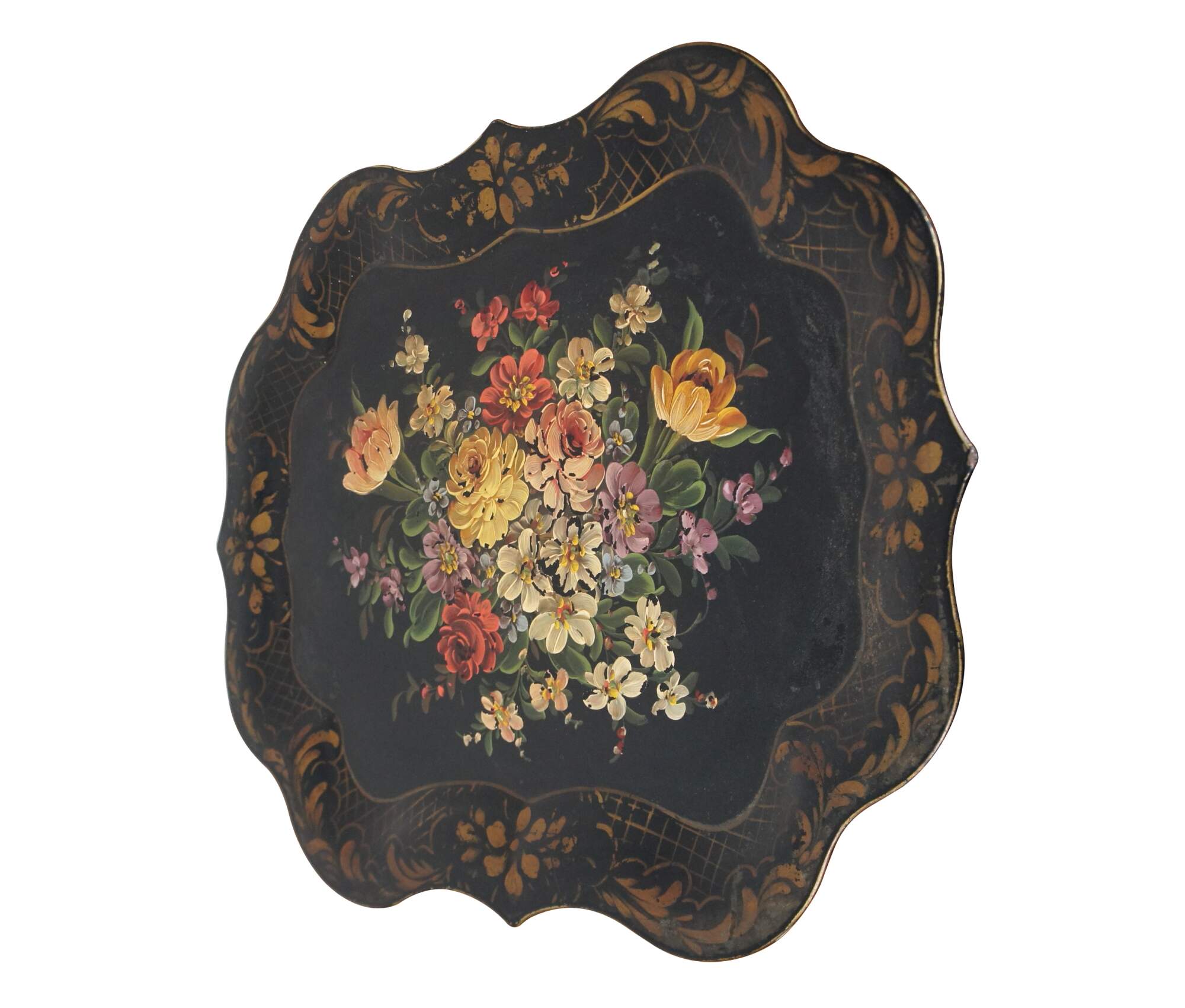 Early 20th century black metal tole serving tray with scalloped Chippendale style edge, hand painted with a pattern in gold around the border and a bouquet of flowers at the center.