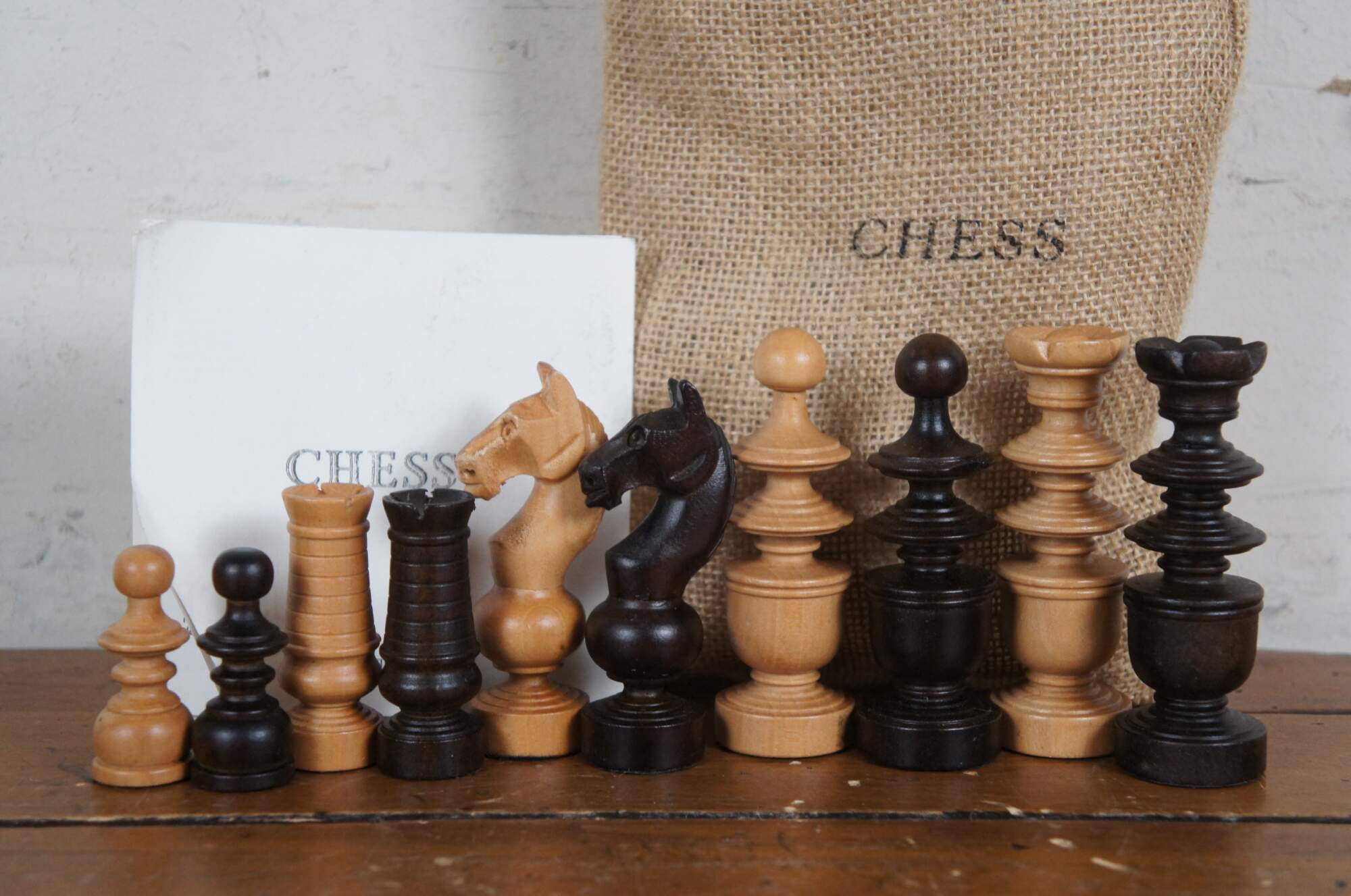 Late 20th century chess / backgammon game set by Restoration Hardware. Reversible, folding, hardwood gameboard case. Wooden game pieces and dice. Leather backgammon cups. Labeled burlap storage bags for pieces and instructions for playing both games. Brass plaque reads "Maison, Nautre / 26. Bd. de Strasbourg, Paris." Made in China.