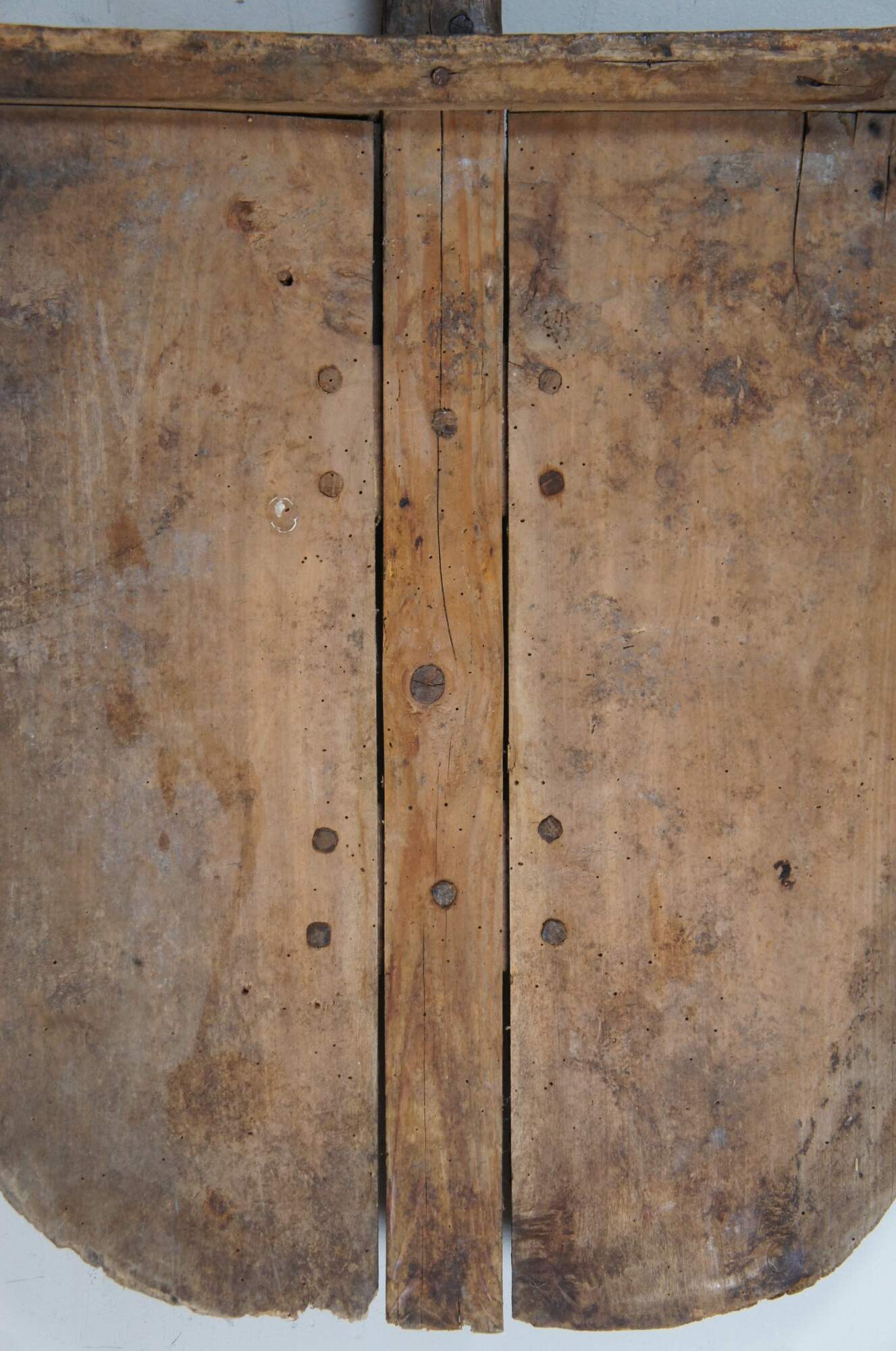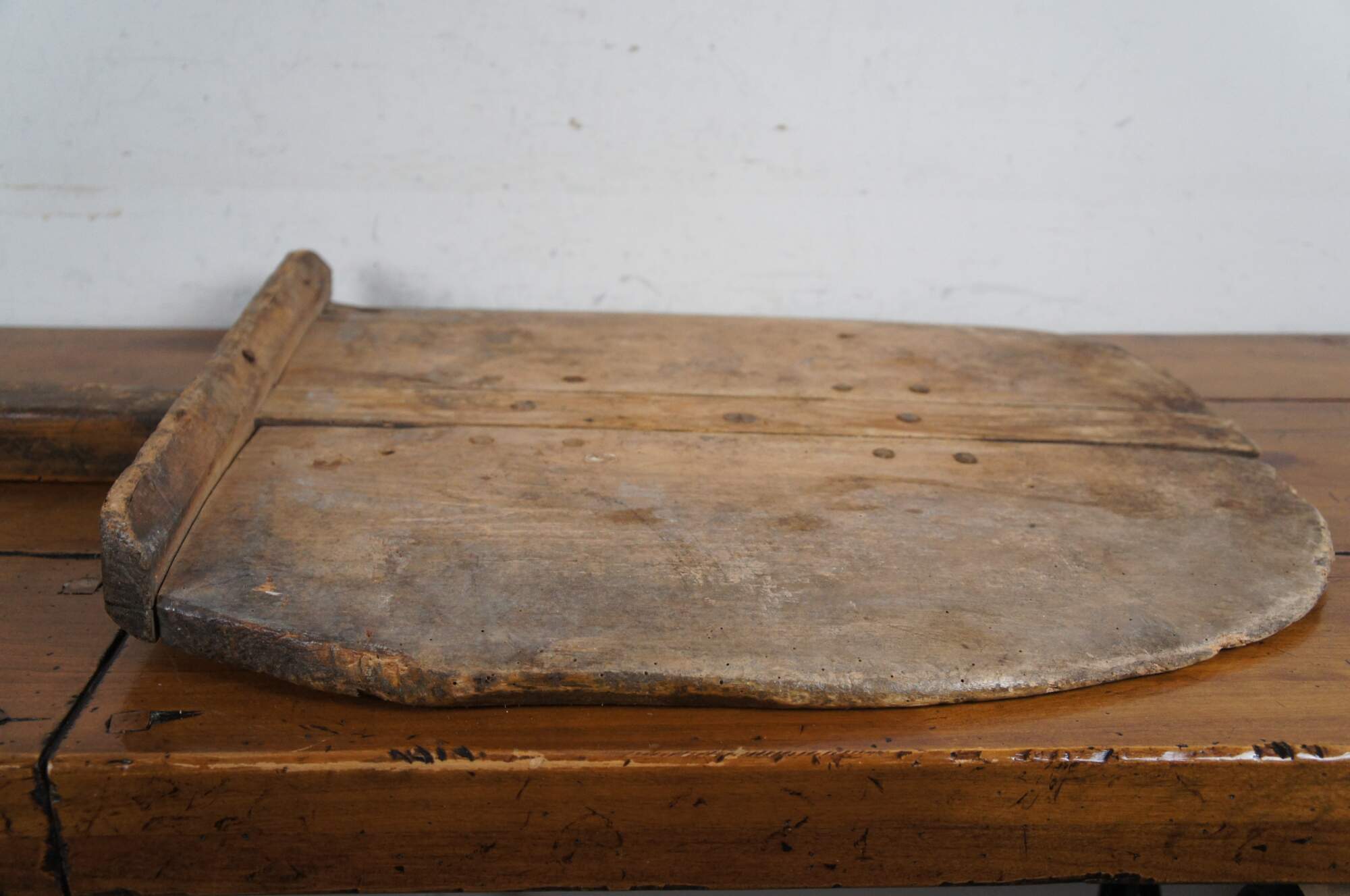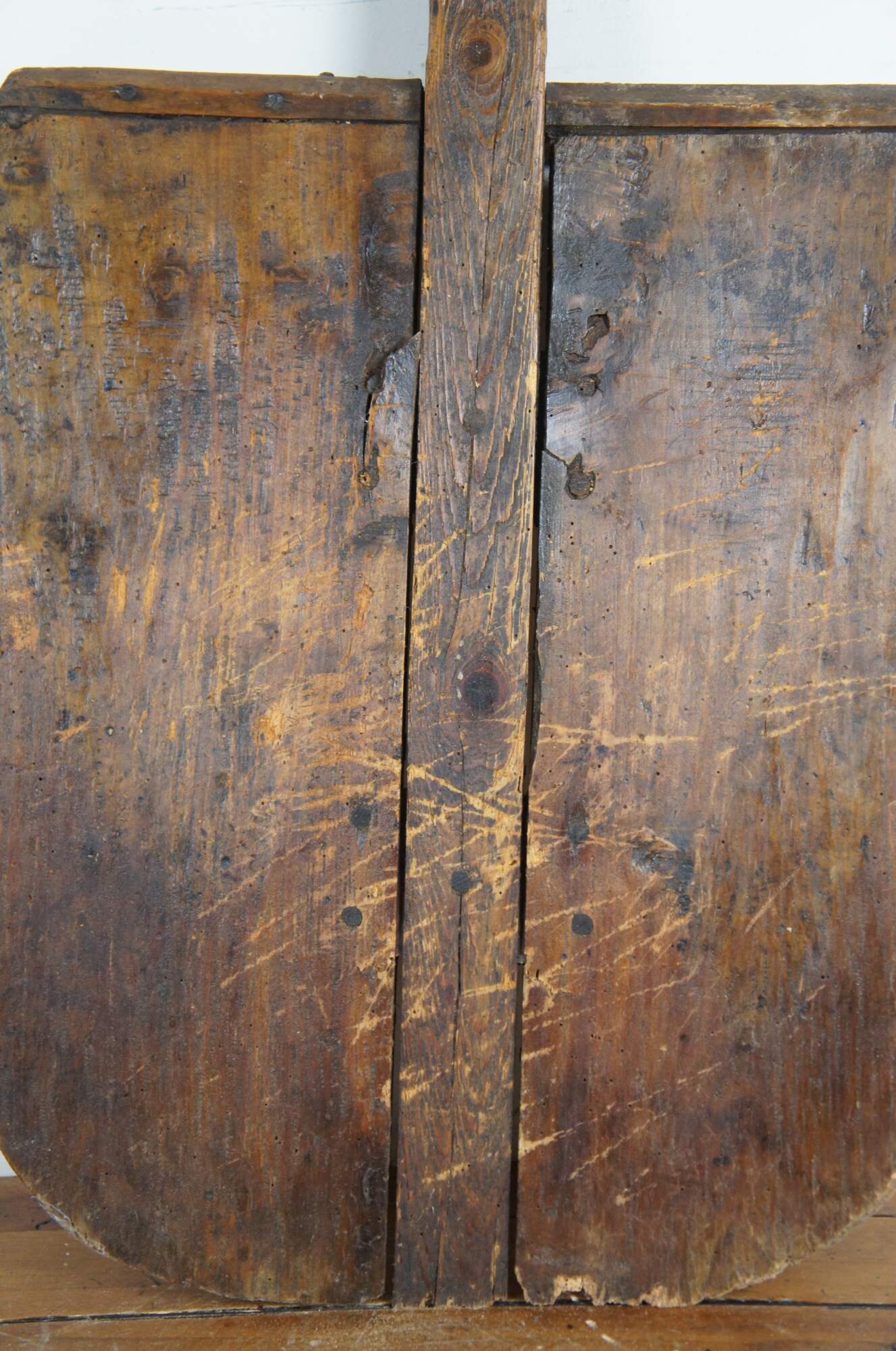 Large primitive antique bread cutting board / peel with backstop and handle, designed for removing loaves of bread from a brick oven.