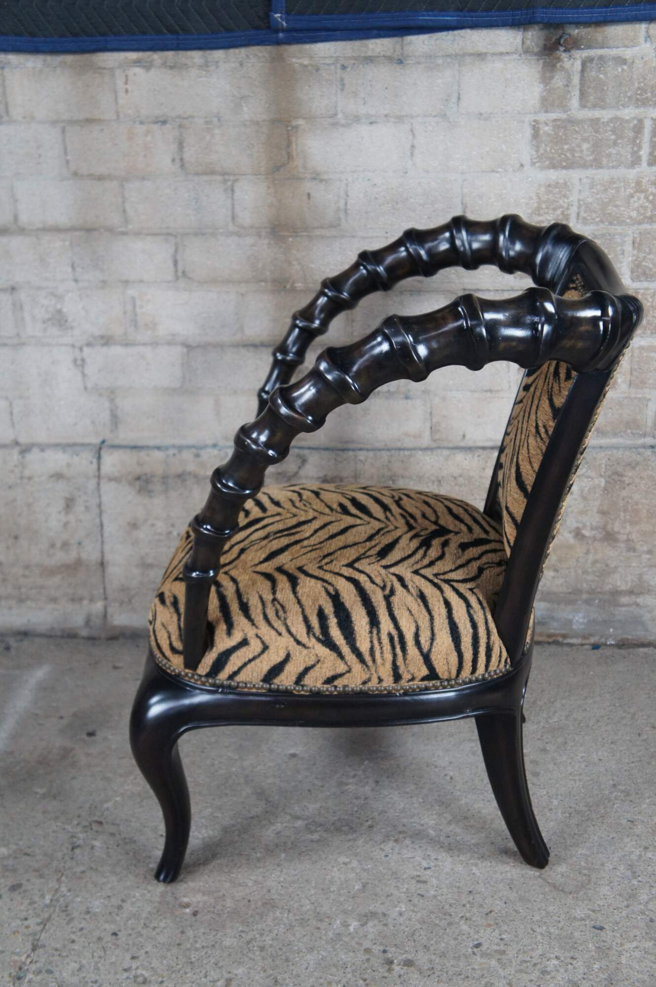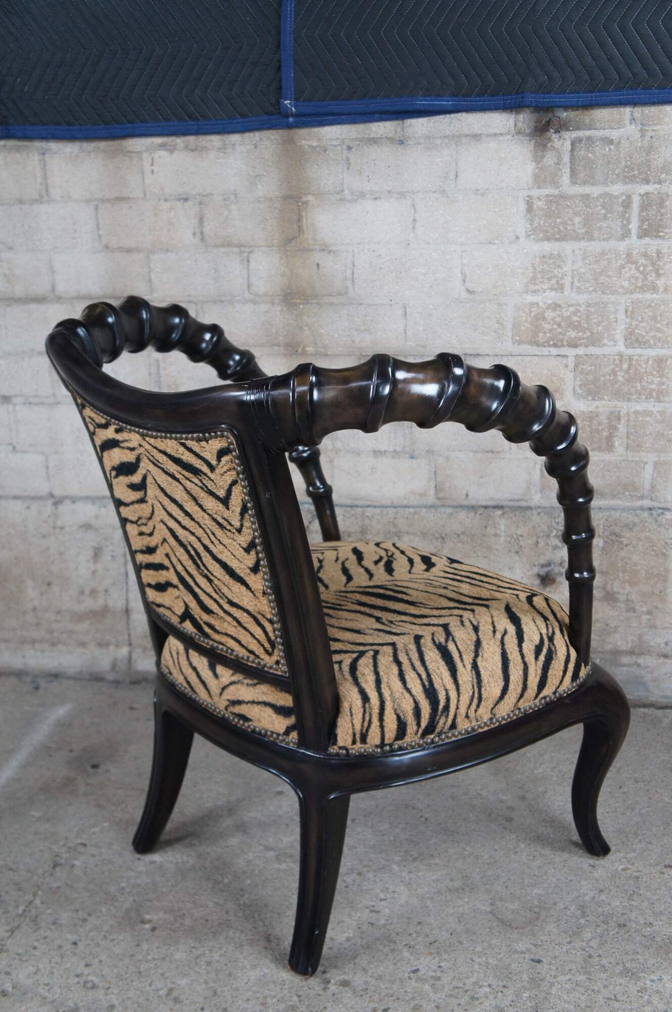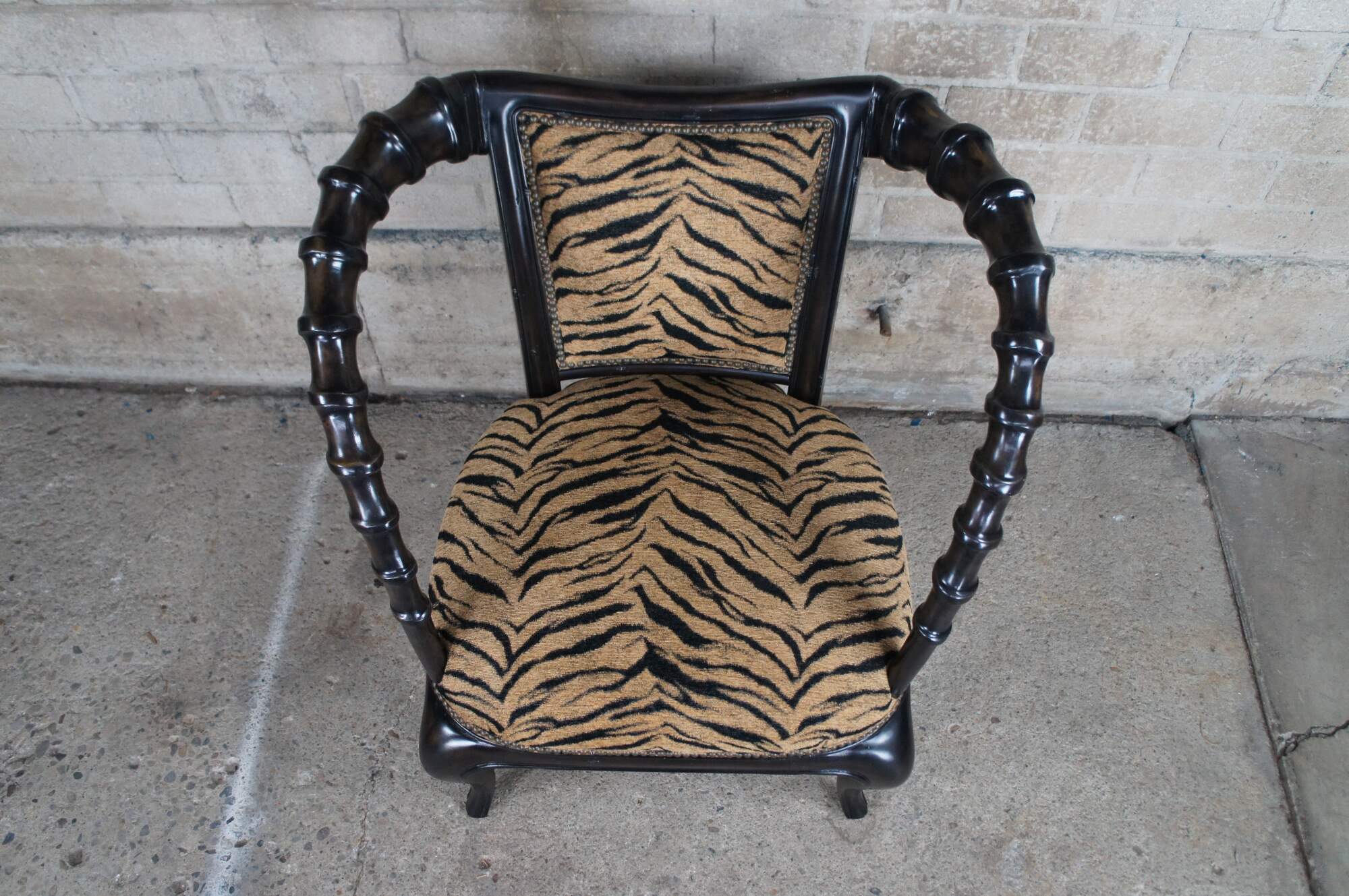 Vintage Thomasville Ernest Hemingway African Collection arm chair featuring dark wood frame with antelope horn style arms and zebra fabric.