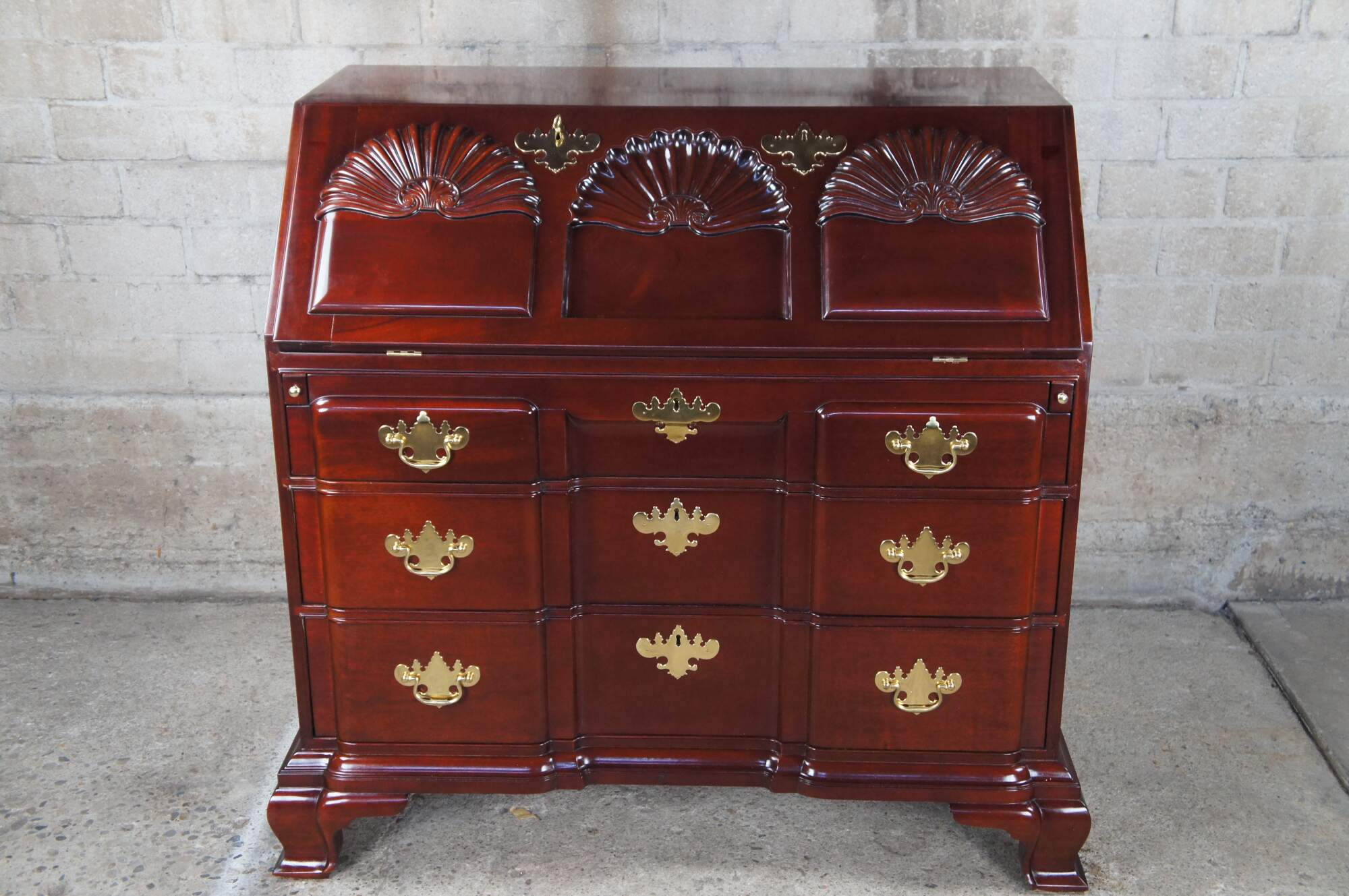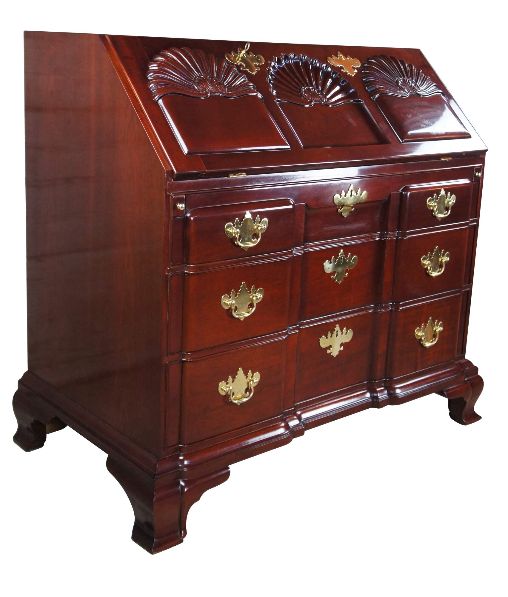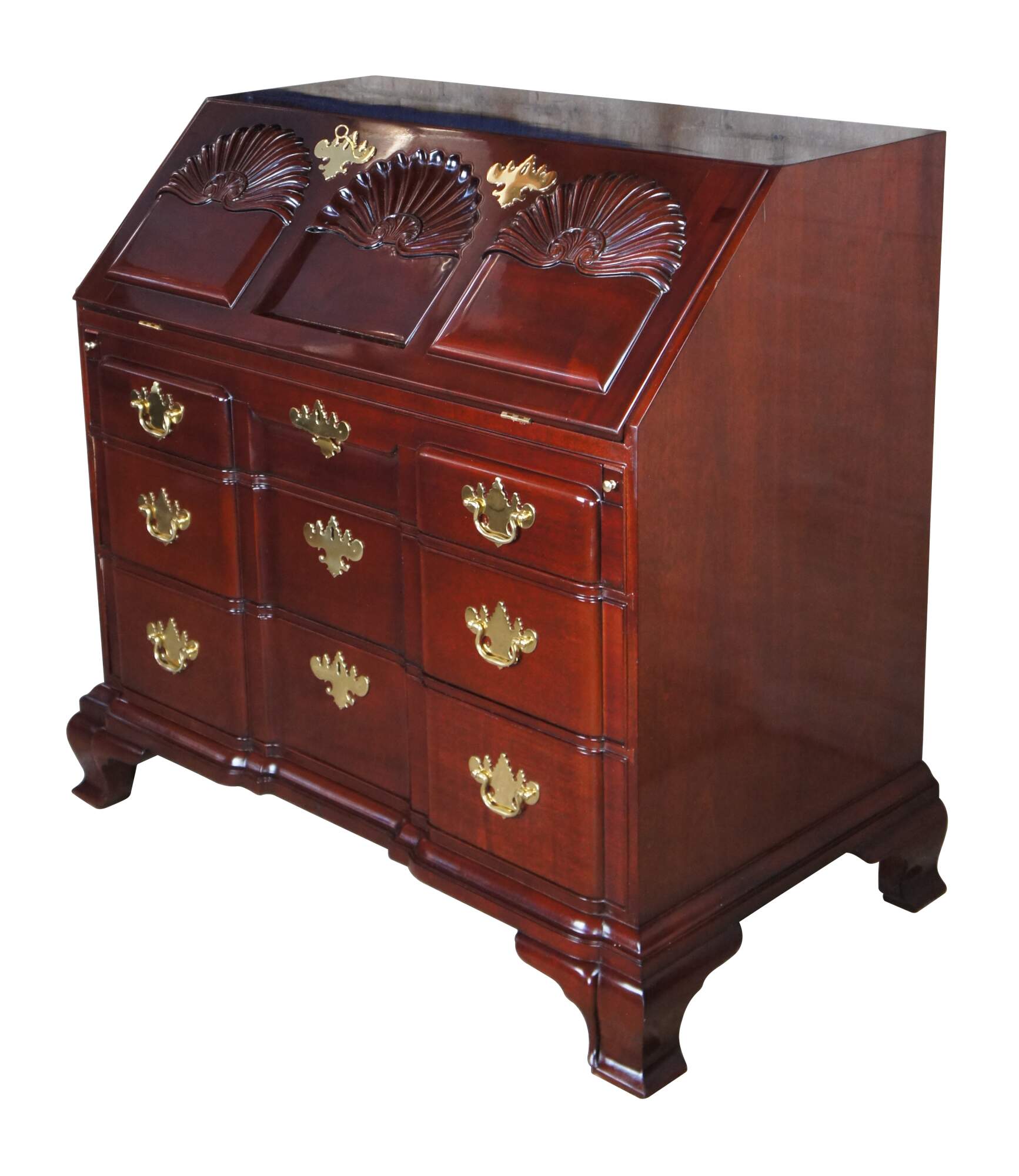 Kindel Winterthur Collection Mahogany Goddard Townsend Blockfront Secretary Writing Desk. Made from mahogany with a high sheen finish. This exception example of a late 18th century piece features an ornately scalloped slant front over three graduated dovetailed drawers with solid brass batwing hardware. The dropfront opens to 17 additional drawers and pigeon holes. The secretary is supported by bracket feet.
