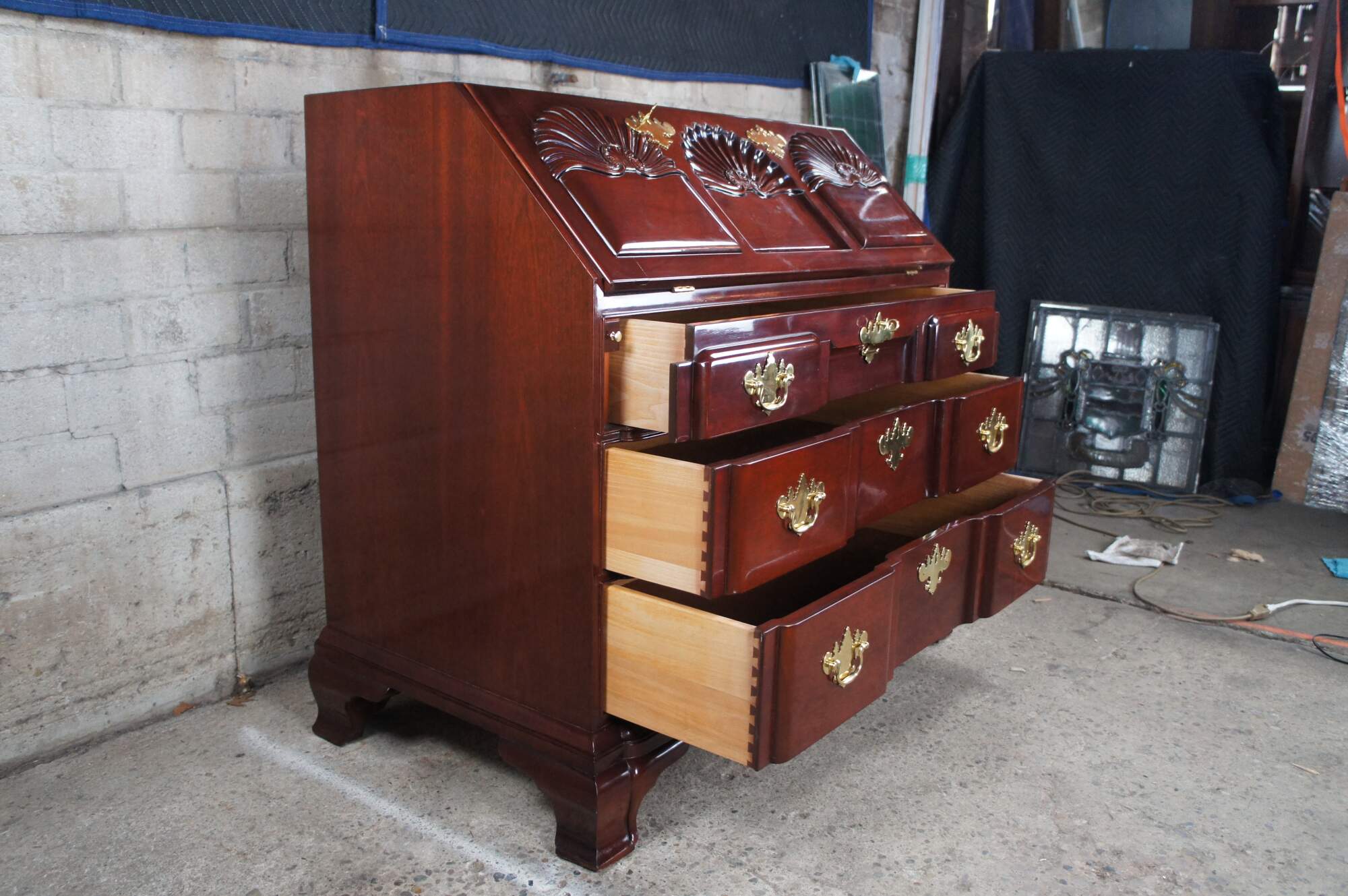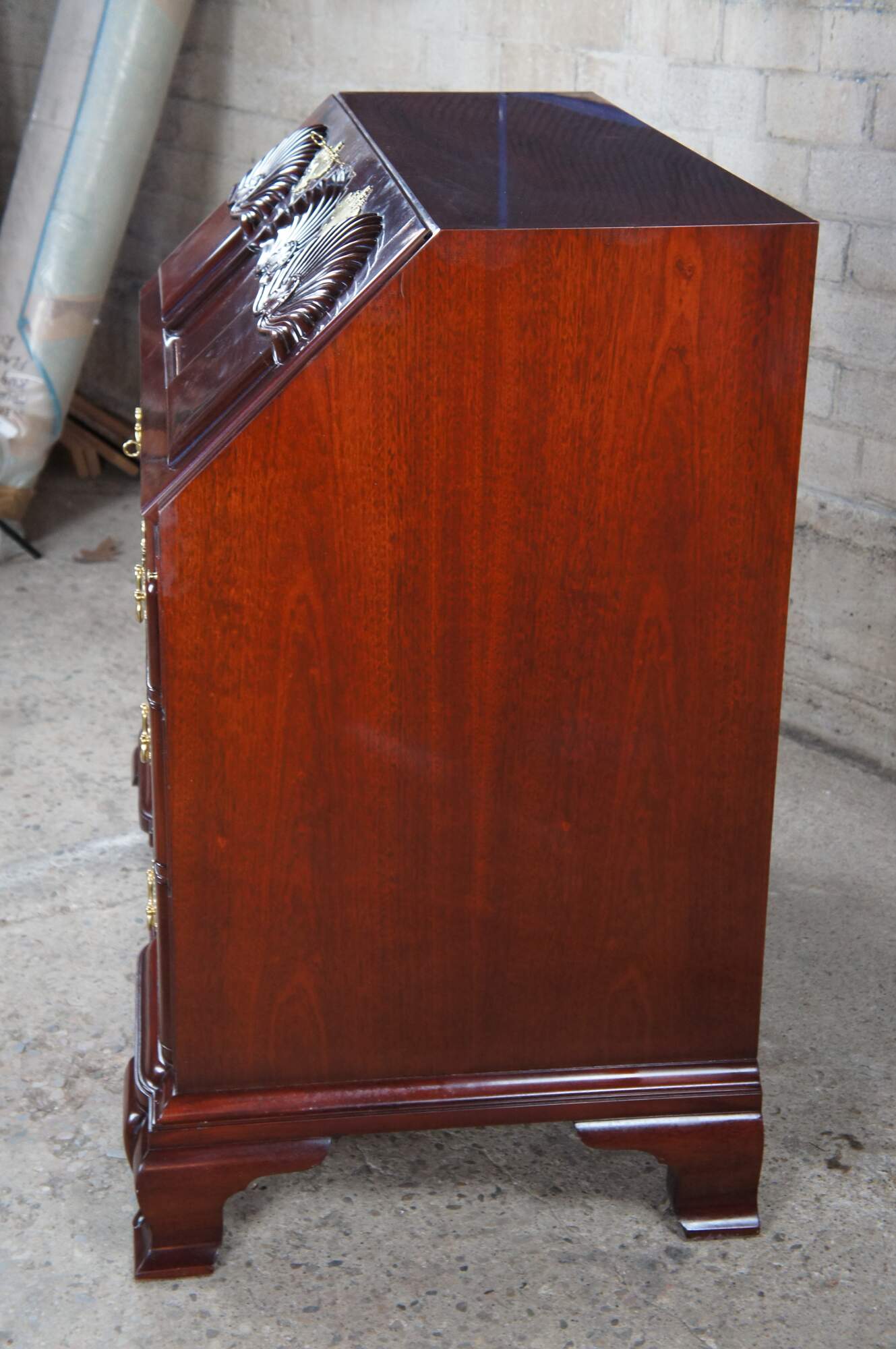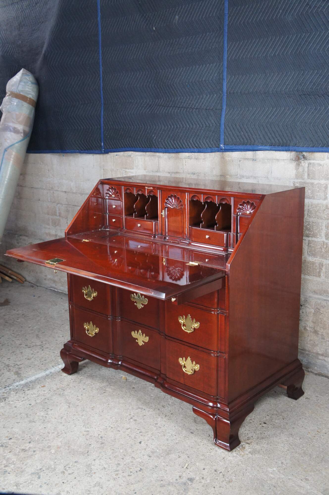 Kindel Winterthur Collection Mahogany Goddard Townsend Blockfront Secretary Writing Desk. Made from mahogany with a high sheen finish. This exception example of a late 18th century piece features an ornately scalloped slant front over three graduated dovetailed drawers with solid brass batwing hardware. The dropfront opens to 17 additional drawers and pigeon holes. The secretary is supported by bracket feet.