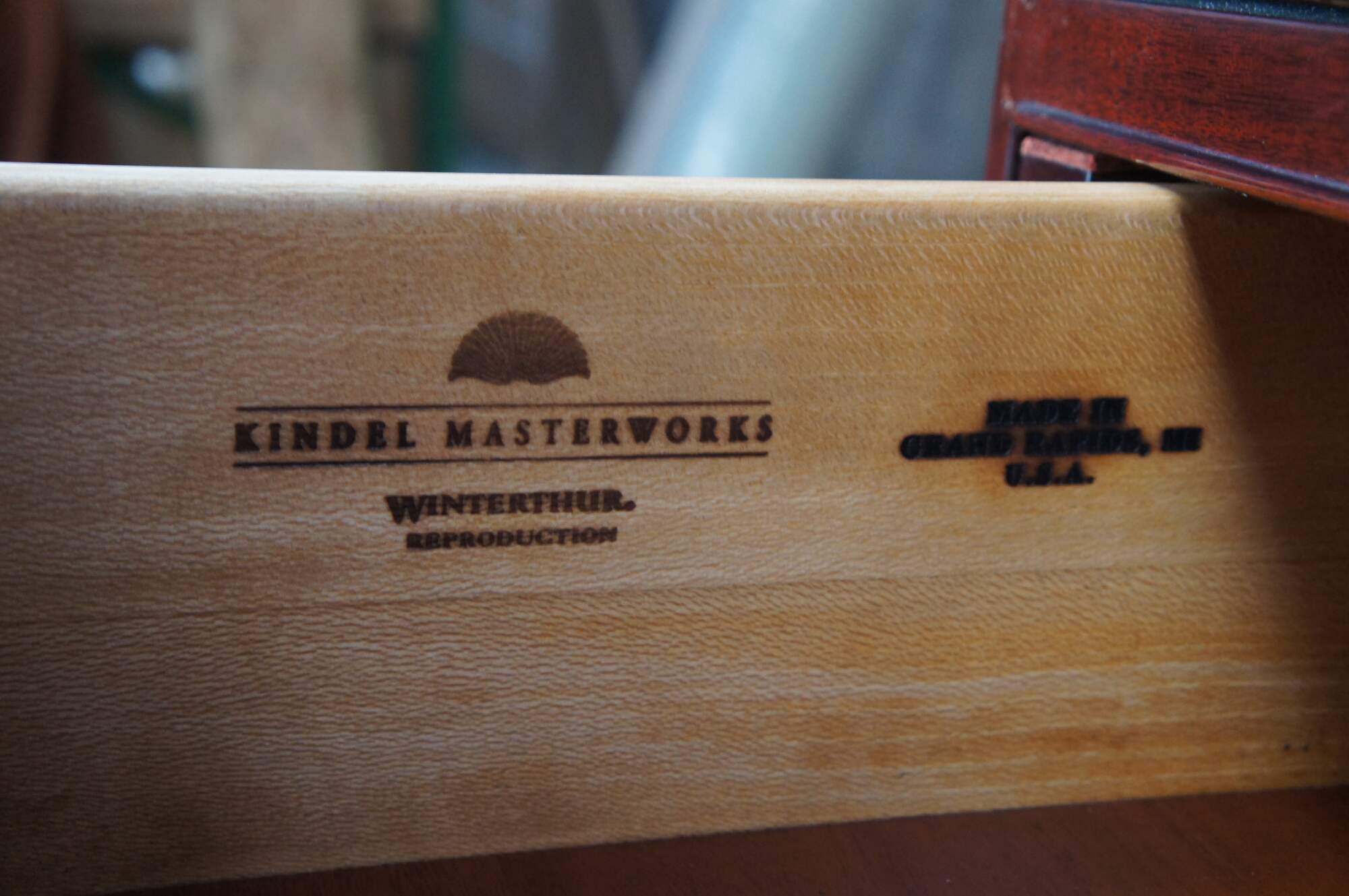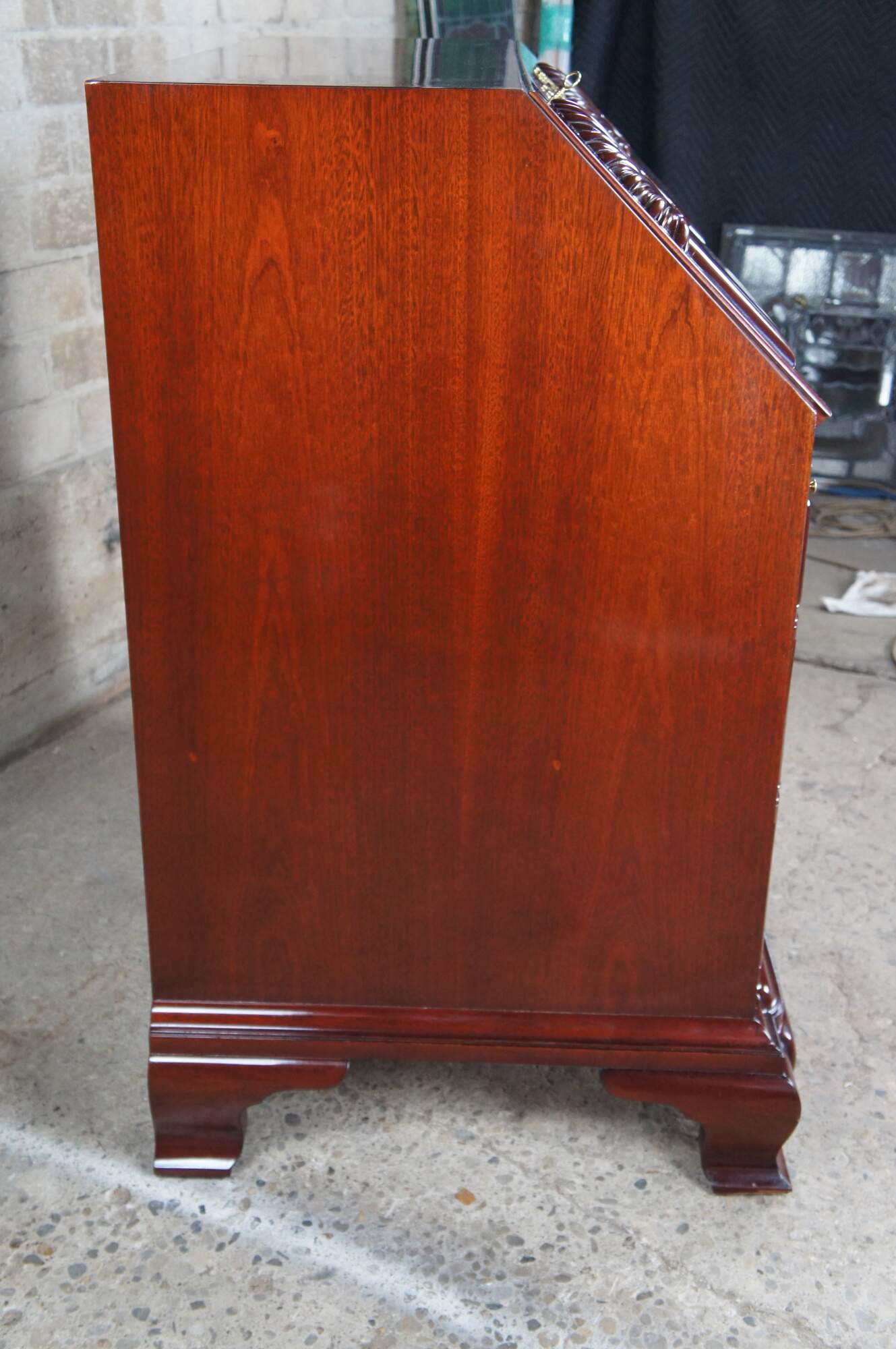 The original of this Mahogany desk and bookcase, made for the Updyke family in the 1770s, is one of ten block-fronted examples crafted by members of the Townsend and Goddard families of Kingston and Newport, Rhode Island. Block fronting, or the raised-recessed-raised triad of panels with the shell as an integral part of each, is considered to be uniquely American. The last one remaining in private hands was sold at Christie’s on June 3, 1989 for $12.1 million, a world record-breaking price. The hand carving represents 37 hours by meticulous Kindel artisans to achieve the beautiful and precise look of the original.