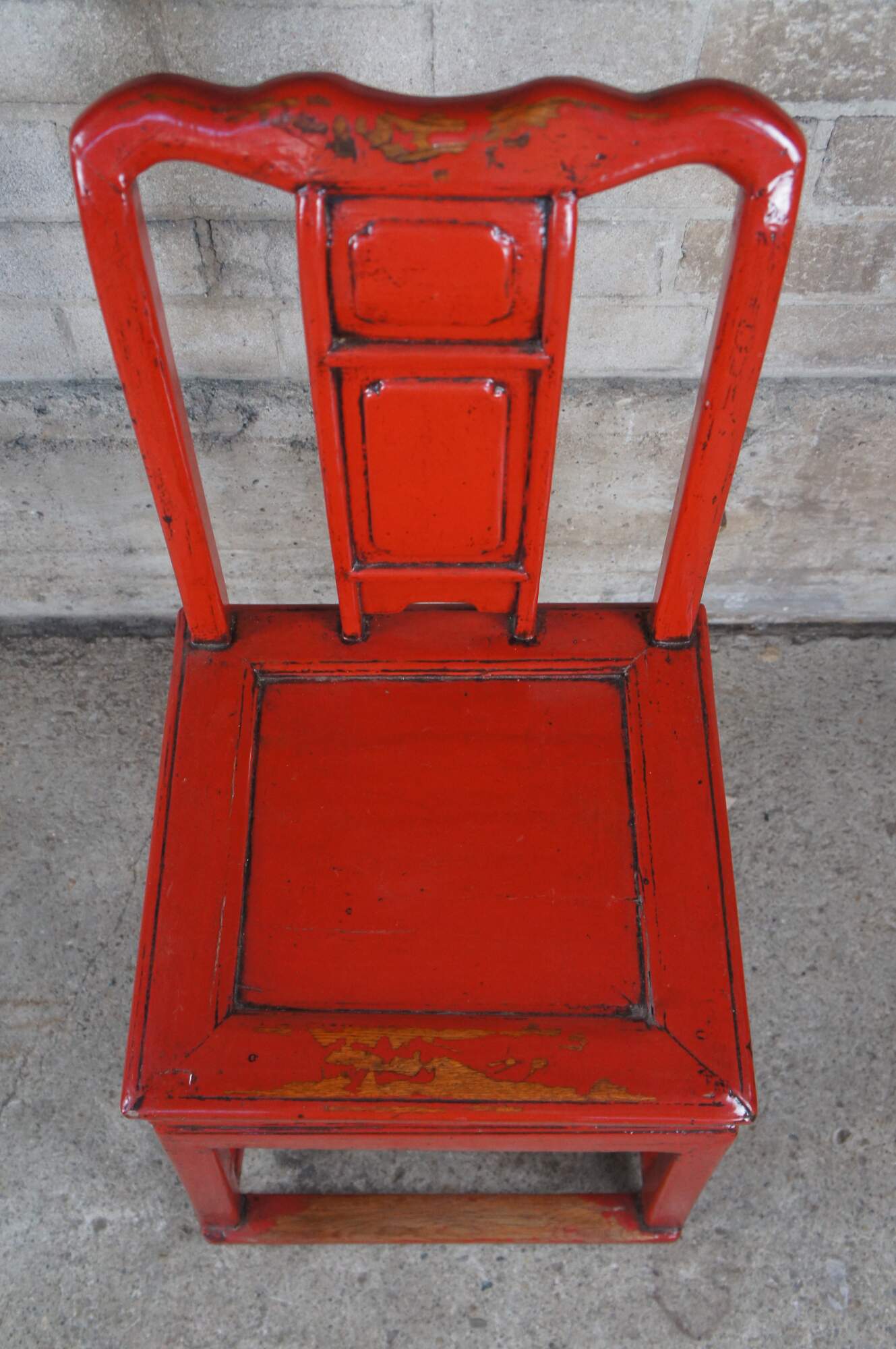 Antique Qing dynasty red lacquer side chair. Made from elm with angled back, panelled accents and distressed accents.