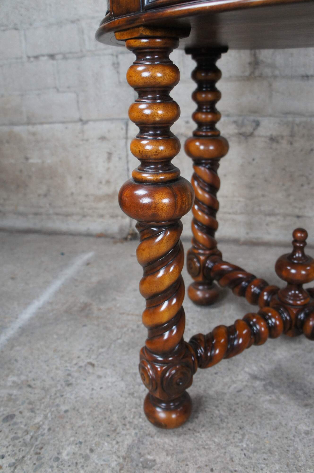 A solid mahogany and brass engraved circular lamp table by Theodore Alexander, Circa late 20th Century. Features a frieze drawer, on barley twisted turned legs and stretchers. Includes a turned lower trophy finial and riveted accents. The table is after an original 17th century Portuguese design.