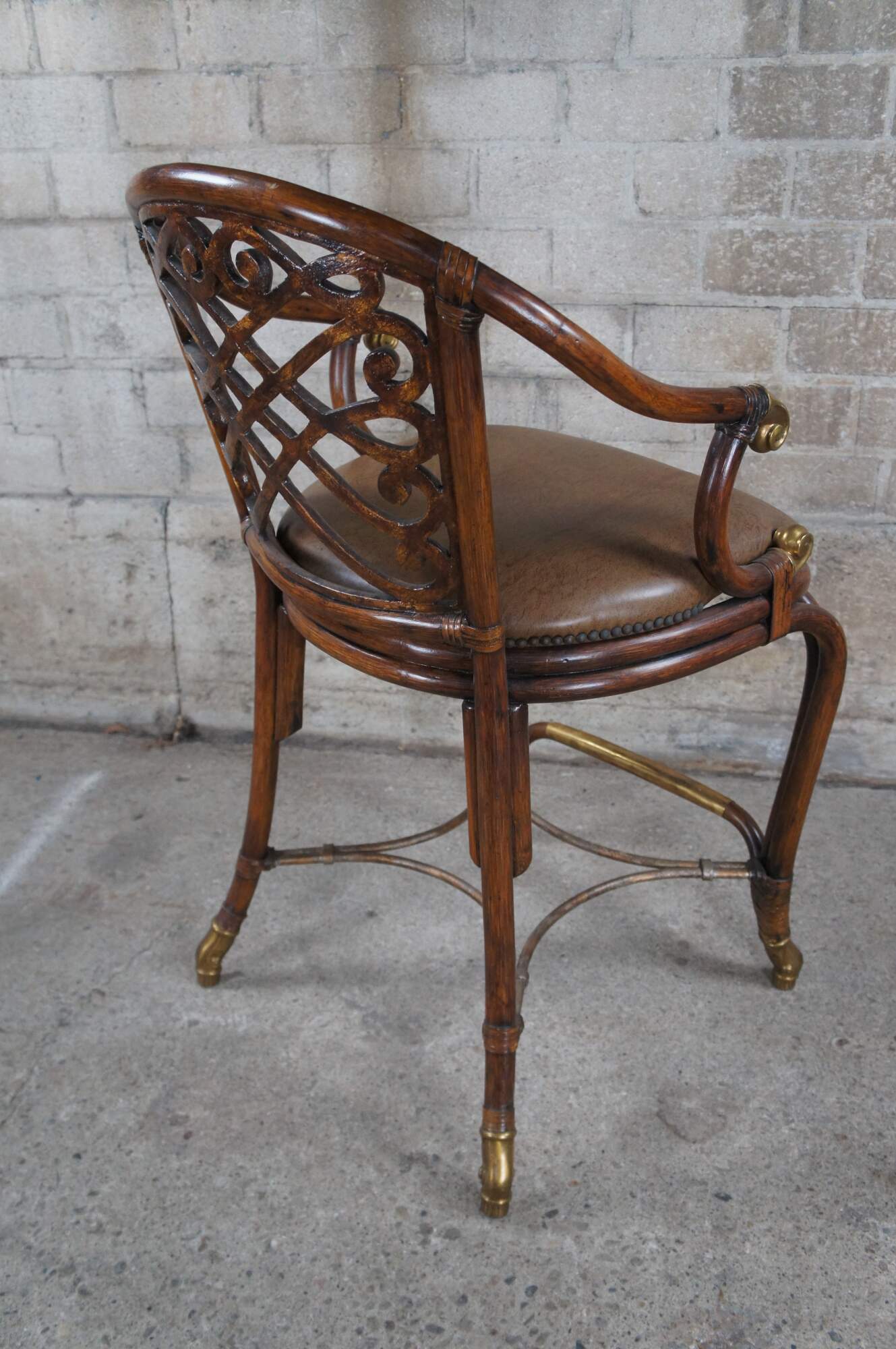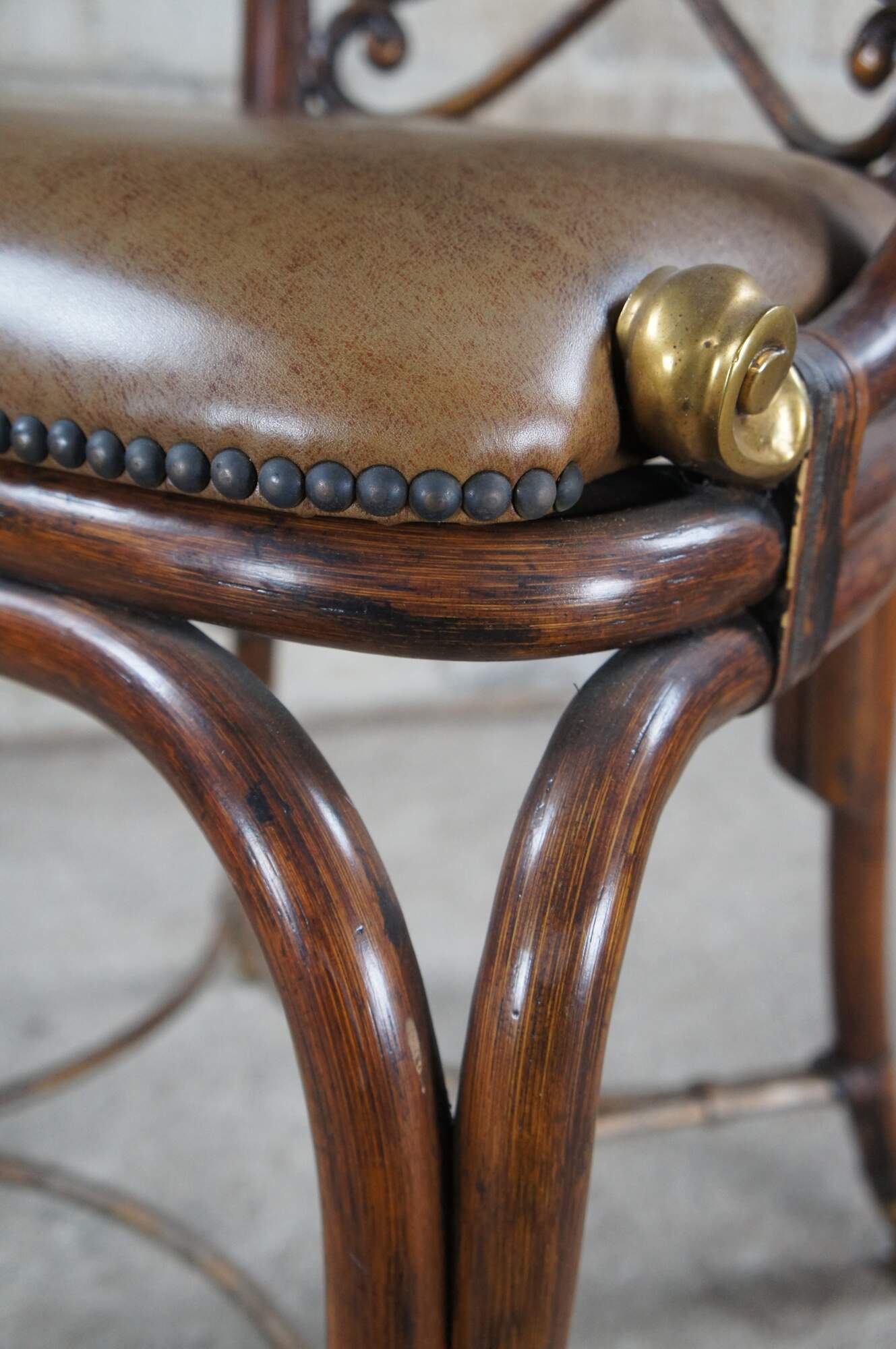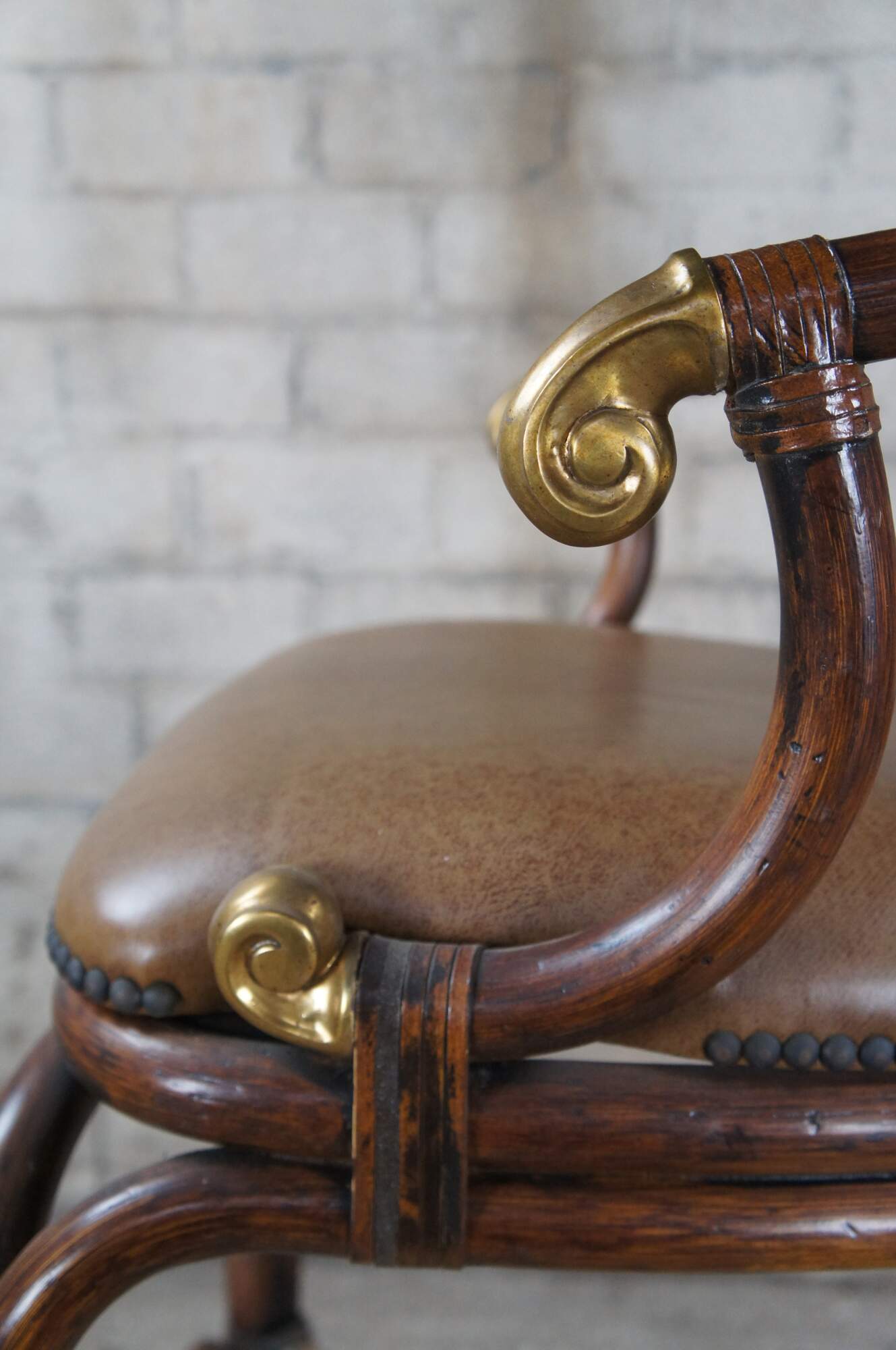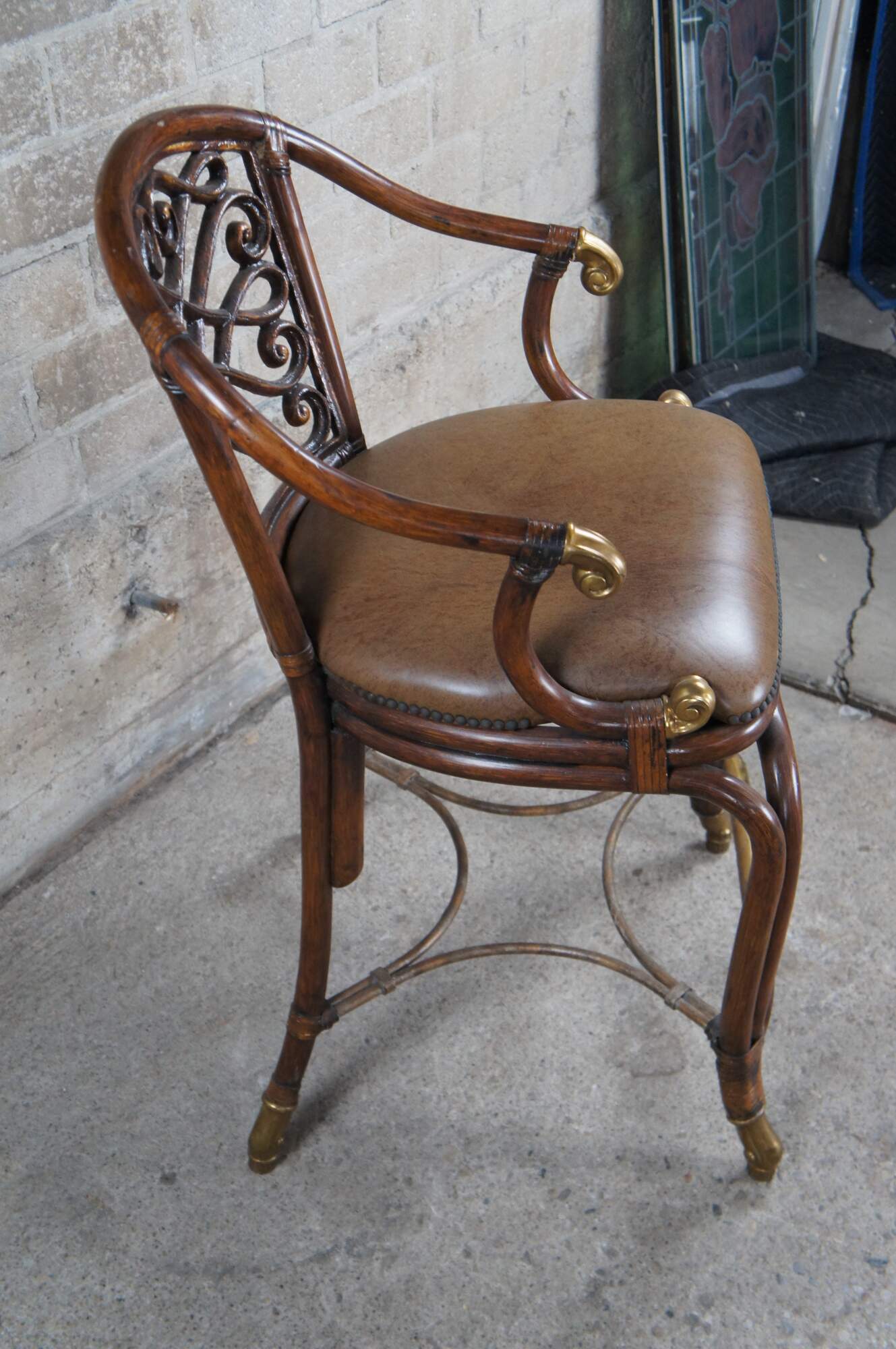 4 vintage Maitland Smith Bohemian Modern counter height bar stools. Features a faux famboo frame with leather seat, brass and rattan accents. Each chair has a contoured crest rail and scrolled back. A warm addition to any space.