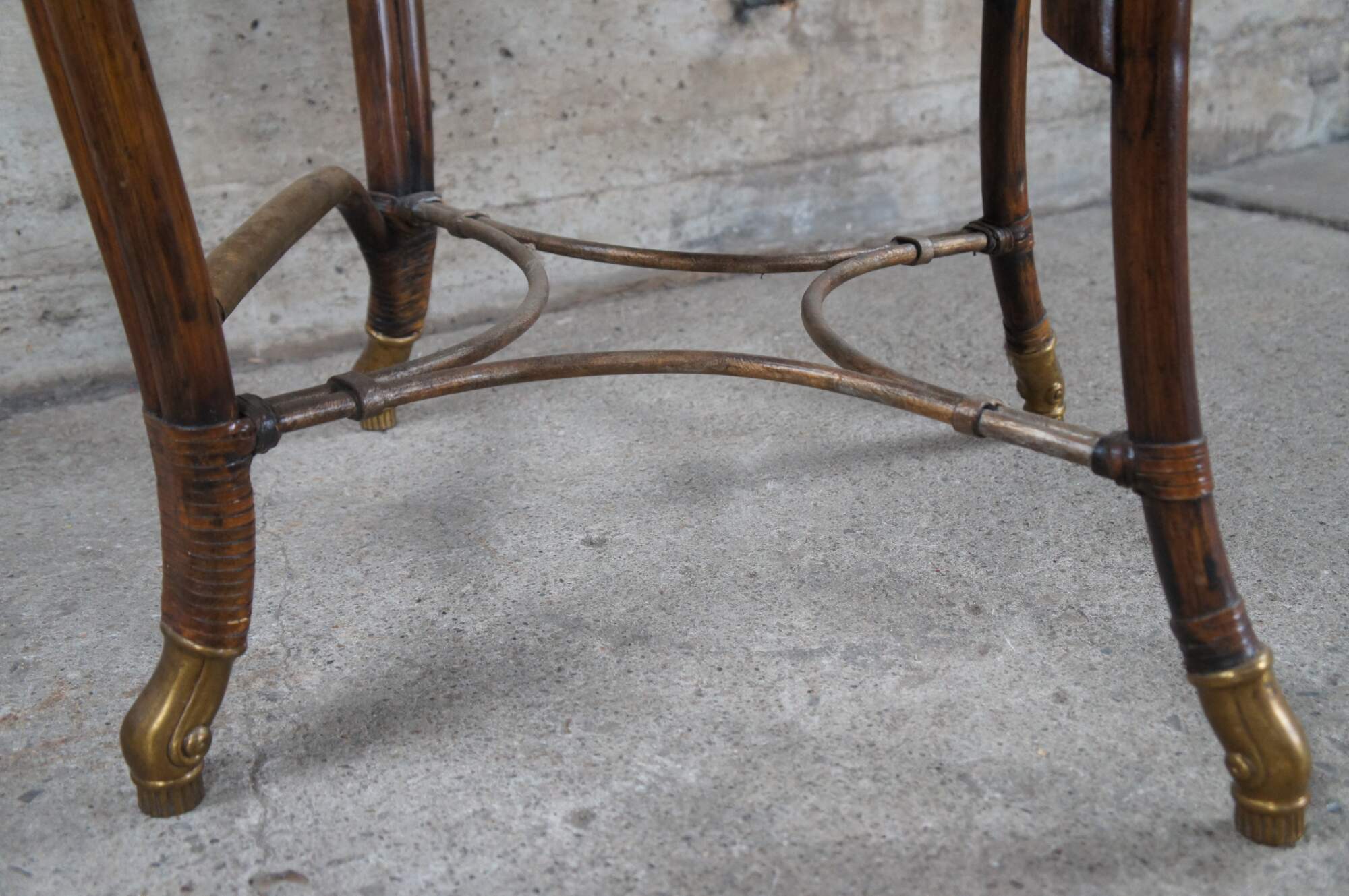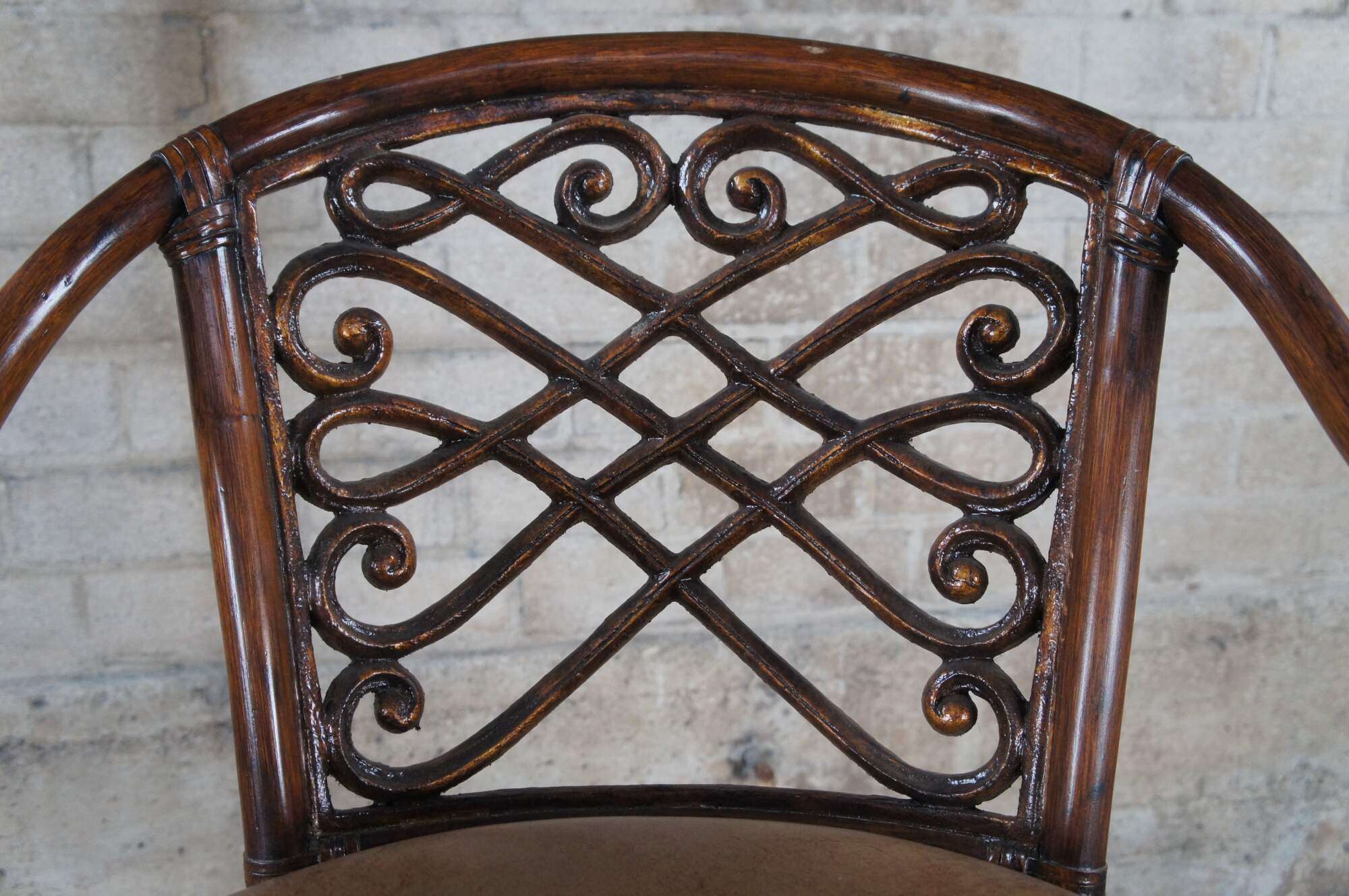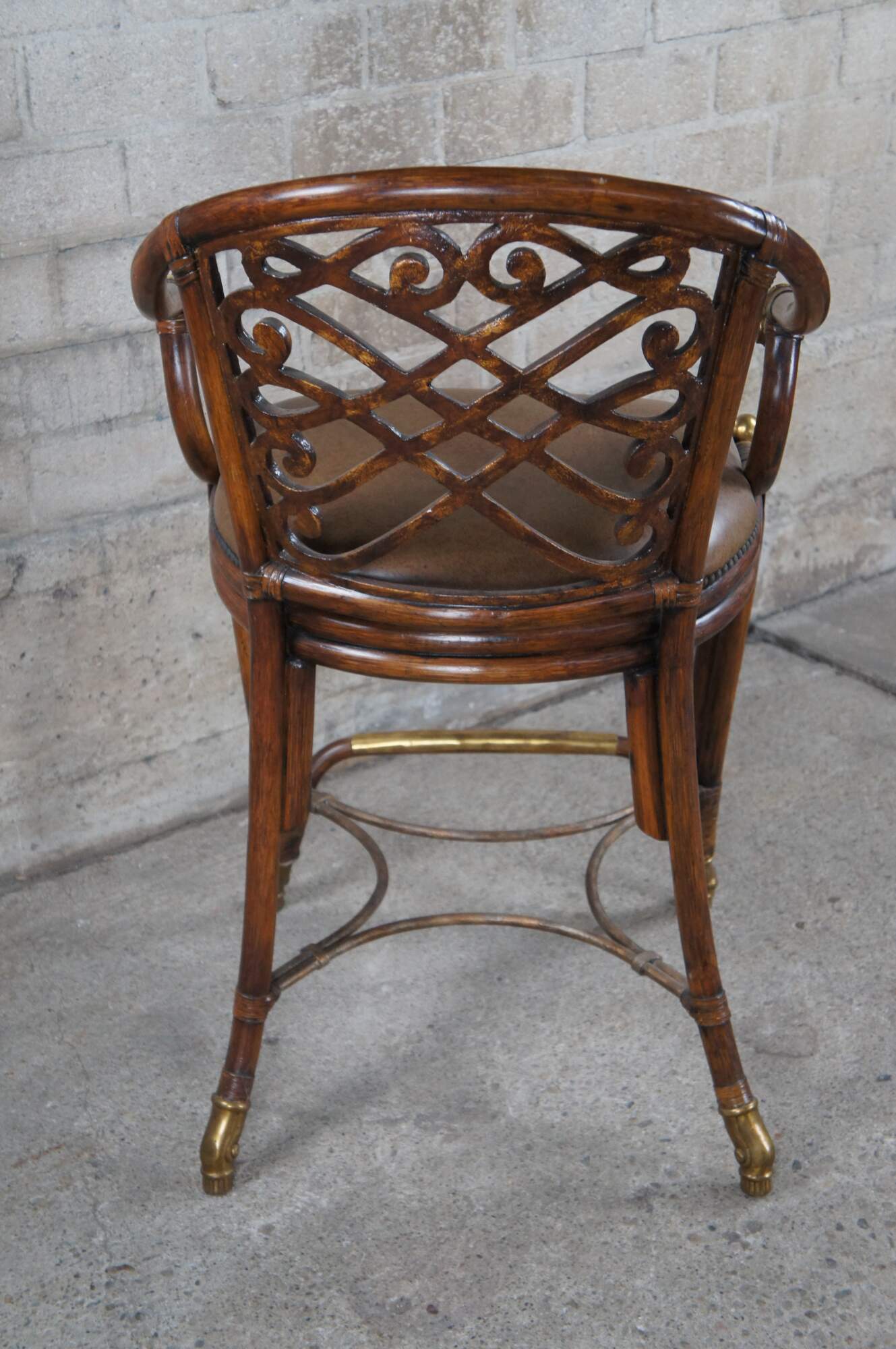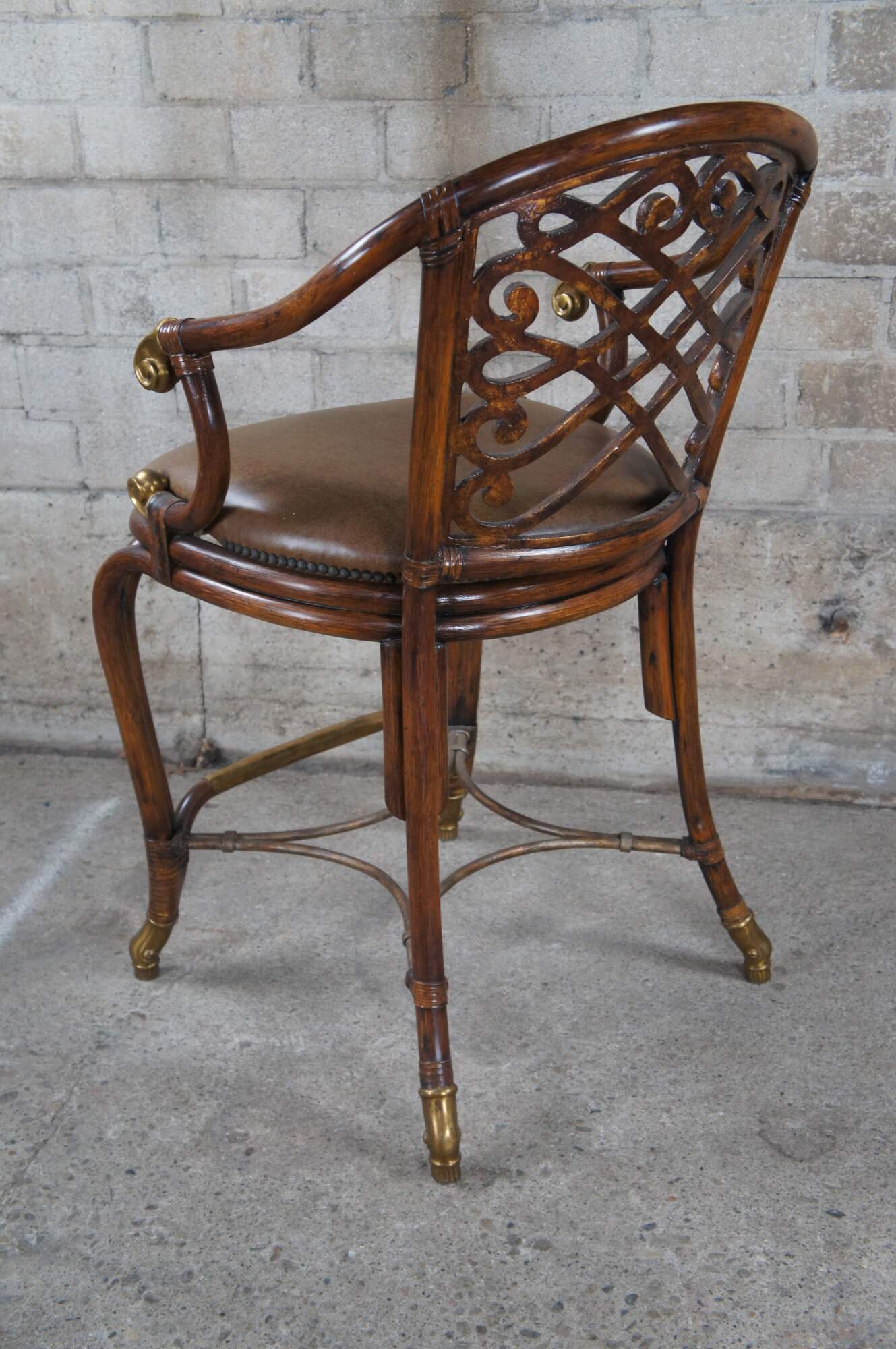 4 vintage Maitland Smith Bohemian Modern counter height bar stools. Features a faux famboo frame with leather seat, brass and rattan accents. Each chair has a contoured crest rail and scrolled back. A warm addition to any space.