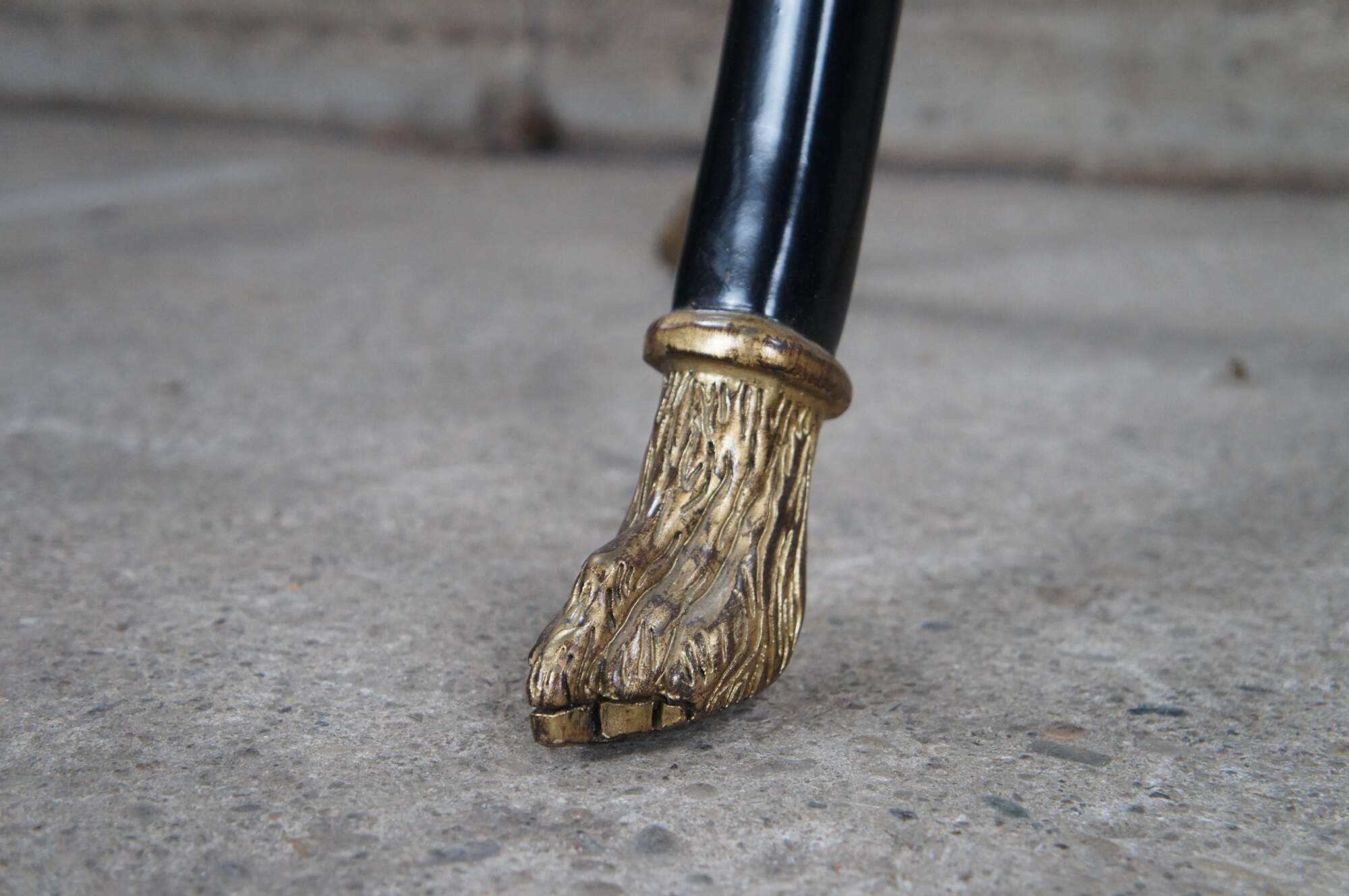 Late 20th Century Baker Furniture Empire / Regency / Neoclassical inspired Gueridon side table. Features a hardwood ebonized frame with dark granite top. The round form is supported by three contoured legs with gold finished lion heads beneath the frieze leading to a triangular trestle or shelf and ornate gold paw feet. The granite top is great touch for this kind of table as it much more stain resistant than marble. Great for use as a lamp / corner table, center (centre) table or bedside nightstand or accent piece.