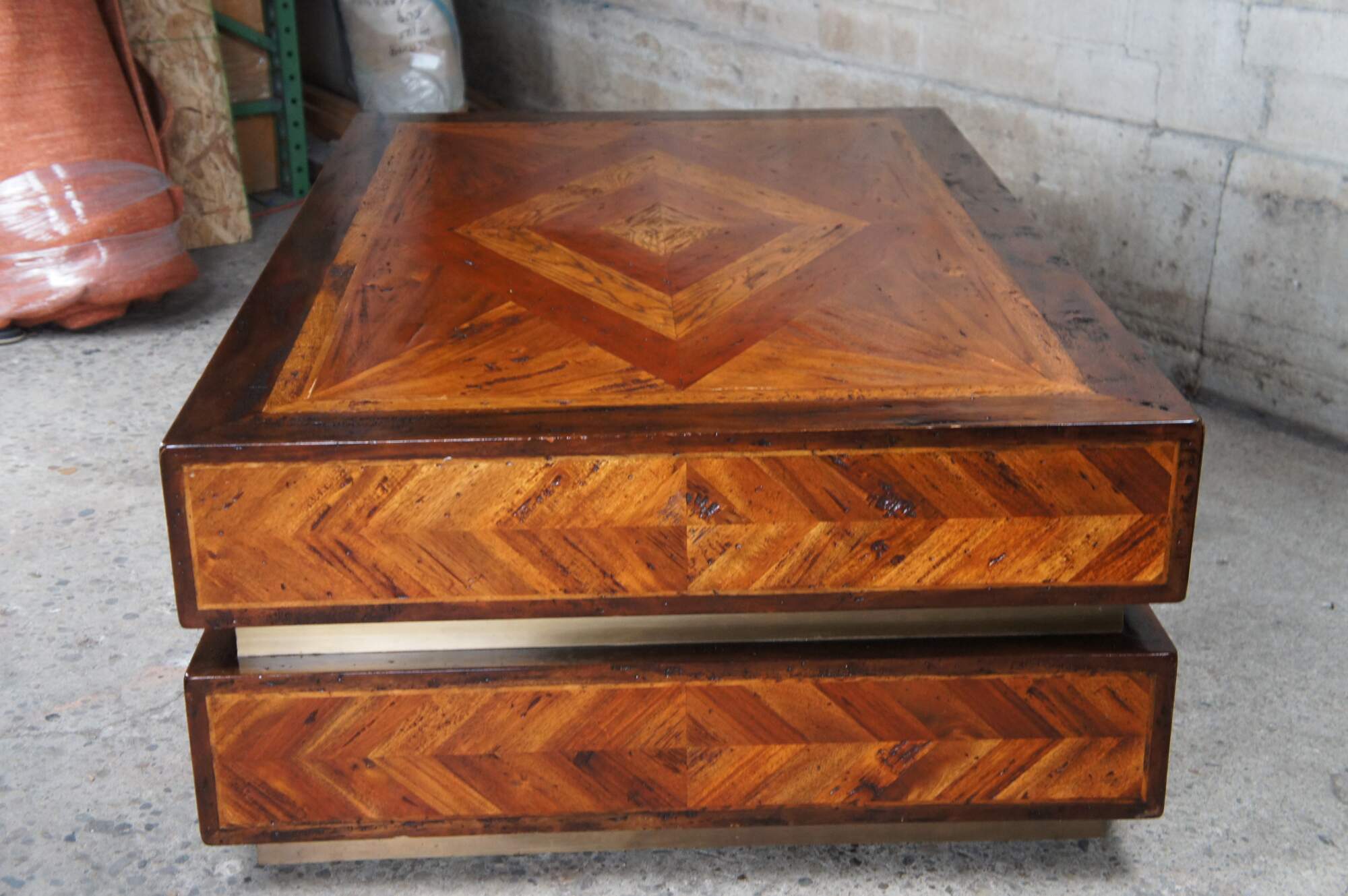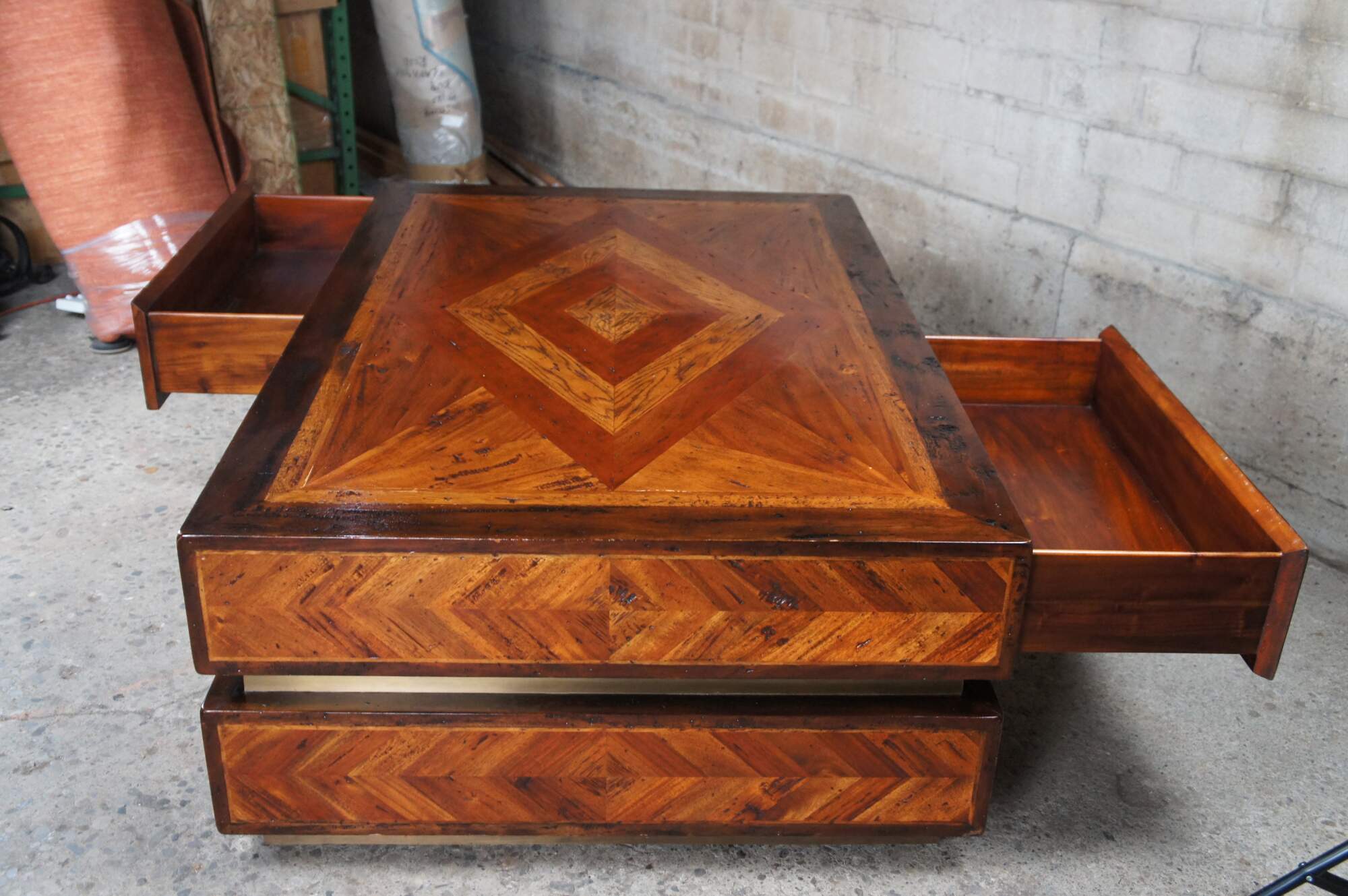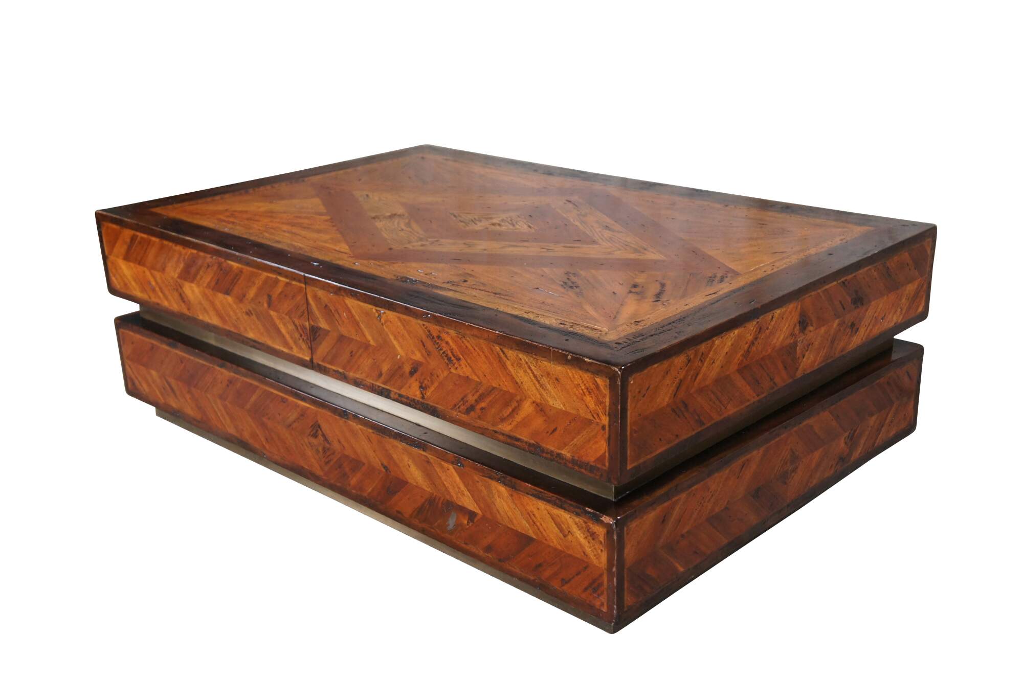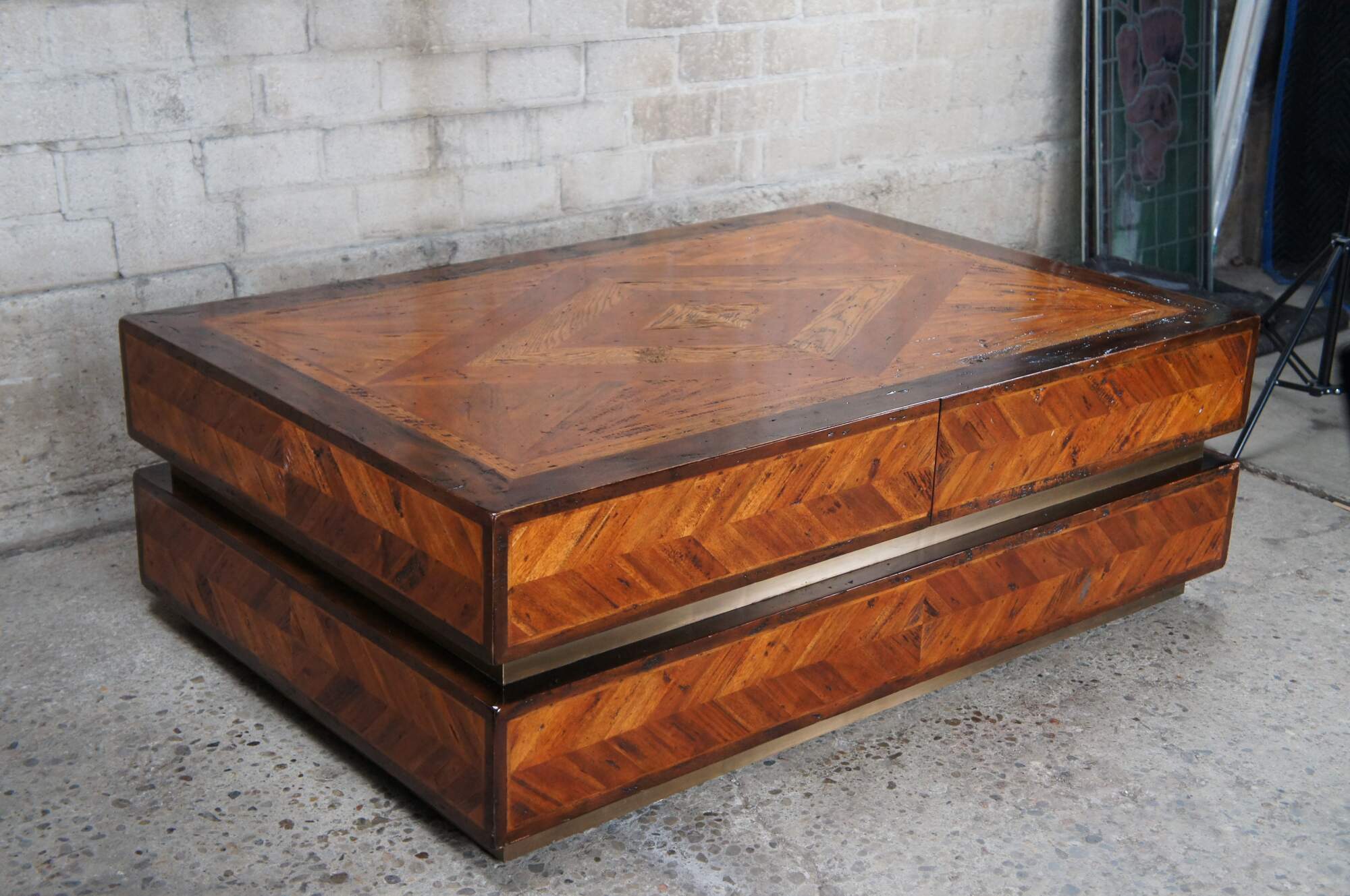 Vintage Theodore Alexander Brunello Sera Cocktail Table; 5100-182. Features a geometric lozenge parquetry fashioned out of hand selected acacia, oak and parawood. Concealed drawers provide storage space without detracting from the look of the piece, which includes decorative wood grain paneling along the frieze and base. Inset brass bands separate the wo levels of wood on each side. The tables low modern form blends well in any mid century modern, contemporary or traditional space. A unique find as this table is sold out quickly and rarely comes to market.