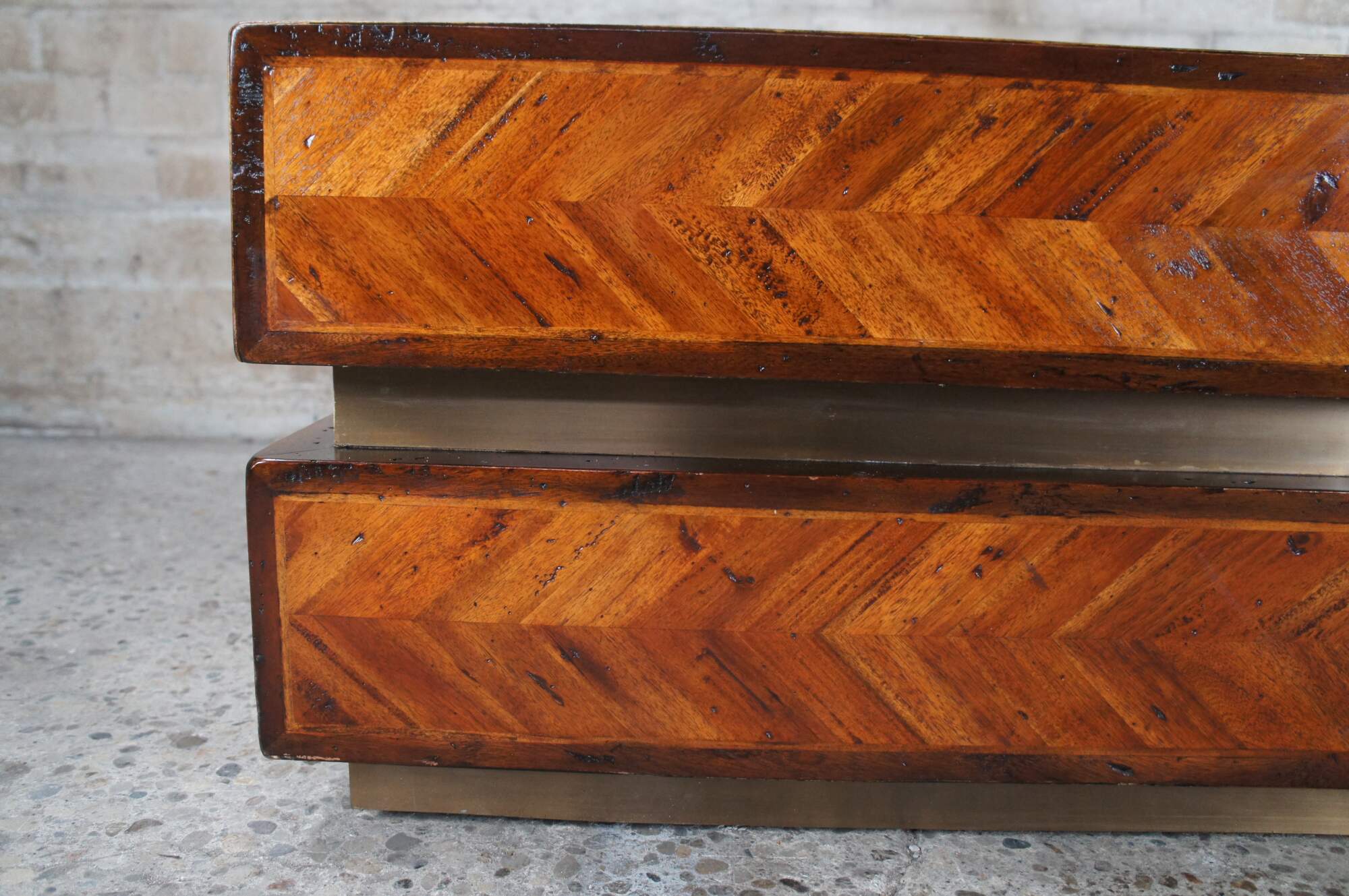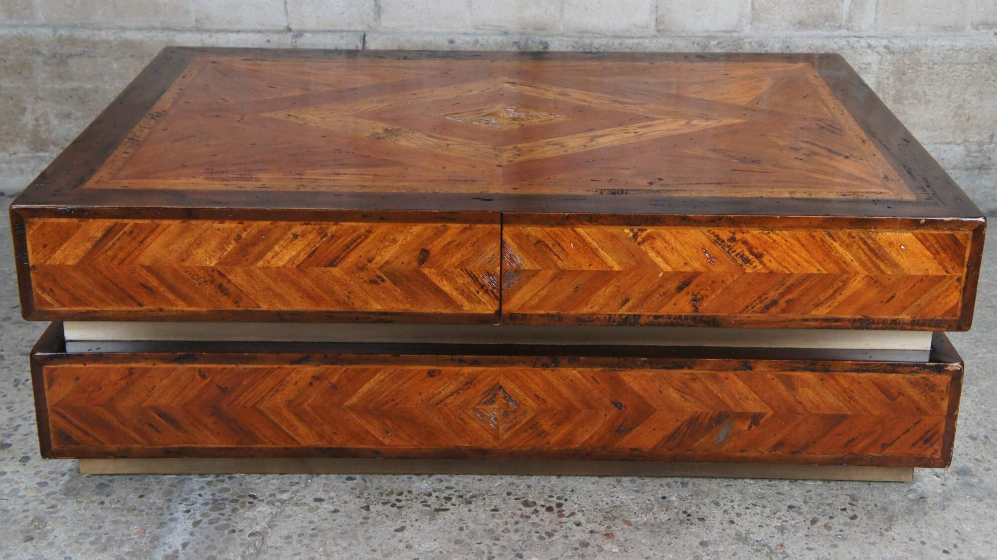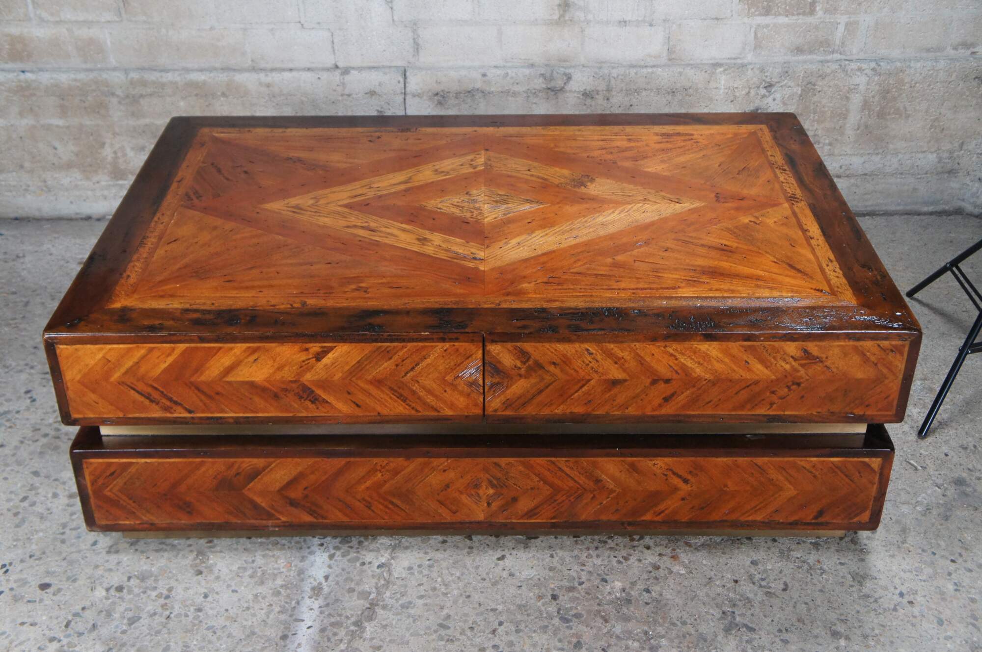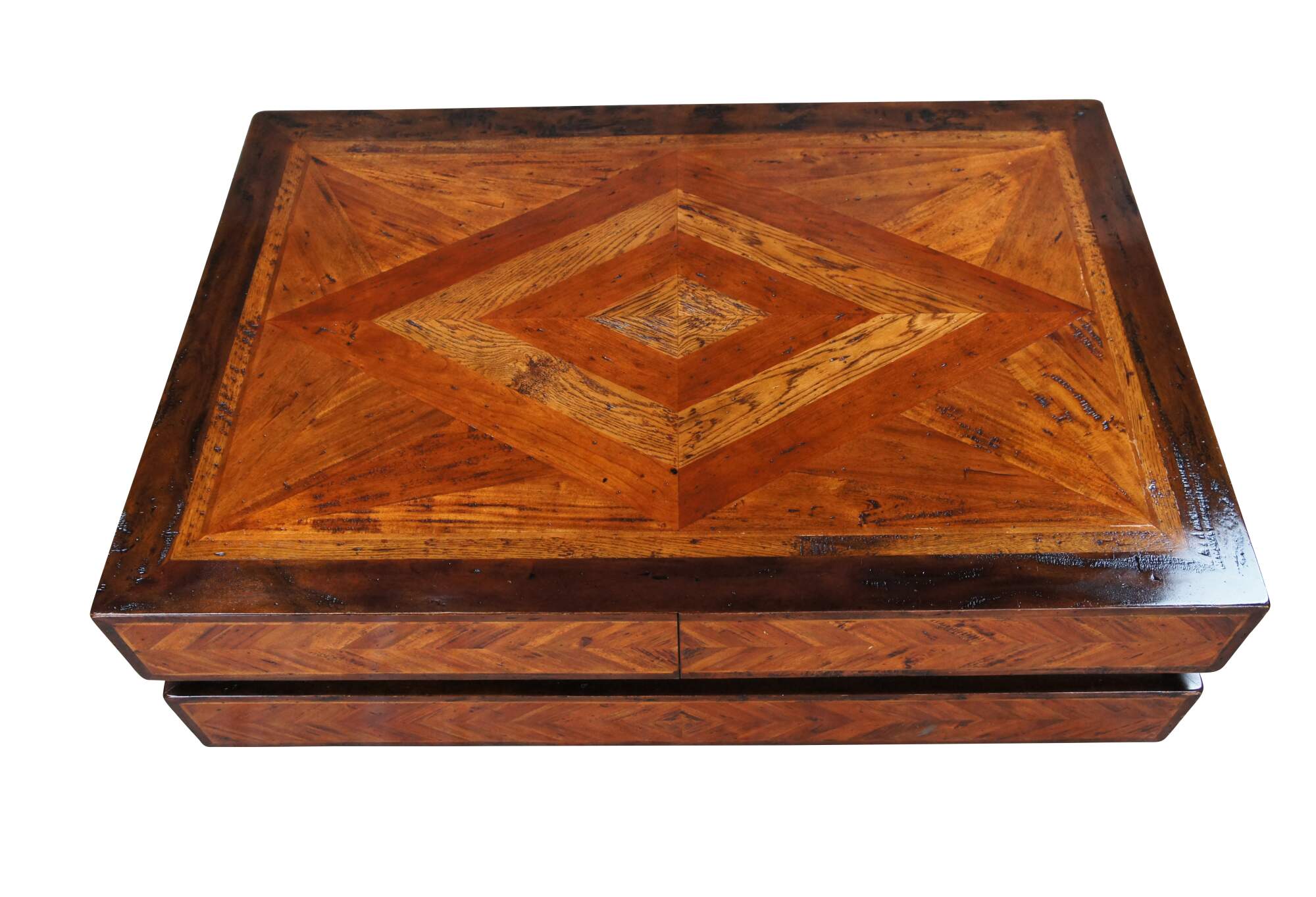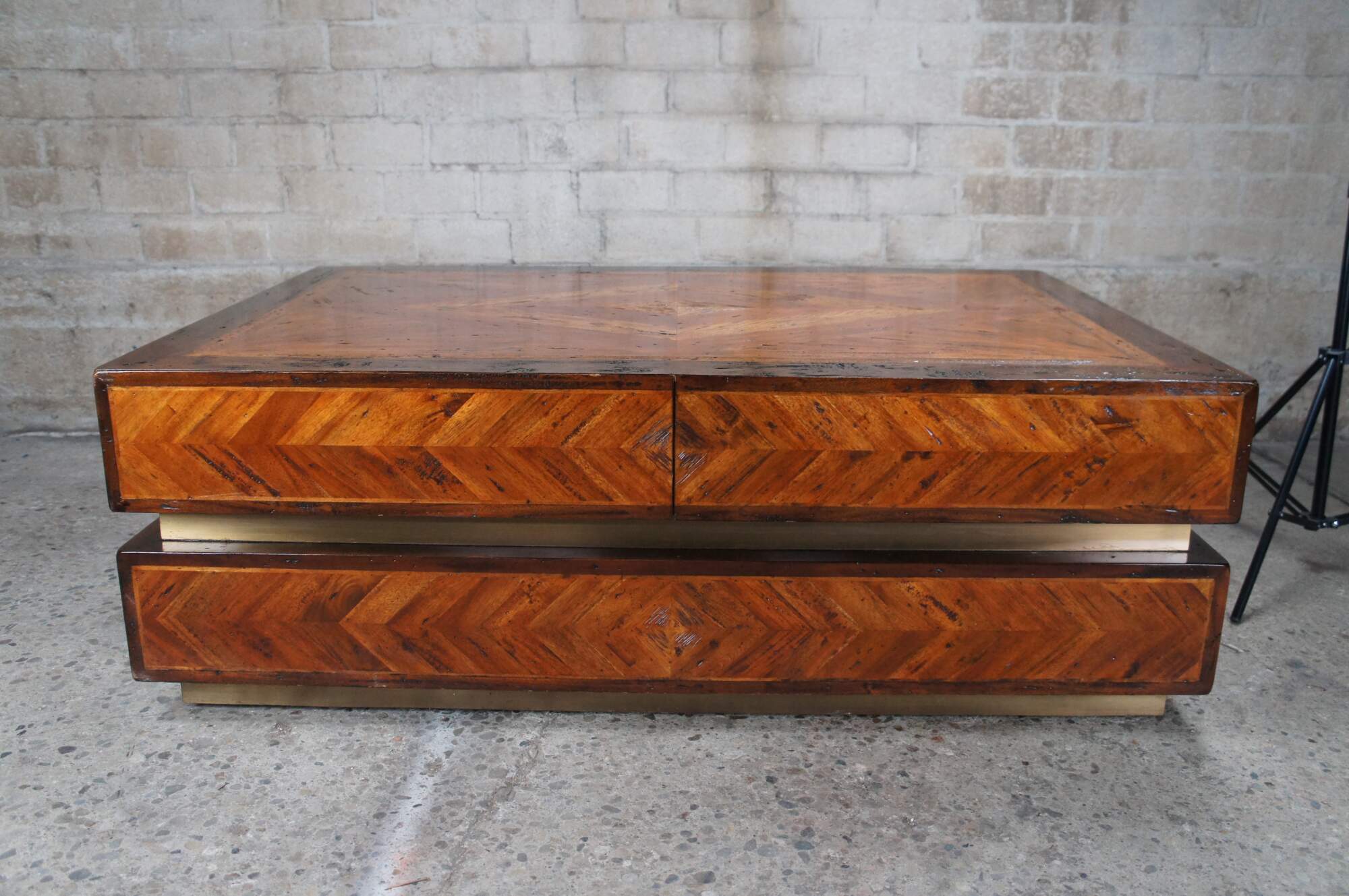 Vintage Theodore Alexander Brunello Sera Cocktail Table; 5100-182. Features a geometric lozenge parquetry fashioned out of hand selected acacia, oak and parawood. Concealed drawers provide storage space without detracting from the look of the piece, which includes decorative wood grain paneling along the frieze and base. Inset brass bands separate the wo levels of wood on each side. The tables low modern form blends well in any mid century modern, contemporary or traditional space. A unique find as this table is sold out quickly and rarely comes to market.