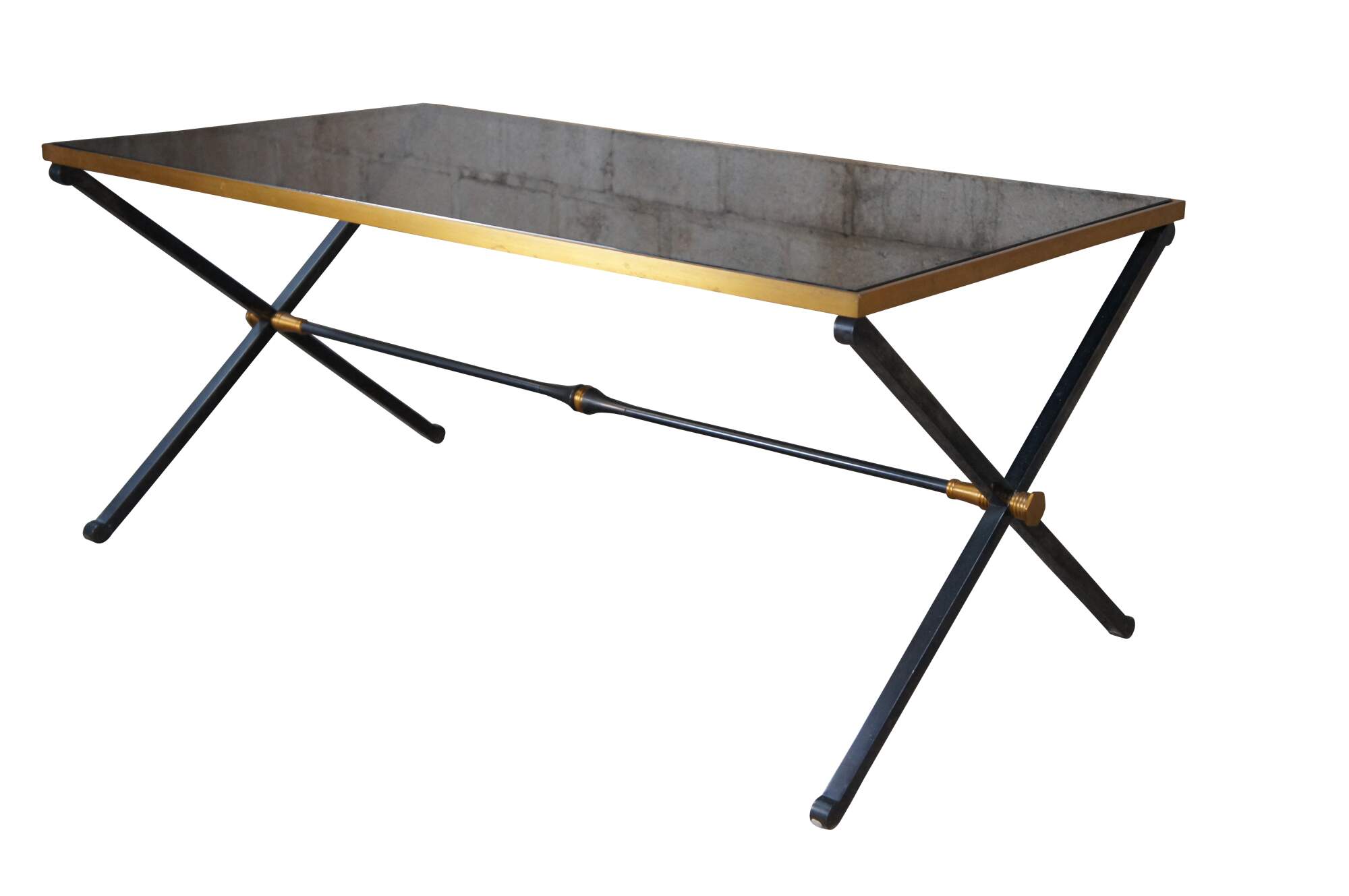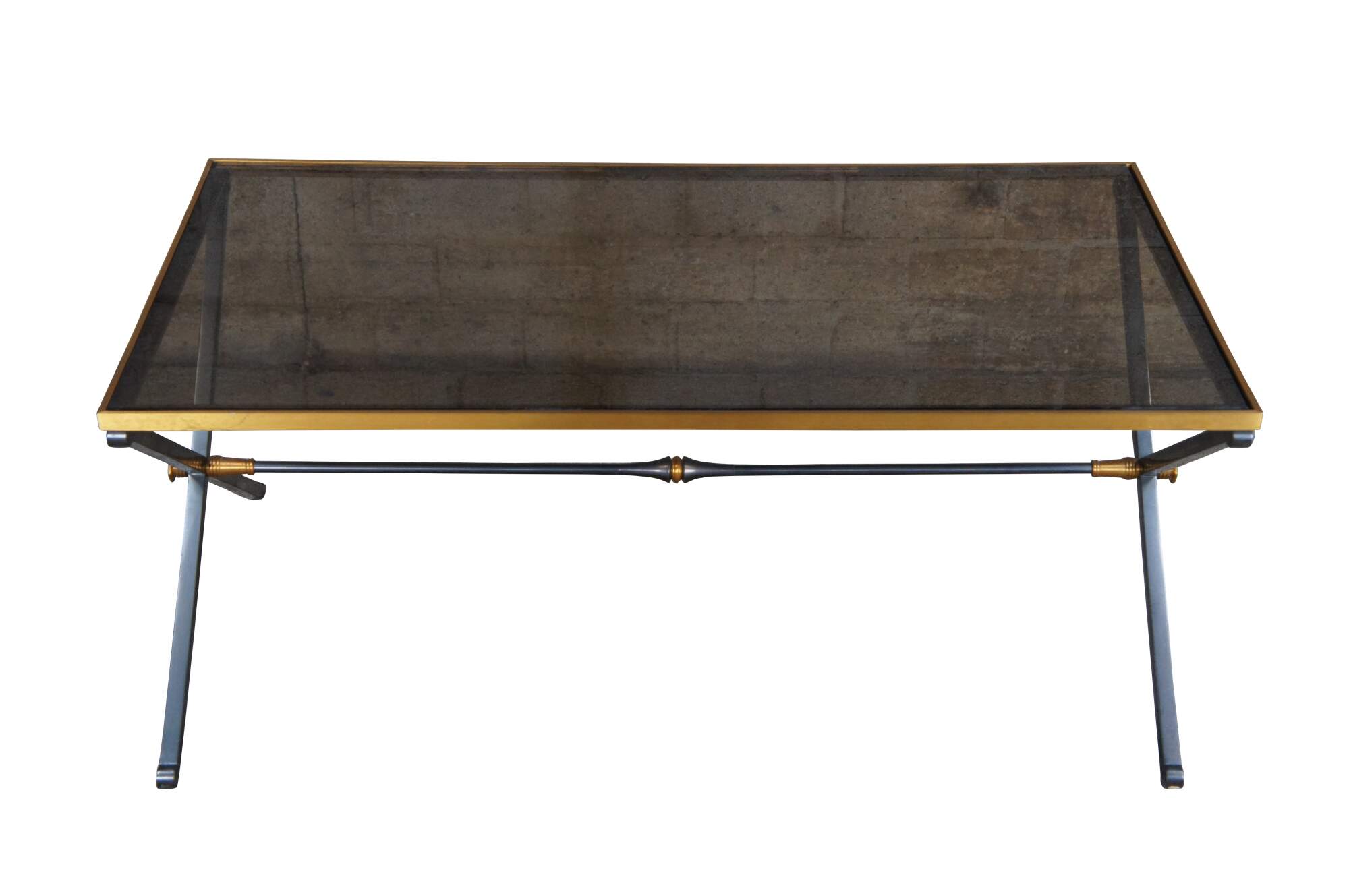 Maison Jansen style modern cocktail table. Made from steel with a black and gold X form base with smoked glass polished edge top. The X frame is connected by cylindrical trestle flared like a trumpet at the center.