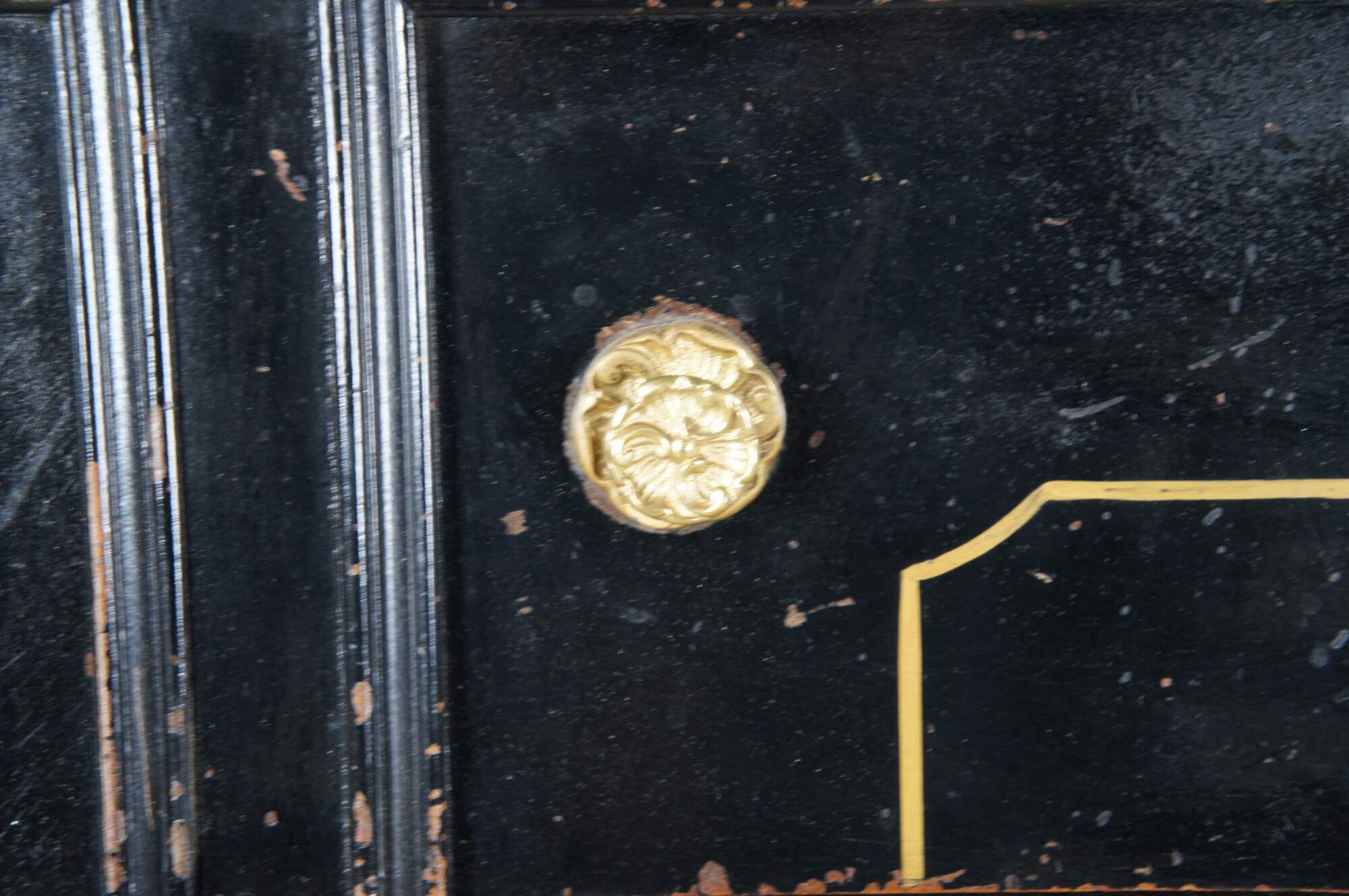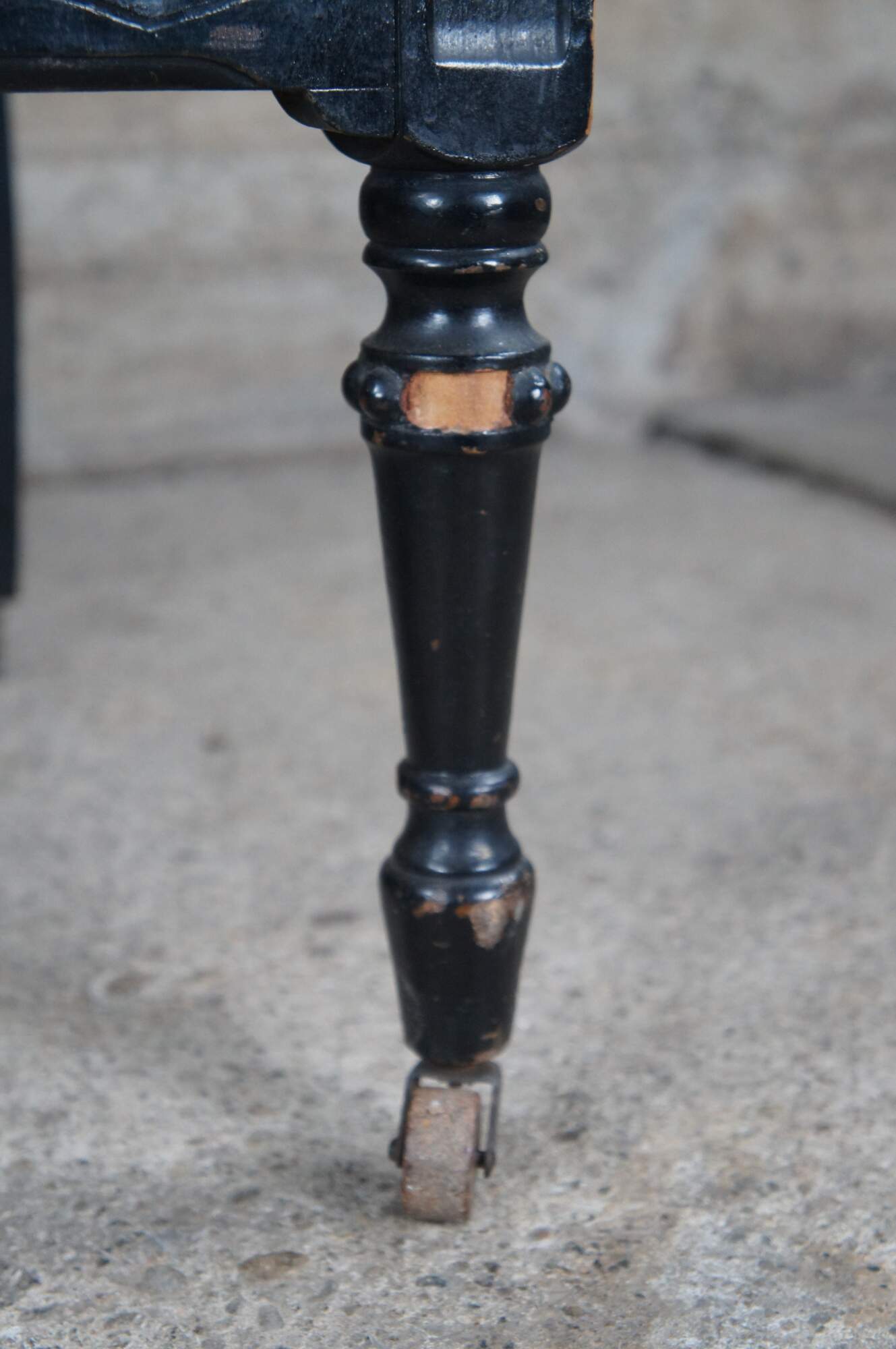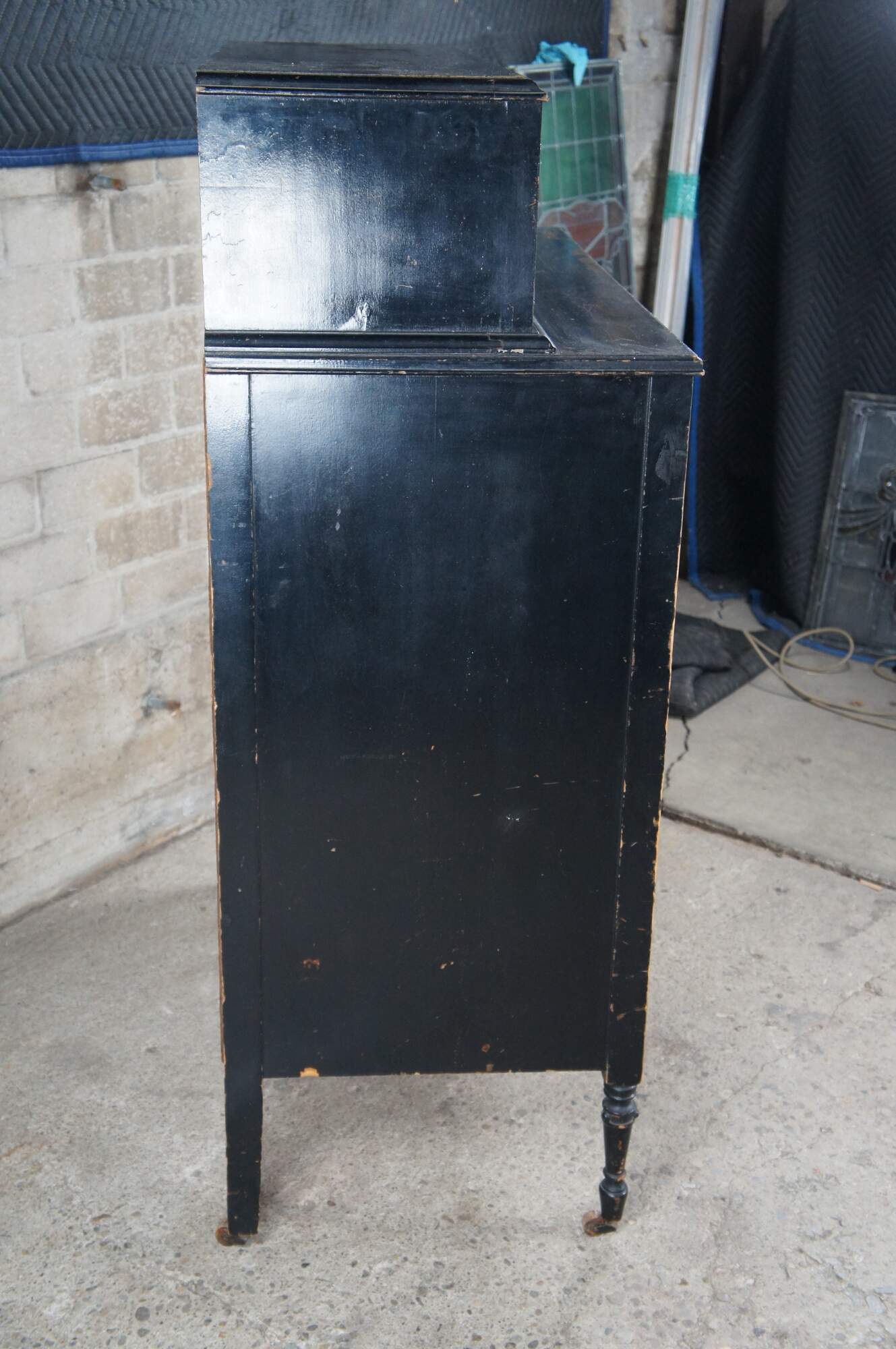 Late Victorian style mahogany painted tall boy chest. Finished in black with gold painted accents. Features four dovetailed drawers and a stepback top with two smaller central drawers flanked by outer cabinets. The drawers / cabinets have gold finished metal pulls. The cabinet is supported by turned beaded legs with castors.