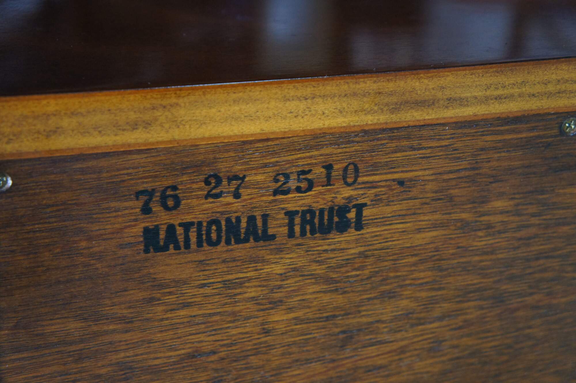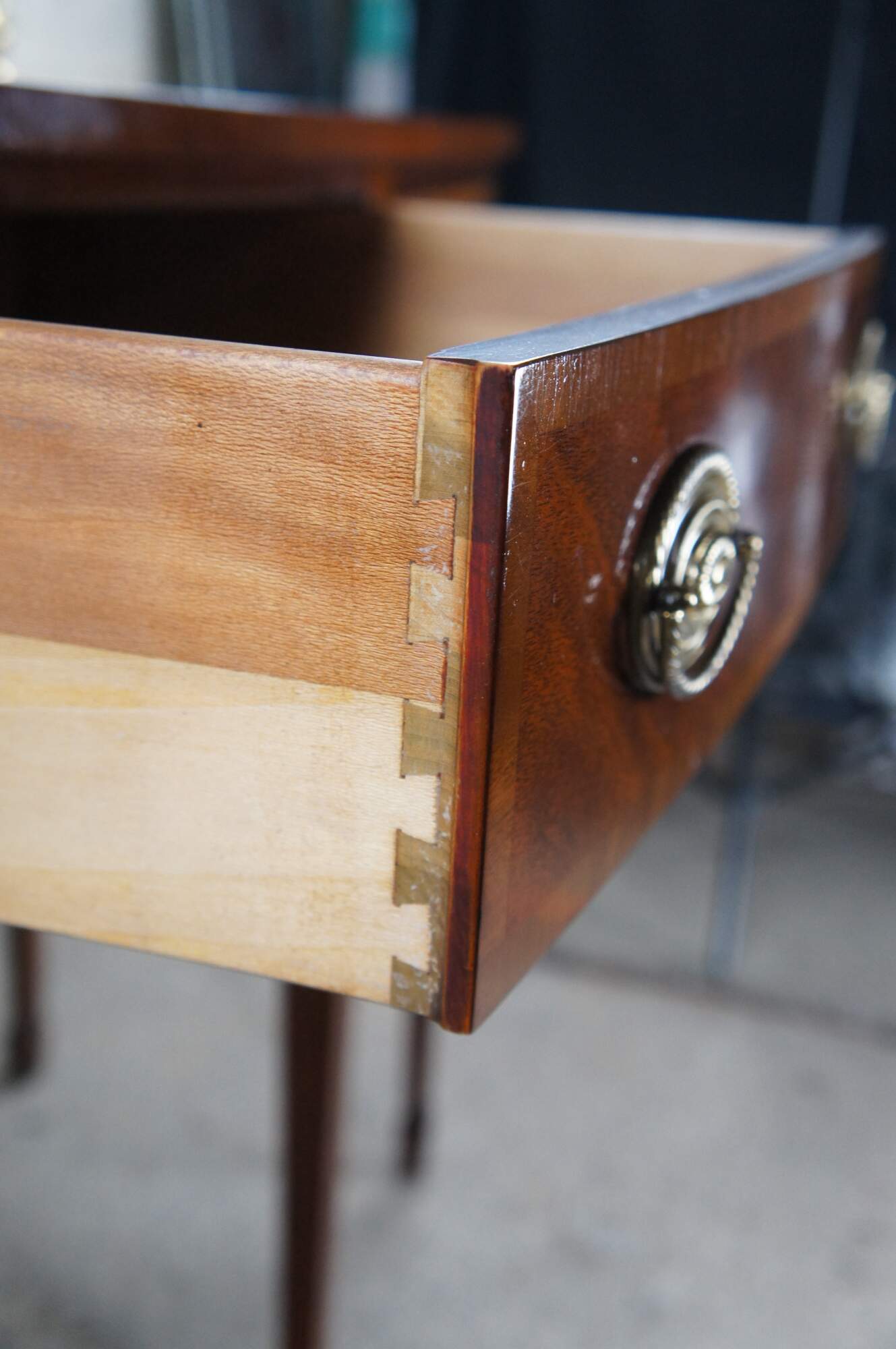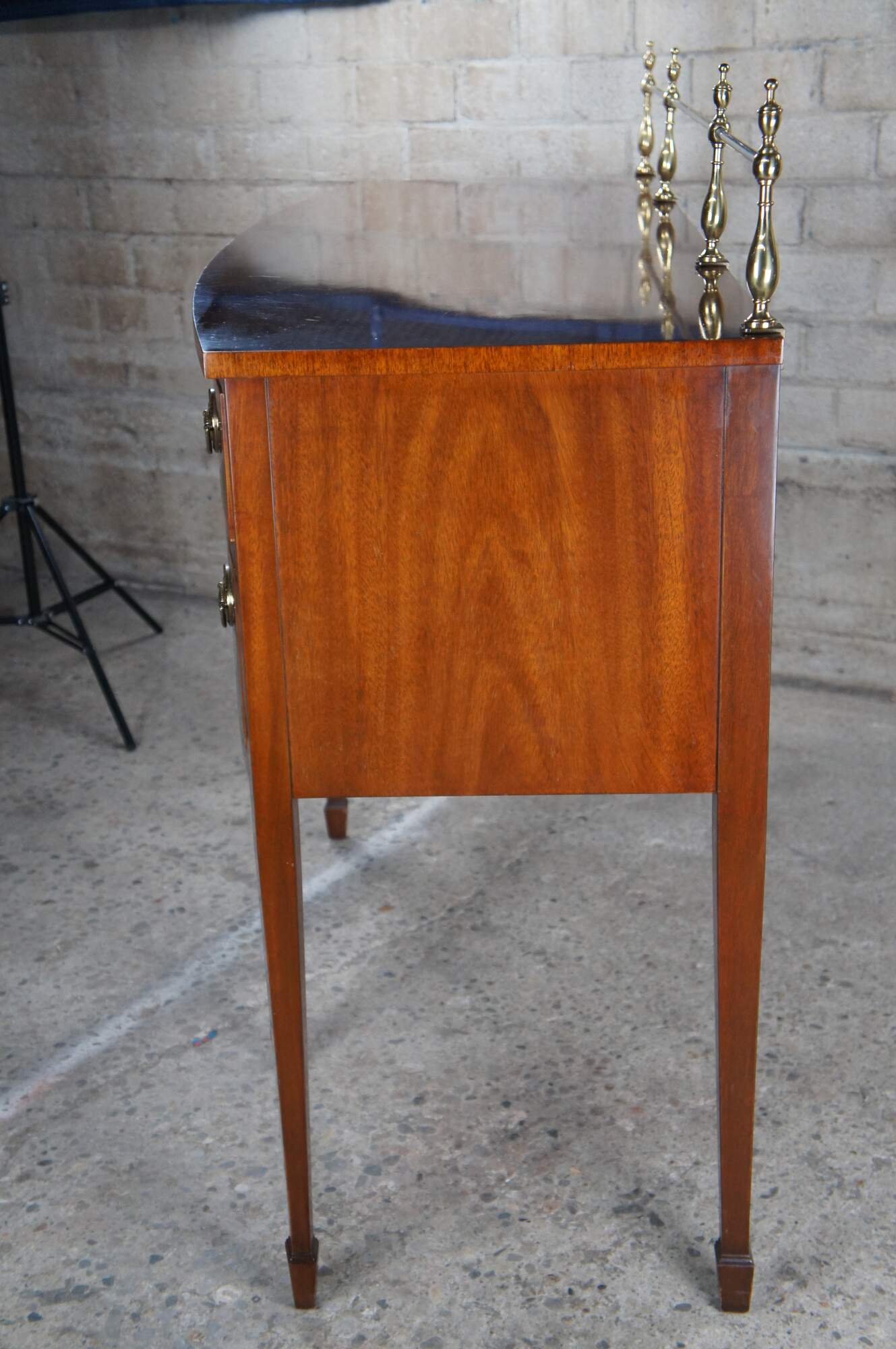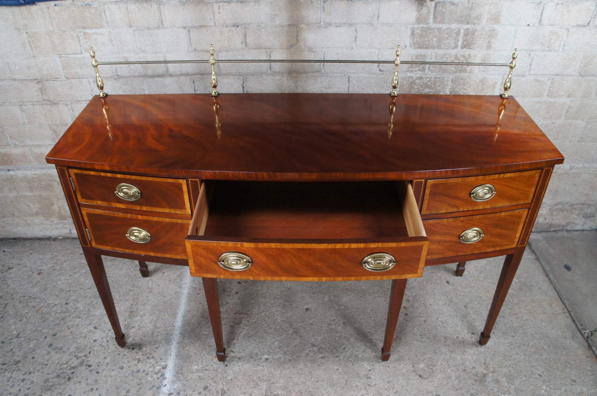An impressive vintage Kindel Furniture sideboard, circa 1970s. Features a mahogany frame with bowfront, serpentine front, crossbanding, inlay and brass gallery. Includes five dovetailed drawers with oval brass Sheraton / Federal style drawer pulls. The sideboard is supported by square tapered legs leading to spade feet. Marked along inside of the center drawer