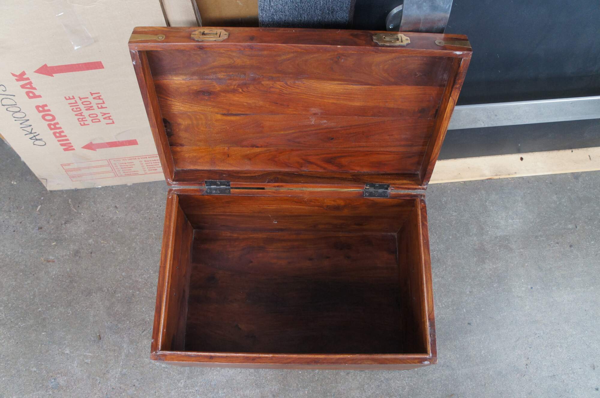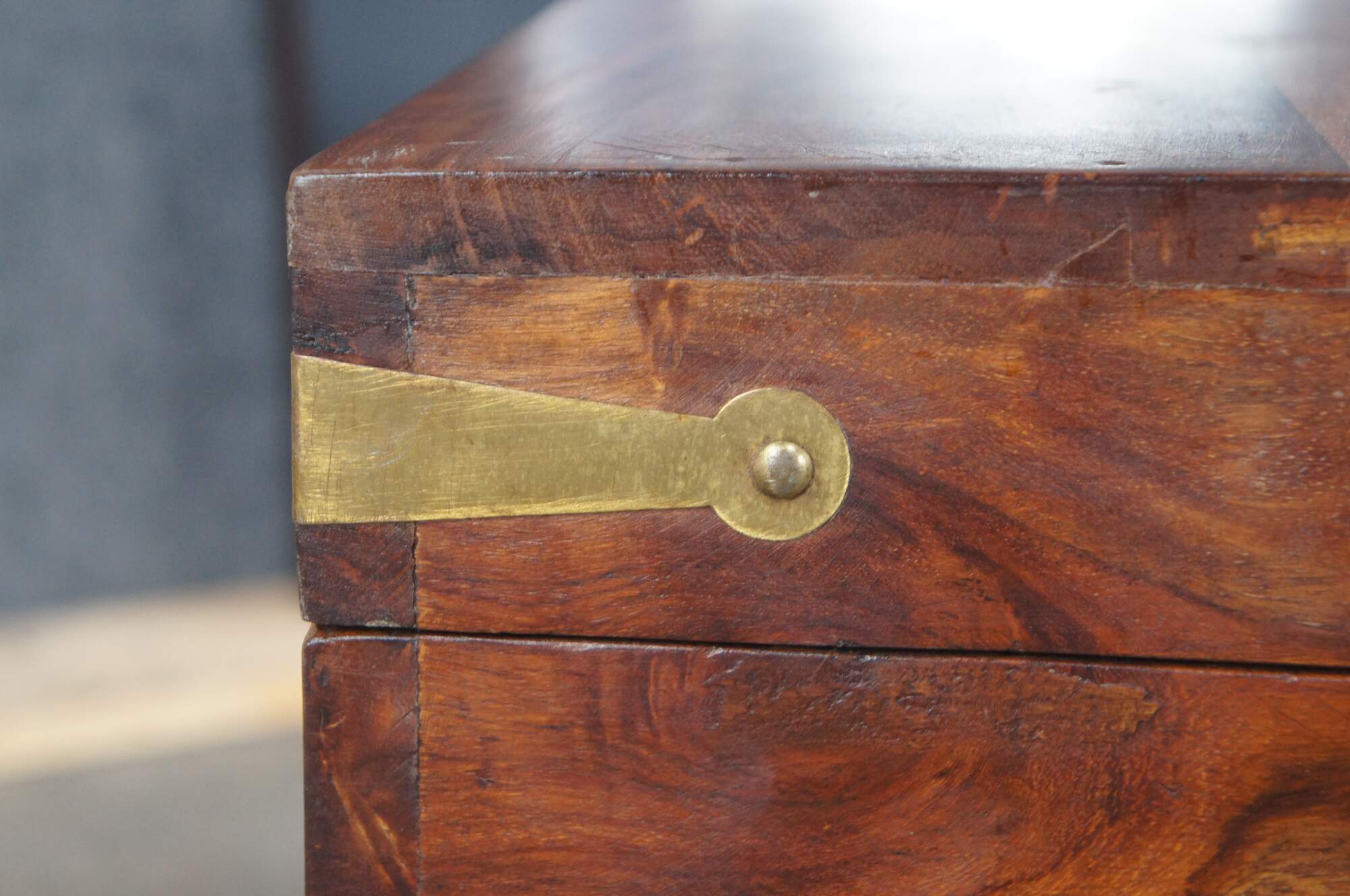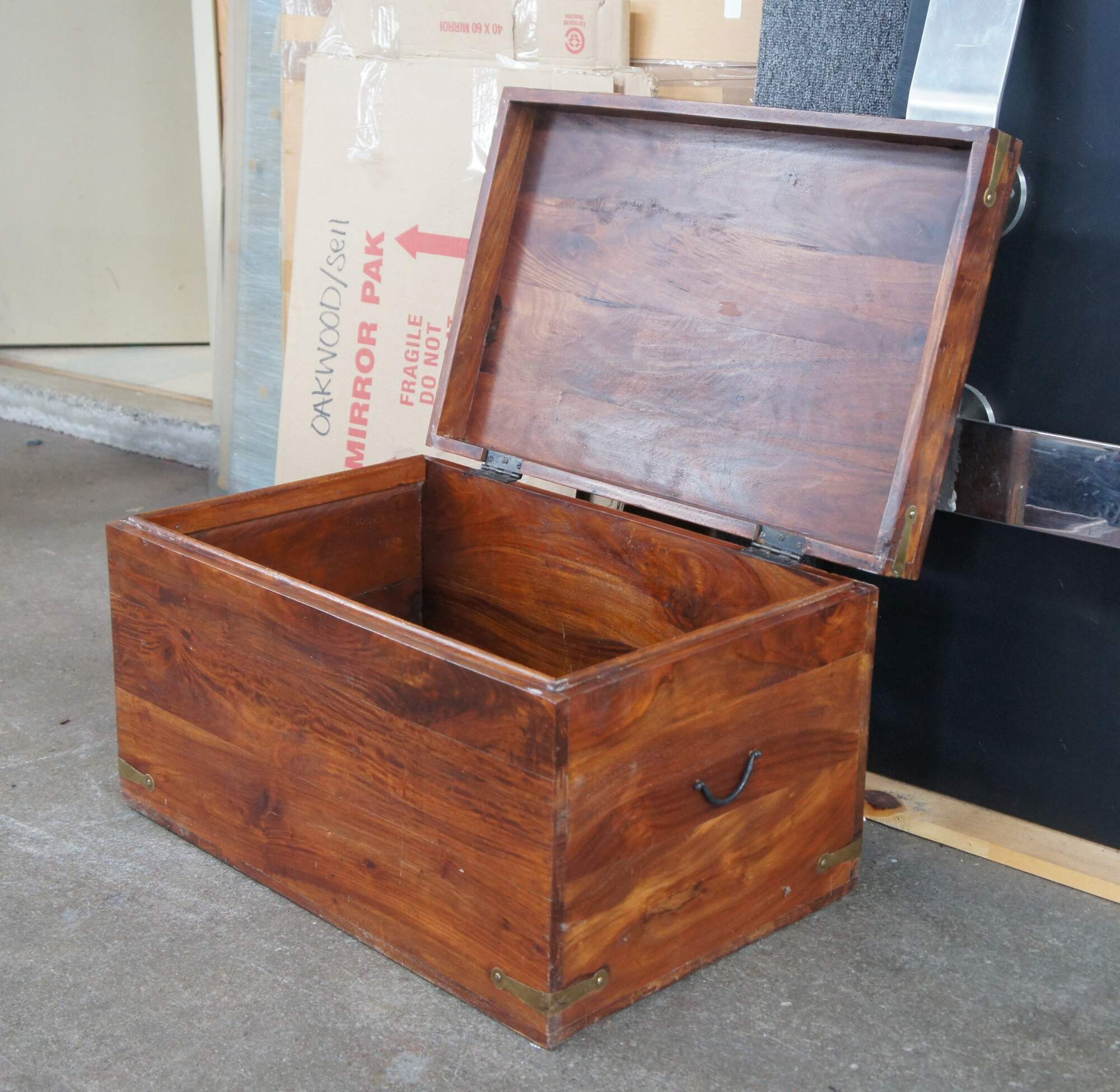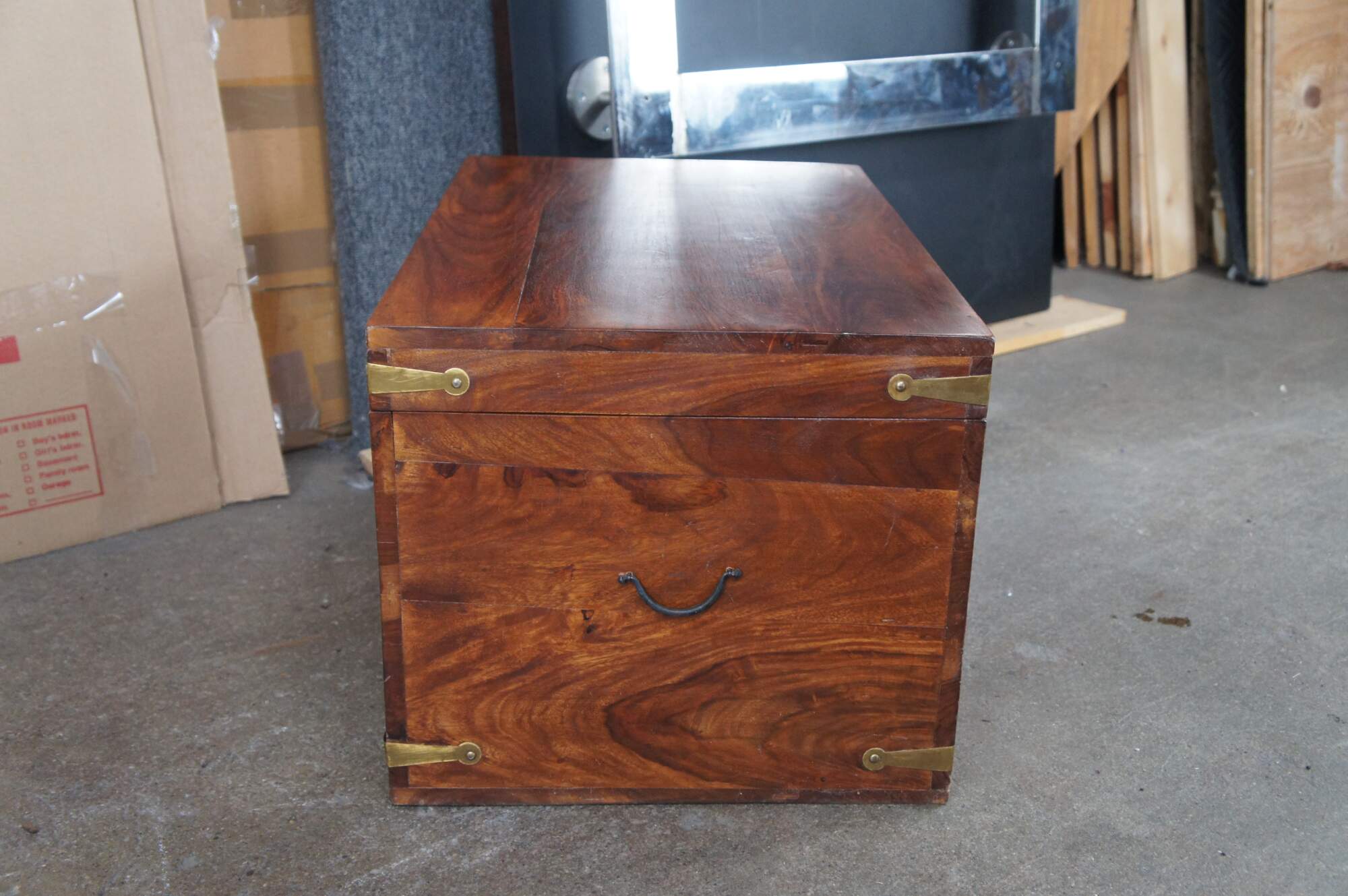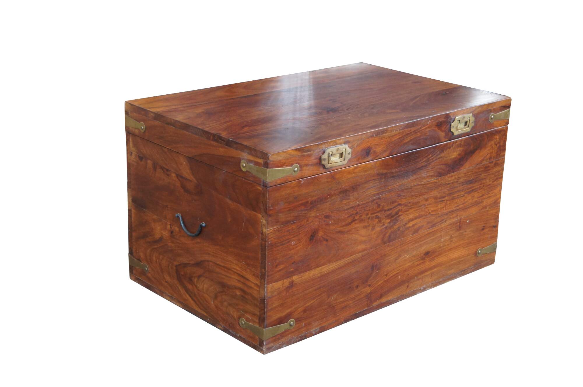 Late 20th century campaign style camphor chest. Features a rectangular frame with brass banded hand hardware and traditional campaign / anglo indian recessed pulls along the front.